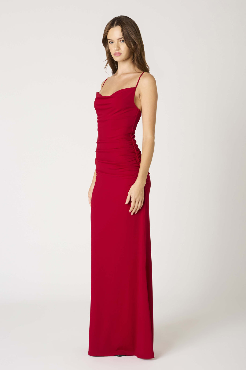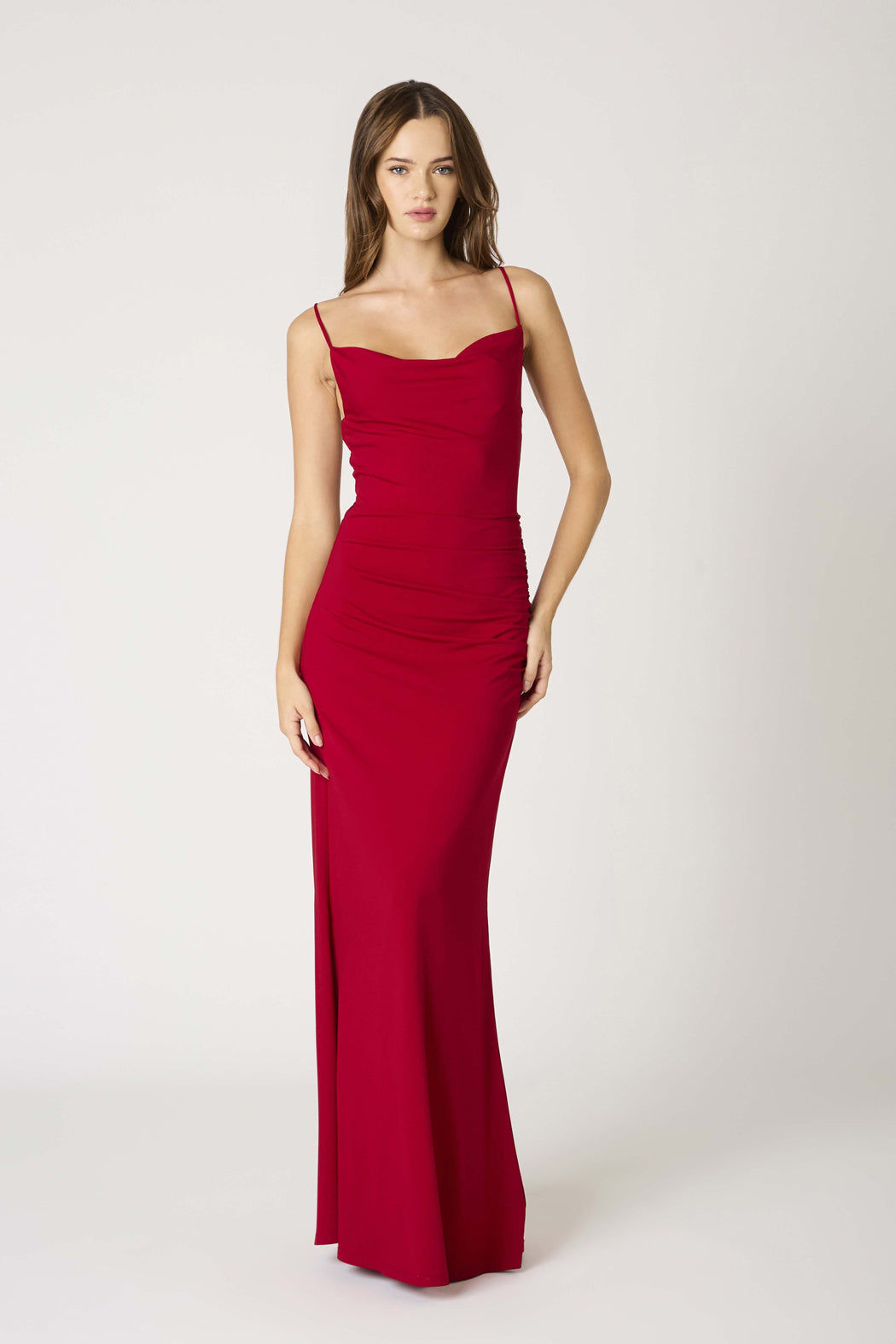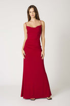 This cowl neck spaghetti straps maxi dress in a bold crimson hugs your figure and gentle cascades away from the body at mid thigh. Perfect for your next wedding, event, or formal dance. Follow @lunaboutiquecanton on instagram and DM us with any questions :)
