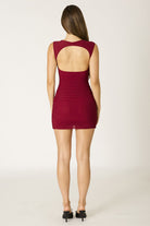 Made from a deep crimson ruched stretch mesh, the Sultra mini dress features a bodycon fit with a sweetheart neckline, wide shoulder straps, and an open back cutout.