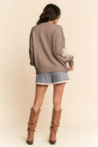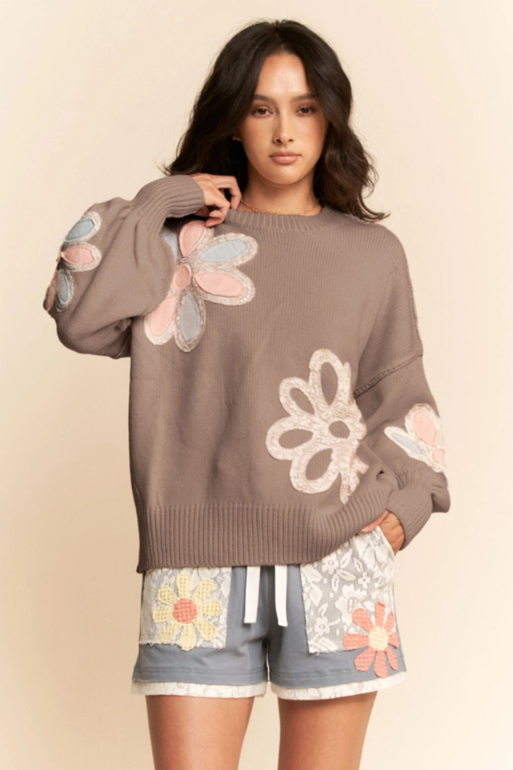 Lace floral details really pop on this beautiful knit sweater. Keep the chill away in style! This sweater as a slightly oversized fit, but is nice and comfy! Pairs adorable with our pink jogger pant or a cute pair of jeans.