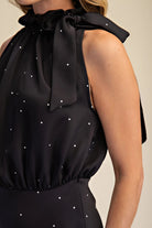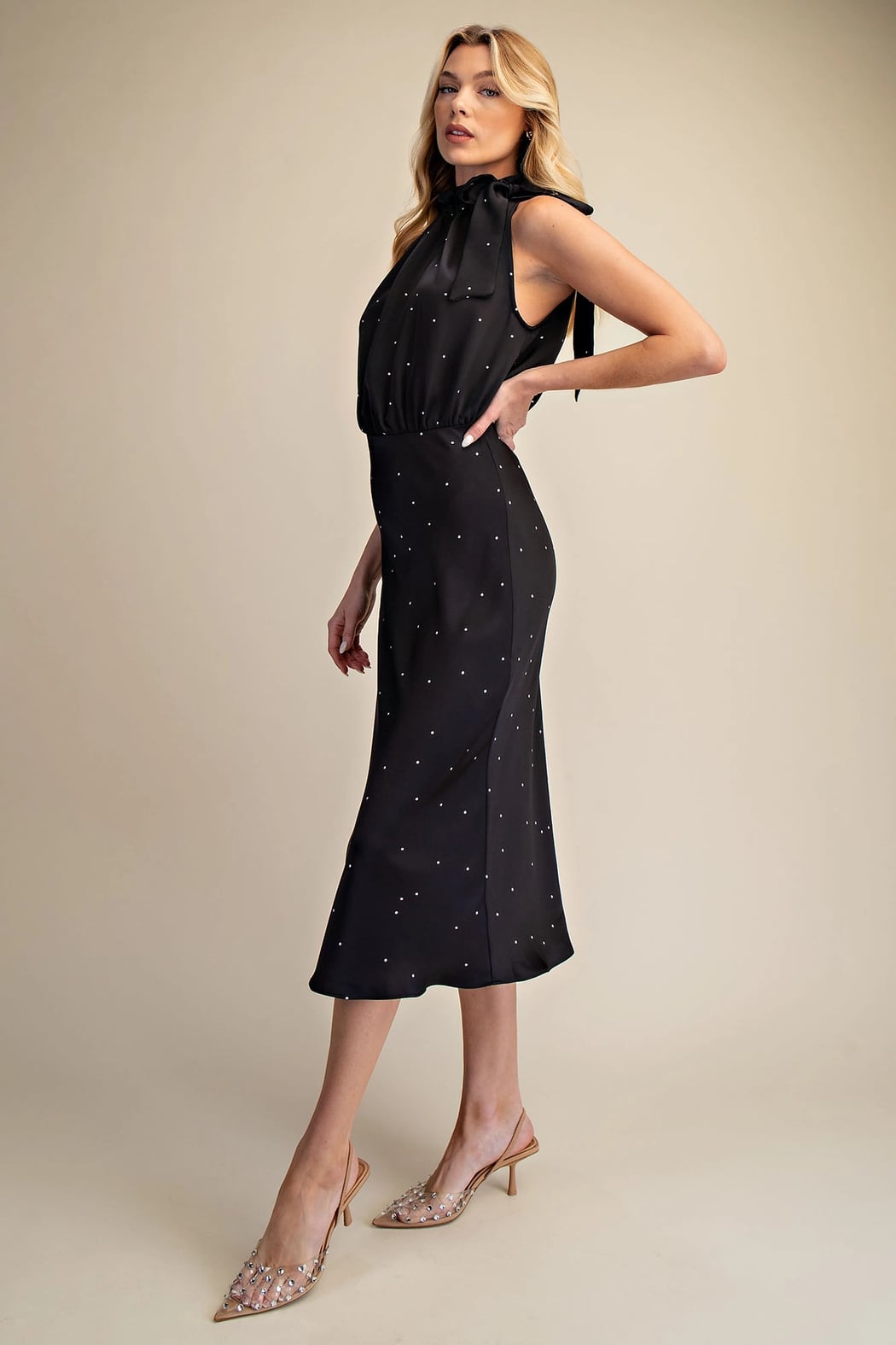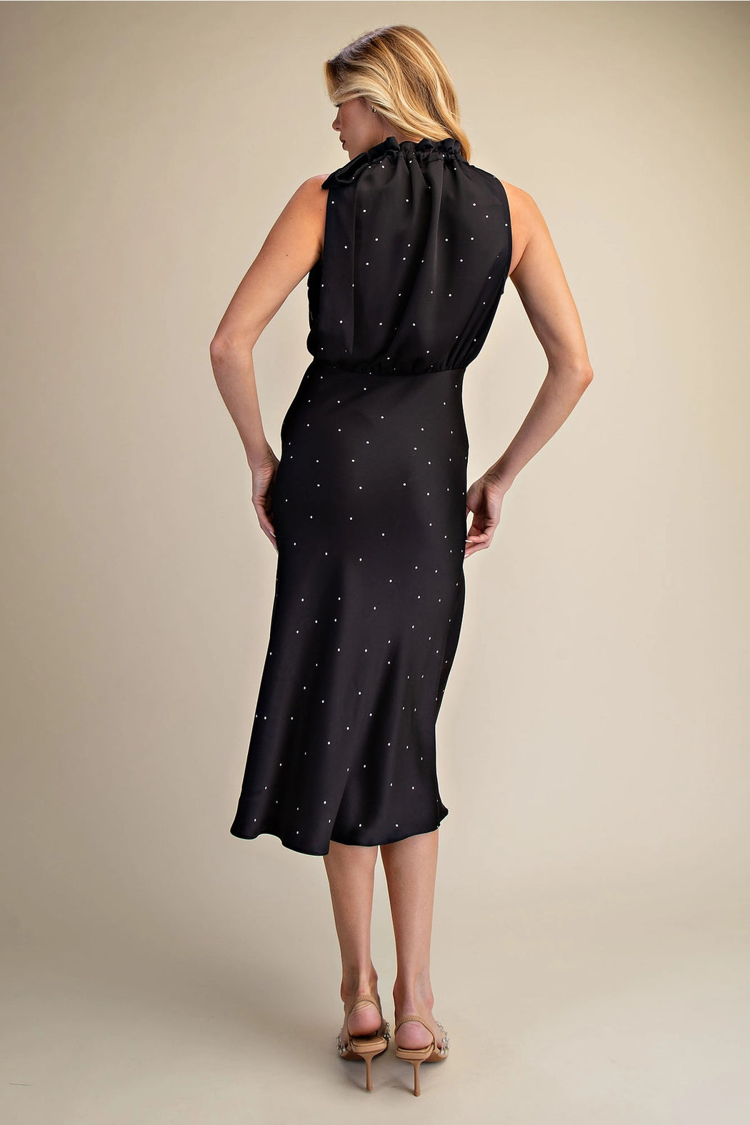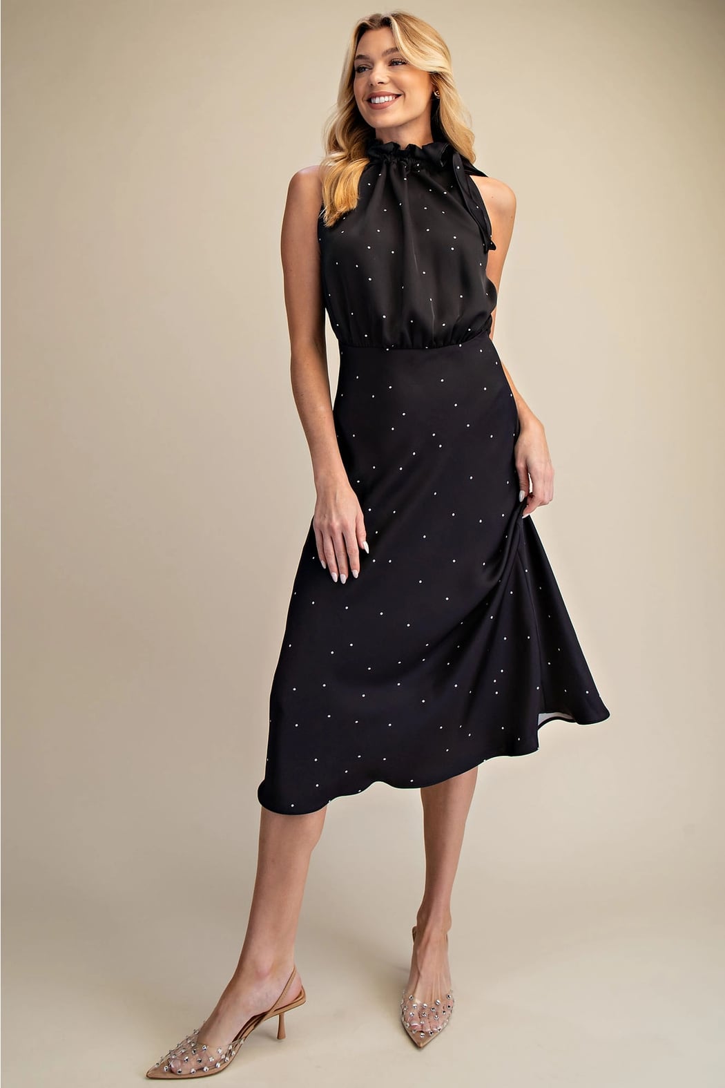 A polished polka-dot midi with a ruffled high neckline and tie shoulder detail, the Little Dots Ruffle Tie Dress skims the body in a fluid silhouette. Glam designed this sleeveless dress in a soft, drapey fabric with subtle dot embellishments for refined texture. Wear it for cocktail hours or wedding guest occasions when you want a classic, romantic look.