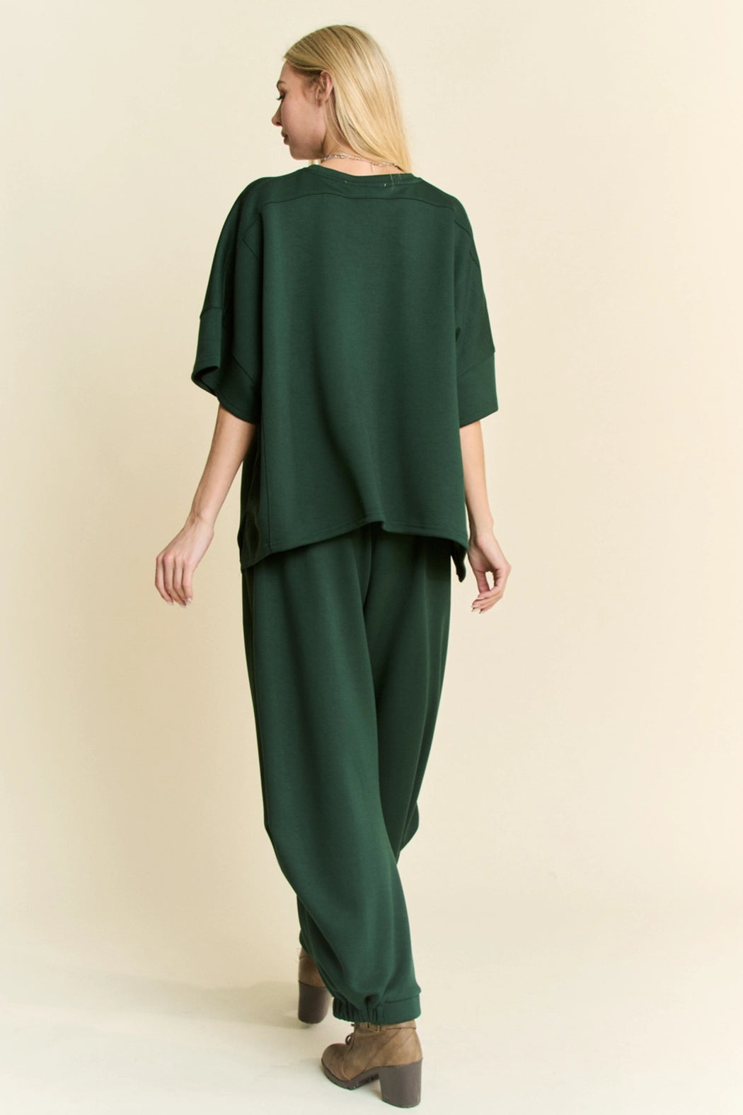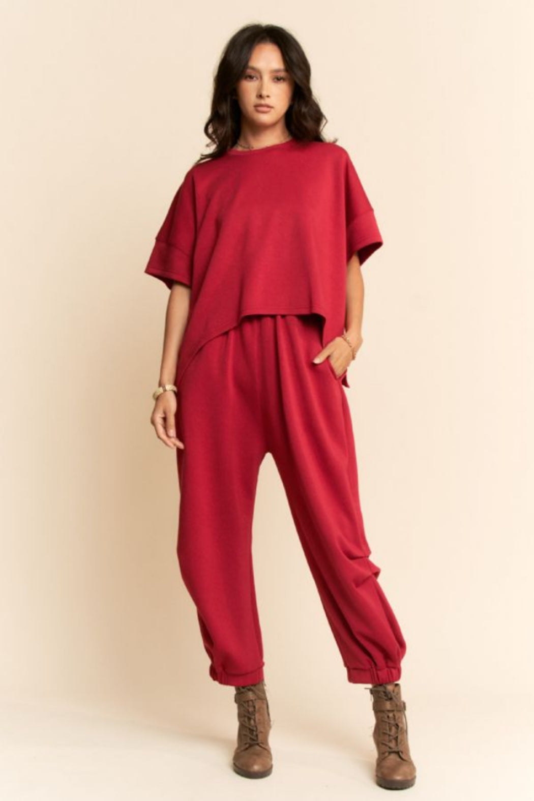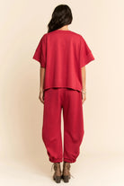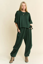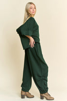 We love a matching set and this is the perfect transition to fall option! Perfectly comfortable with a solid round neck dropped shoulder loose fit flowy top and an elastic waist banded hem semi-harem. A beautiful hunter green color, throw this matching set on and seize the day! RED WILL BE IN STOCK SOON