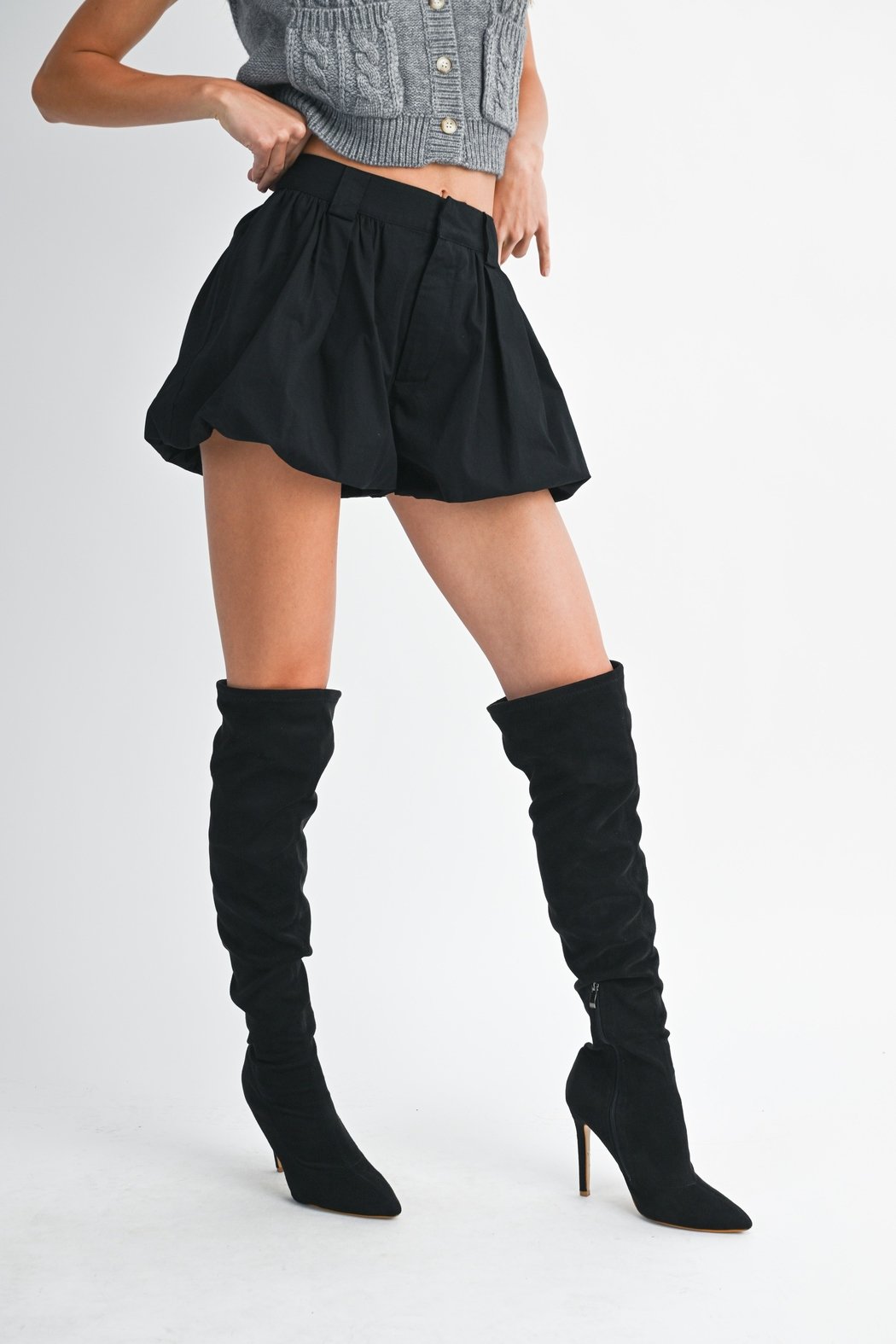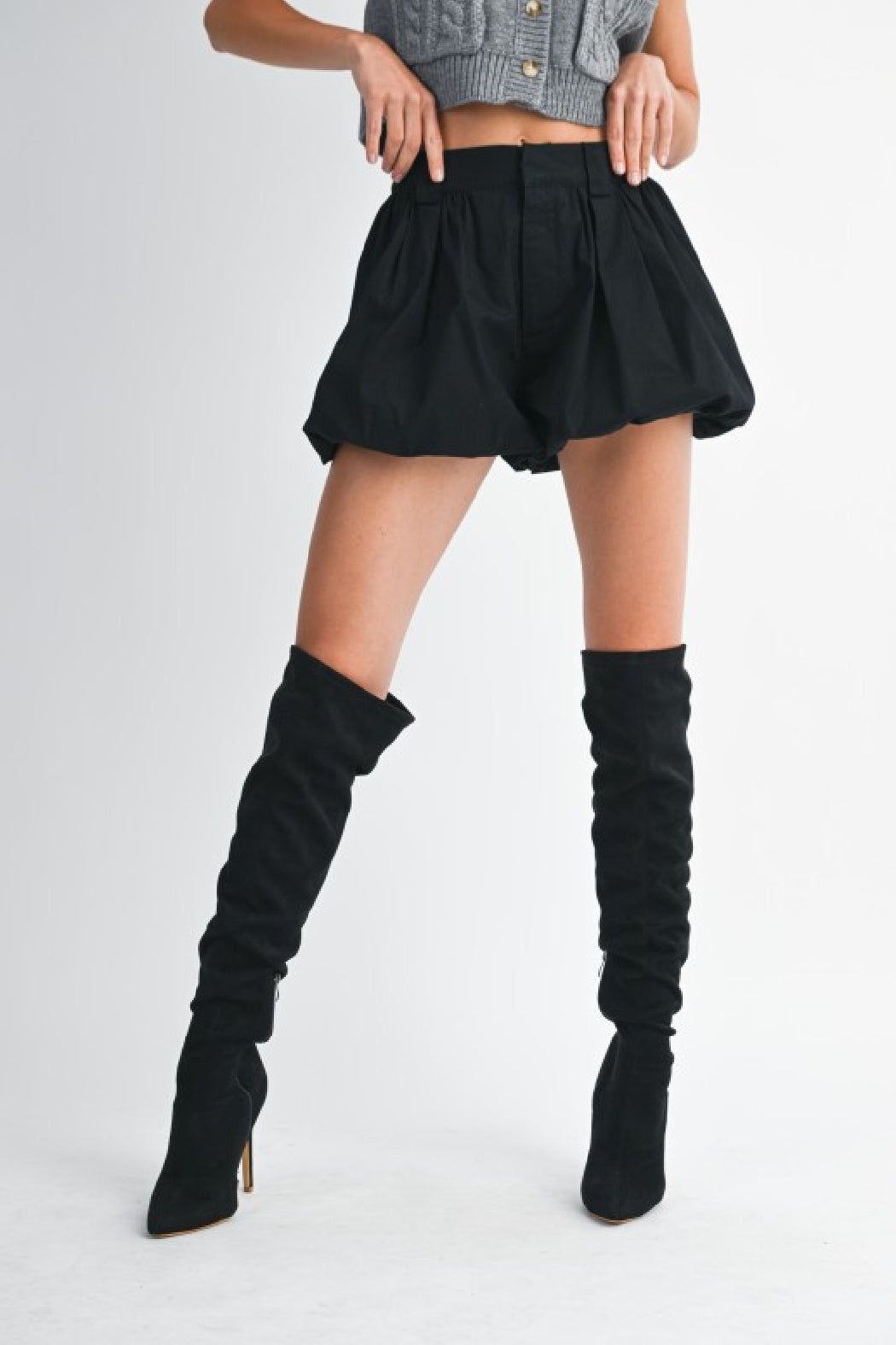 Solid bubble hem shorts with back elastic waistband and front hook and eye and zipper front detail.