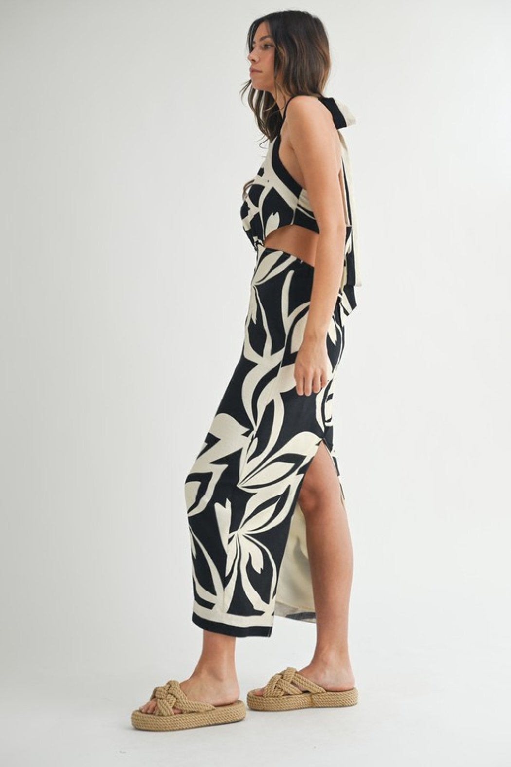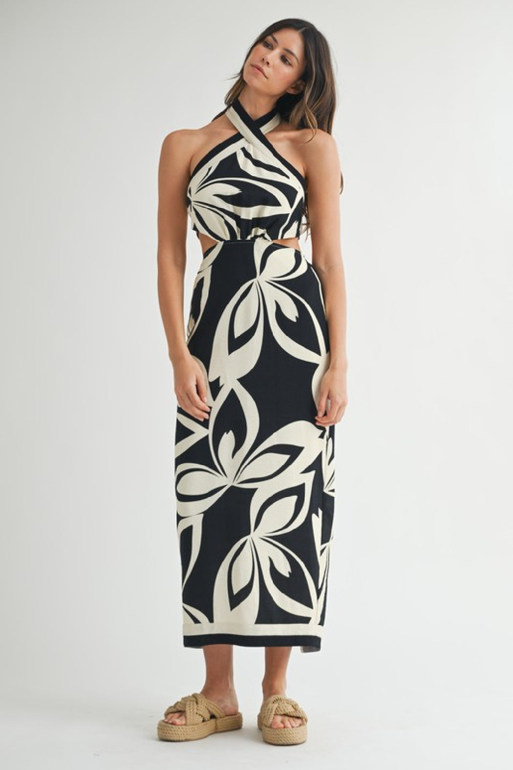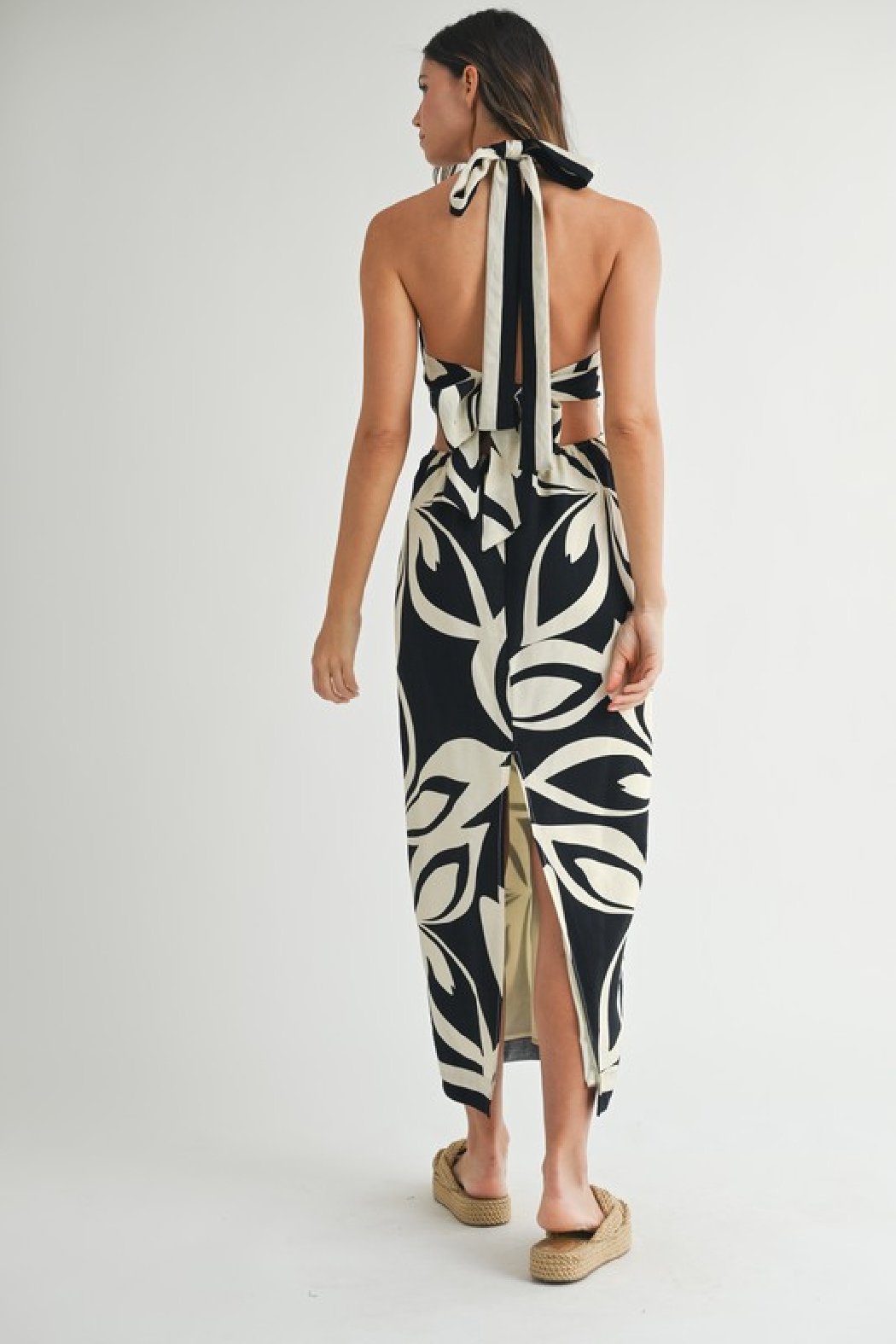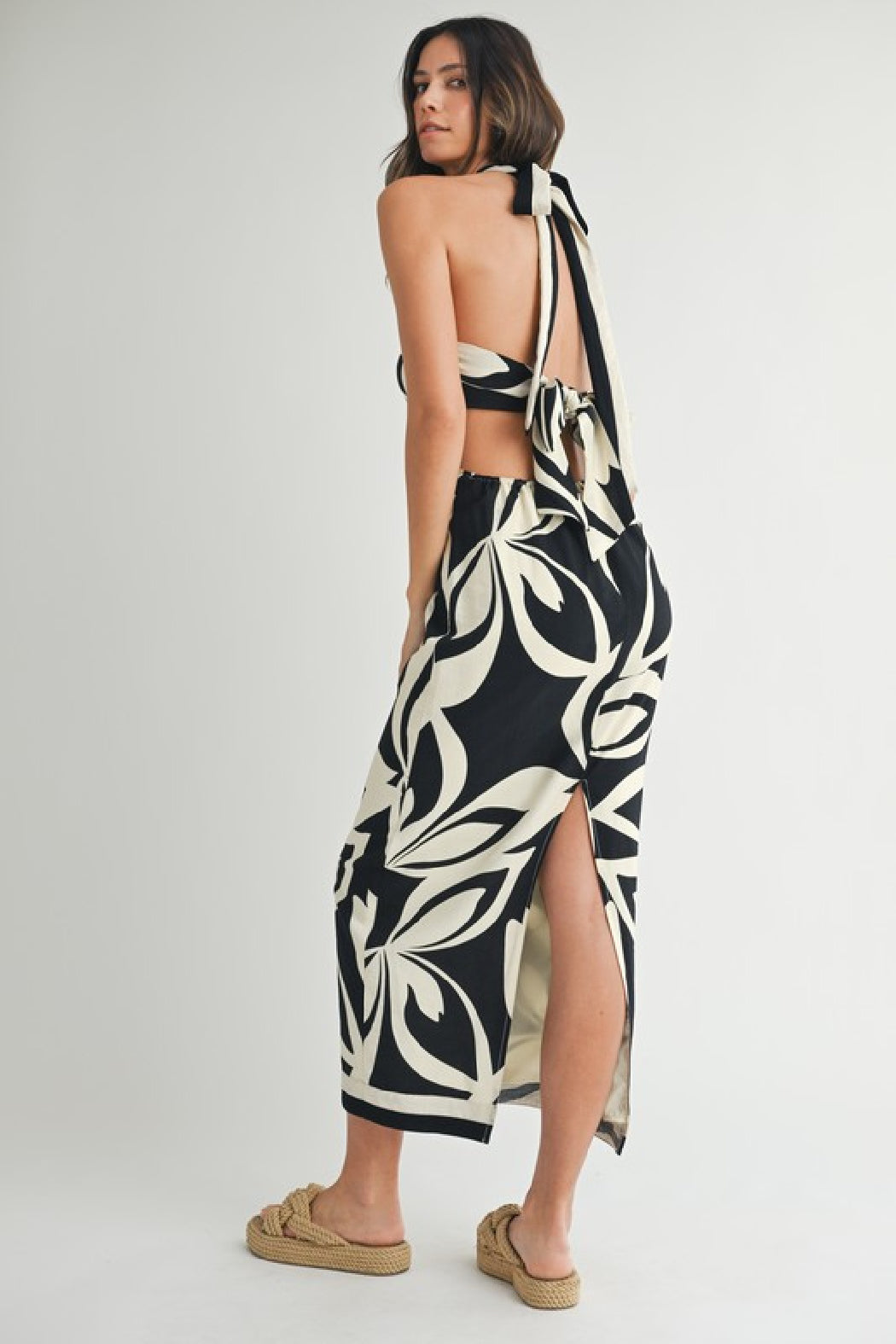 Placement tropical print criss cross halter neckline open back midi dress with back self tie detail. Side invisible zipper. Back slit. Lining.
