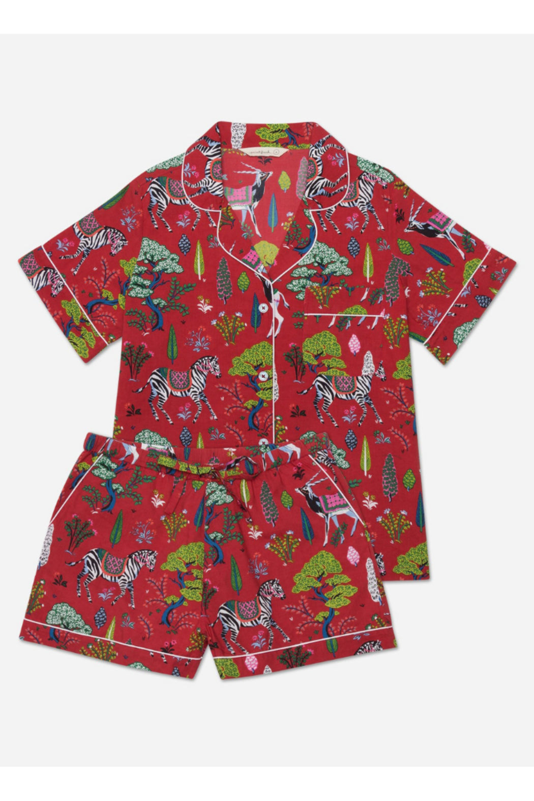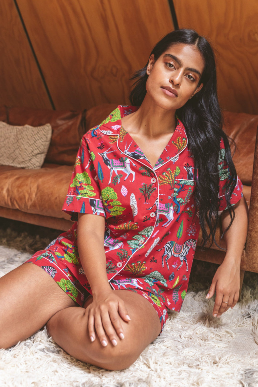 Treat yourself to a comfortable and luxurious sleepwear set that you can wear all year round with an antelope and zebra printed short sleep set. Handcrafted from soft organic cotton that gets softer after every wash, you’ll never want to get dressed again once you’ve pulled on your favorite pair of pajamas. This matching short-sleeve shirt and shorts set in our new Antelope’s Forest print is ideal in any season, thanks to the lightweight and breathable fabric. Whether you’re curling up with a gripping book under a cozy blanket during the winter months or lounging on your porch with an ice-cold glass of your favorite drink on a warm summer’s day, you’ll feel rested and rejuvenated in this comfy loungewear. The Details: 2 ¼ inch inseam Mid-rise with elastic waistband, drawstring and pockets 100% GOTS-certified organic cotton poplin with contrast piping details Wash on delicate cycle and tumble dry low heat The Antelope’s Forest print comes in two color options–Ruby, an eye-catching red with highlights of pink, green, and white, and Emerald, a vibrant green that instantly transports you to the fantastical forest home of the striking Indian antelope and gregarious zebra. Paired together, the Ruby and Emerald designs give a playful nod to bright holiday hues that you can bask in all year round.