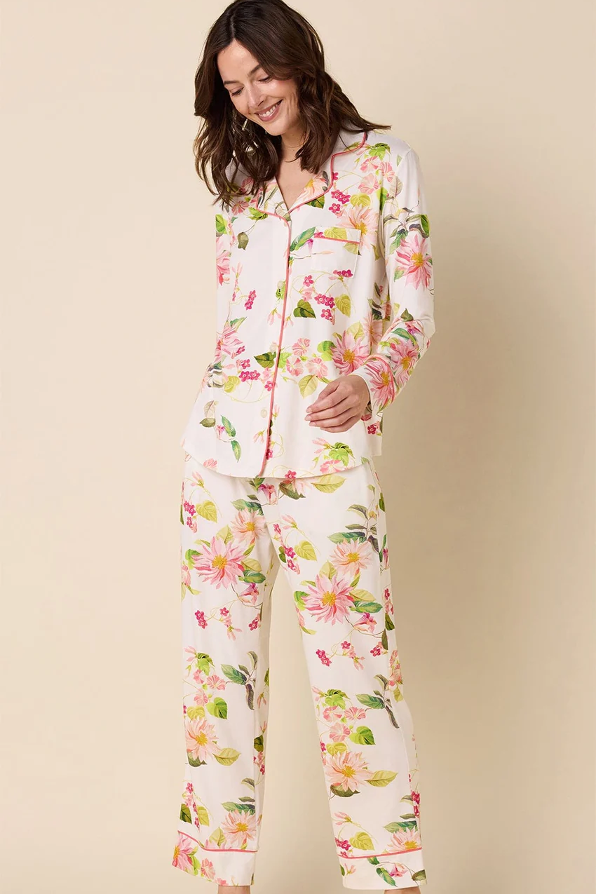 We searched the globe for the perfect knit fabric for our pajamas. We started with hand pulled Peruvian Pima cotton, which is known for its silky luster and soft texture. We combined this Pima cotton with Modal to get the perfect drape and added Spandex to give it stretch and recovery so they look and feel great with every wear. These PJs are so luxuriously soft you'll never want to change out of them. 48% Pima Cotton, 48% Modal, 4% Spandex Contrast piping and drawstring Full length PJ pant with pockets Waist has 3/4 inch elastic in the back with a drawstring in the front Machine wash cold / tumble dry low / no bleach This pajama is pre-shrunk but will shrink another 5% when washed Made in Peru This pajama set has a snugger fit than our woven PJs. But the stretch gives it the perfect fit every time.