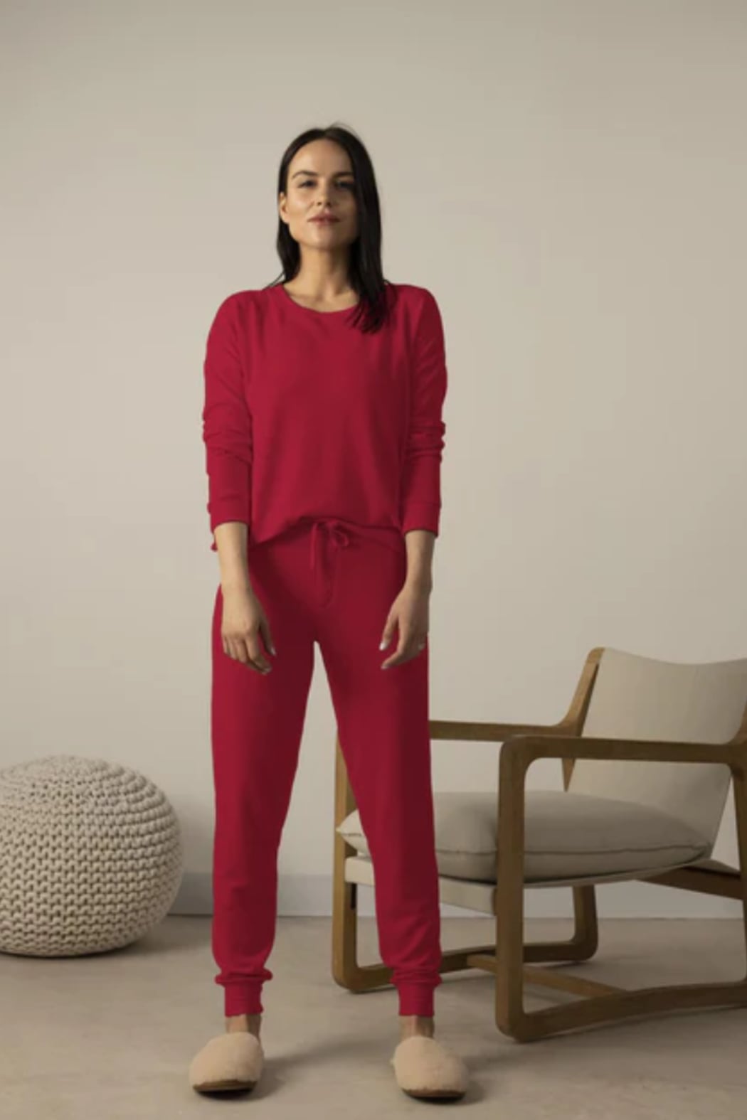 This cozy long sleeve top and jogger set is a relaxed two-piece made for lounging at home. The Aspen Dream set pairs a soft sweater-like long sleeve top with drawstring joggers and cuffed ankles for an easy silhouette. Lightweight yet warm fabric gives it a plush feel, perfect for lazy mornings or casual days in. Its simple, casual styling reads sporty and relaxed without fuss.