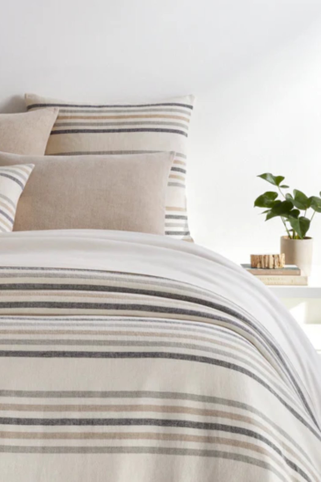Soft to the touch with a fantastic drape, our luxurious linen chenille duvet cover adds a modern graphic edge in Charcoal, Grey, and Natural stripes on Ivory. The subtle suede texture is woven from velvety chenille yarn in a fantastic blend of cotton for softness, linen for texture and strength, and viscose for a silky drape.