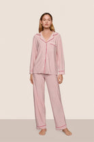The PJ that started it all. Made from TENCEL™ Modal fibers and a touch of elastane, this buttery soft fabric is verified by OEKO-TEX® Standard 100, meaning it’s dyed with safe and non-toxic dyes. This relaxed long sleeve set features contrast piping, a button-front top with a notch collar and functional pocket, and a low-rise straight leg pant with a thin elastic waistband. Pairs well with our everyday lingerie and blissful ZZZ’s. Fit & Care • 95% TENCEL™ Modal, 5% Spandex • Relaxed long sleeve and pant set • Button front top with notch collar and functional pocket • Low-rise straight leg pant with thin elastic waistband • Contrast piping • Machine wash cold; tumble dry low • Imported Measurements: • Inseam: XS-XL- 30 1/2" • Top length from high point of shoulder: XS- 25 1/2" S- 26" M- 26 1/2" L- 27" XL- 27 1/2" XXL - 28" • Front Pant Rise XS- 8 1/8" S- 8 5/8" M- 9 1/8" L- 9 5/8" XL- 10 1/8" XXL - 10 5/8"