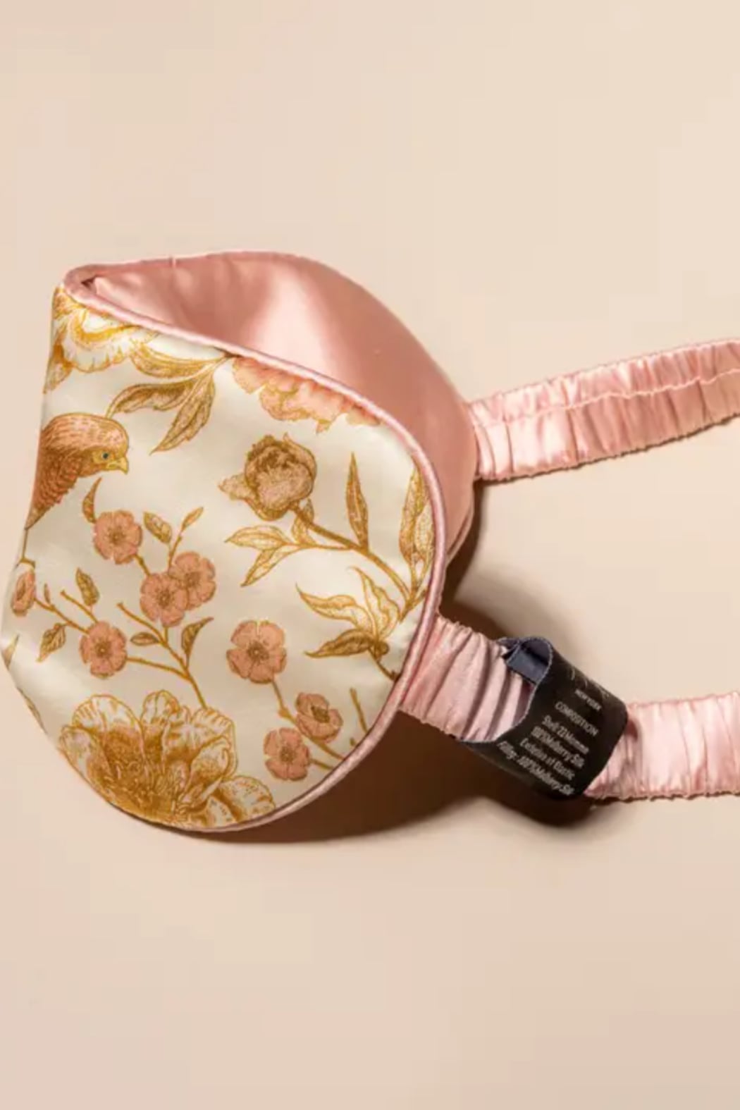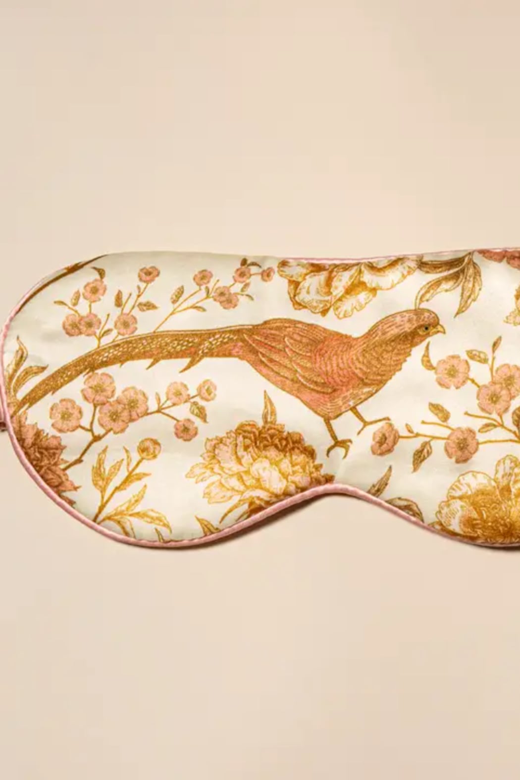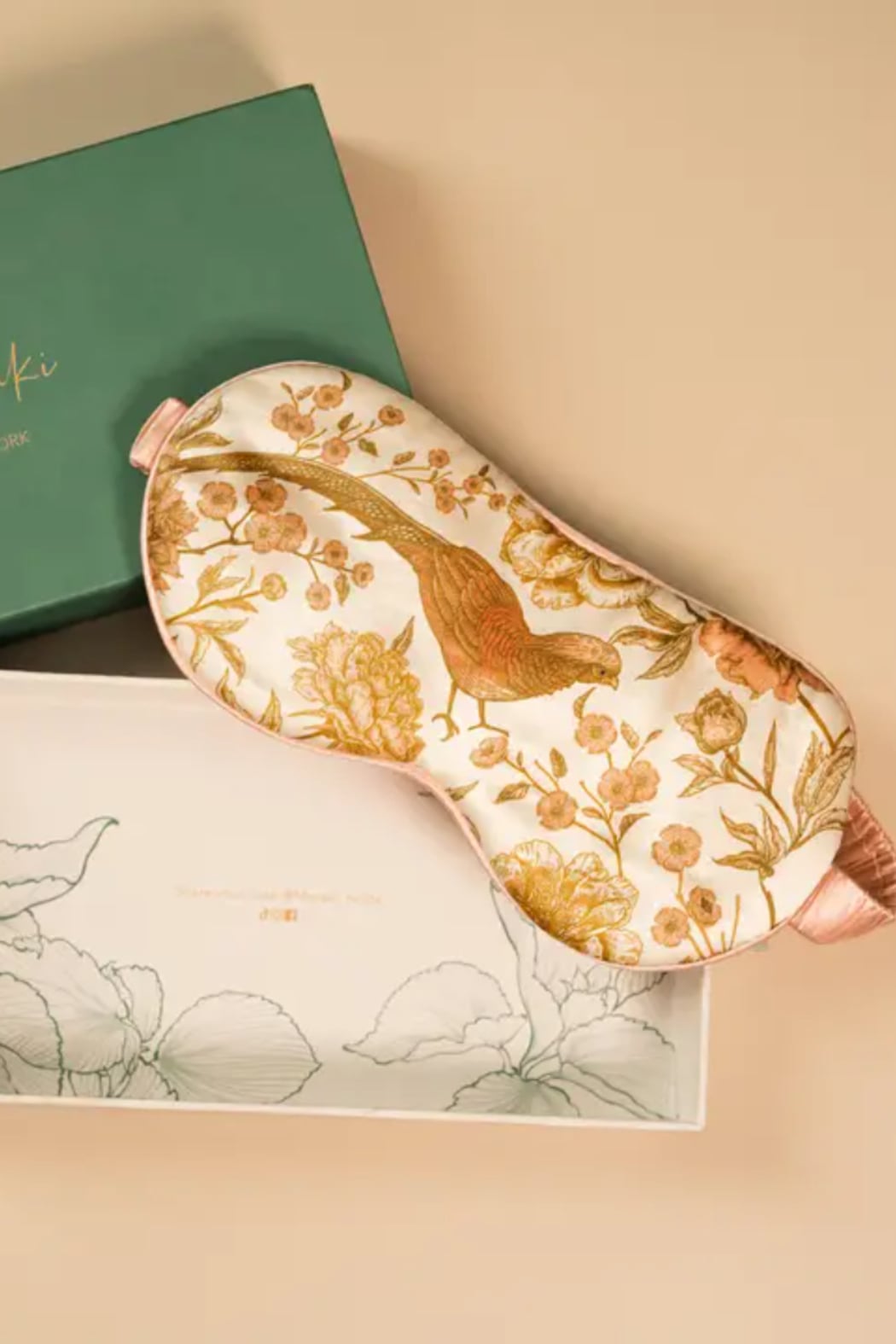 Sumptuously soft silk with a vintage-inspired gold parrot print, this Gold Parrot Printed Silk Eye Mask is made for restful travel and at-home relaxation. The Muraki eye mask has a smooth lining and an elasticized satin strap for a comfortable, light-blocking fit. Pack it for flights or bedside use to elevate your sleep routine with a touch of botanical elegance.