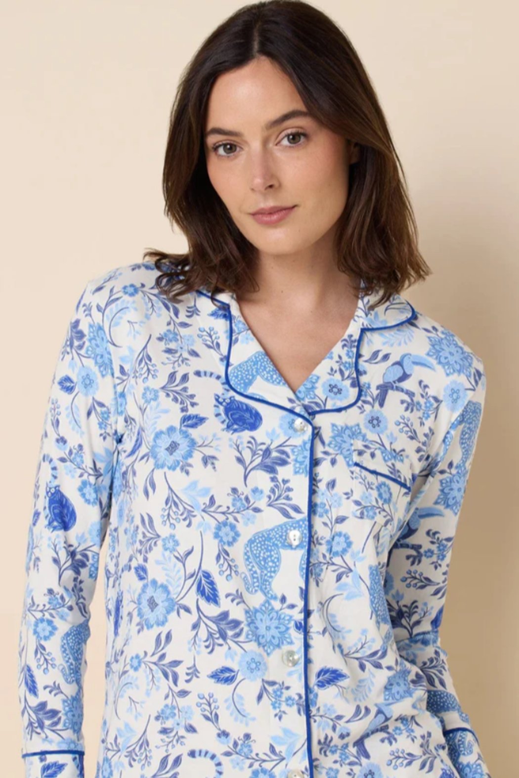 Long-sleeved button-down top with full-length pant with pockets