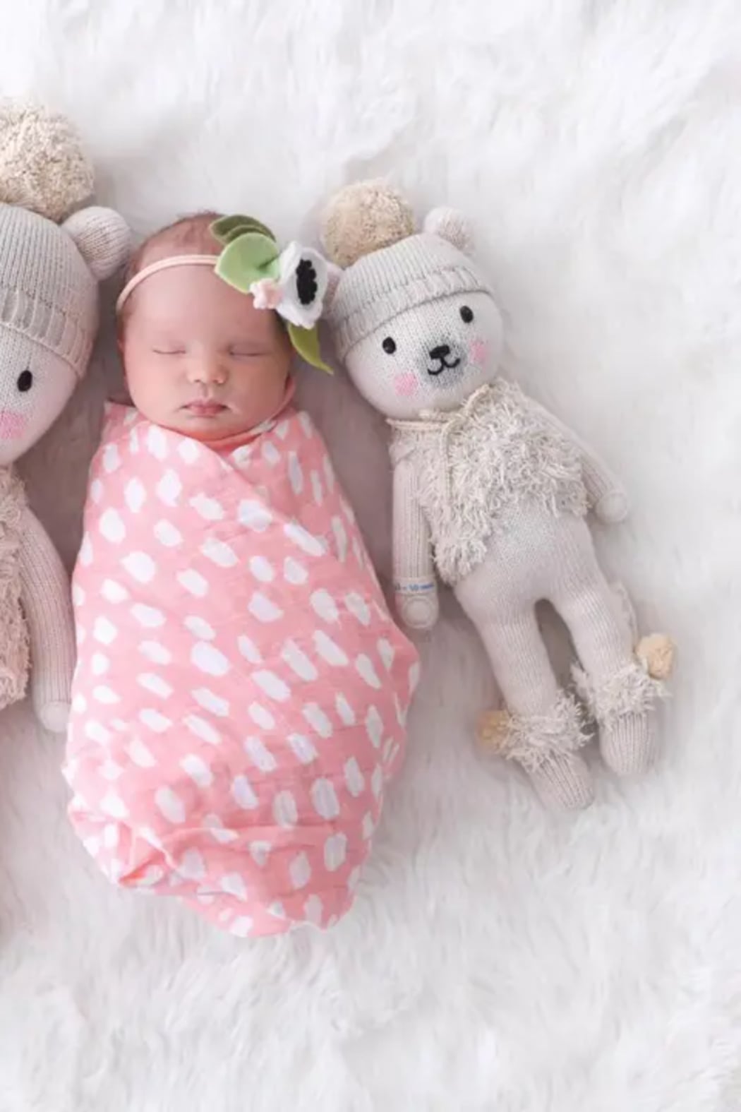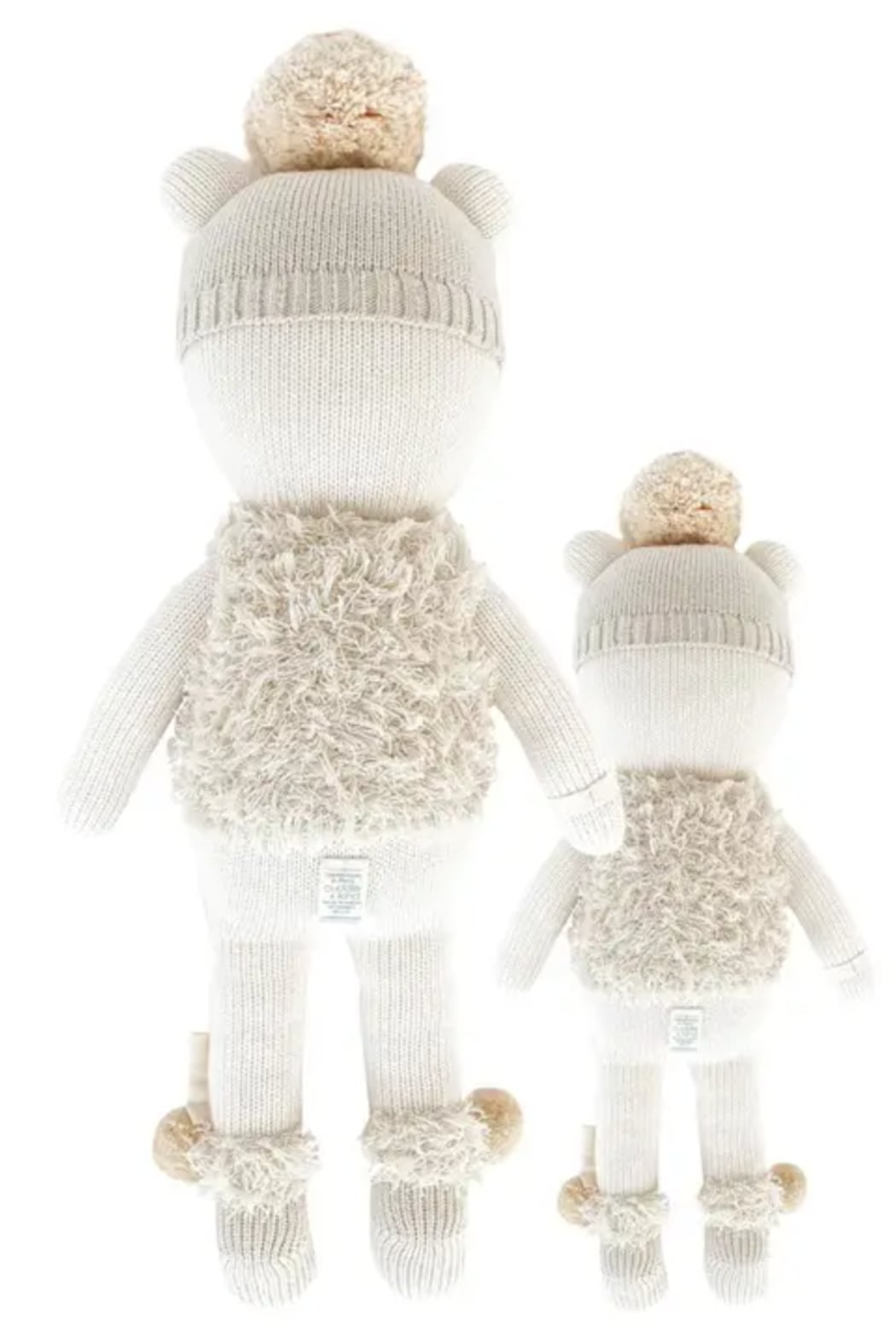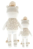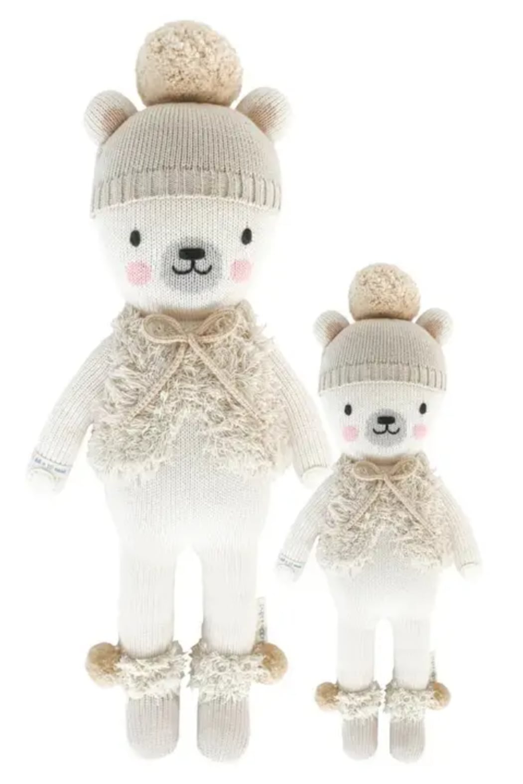 Softly knitted and sweetly styled, this Stella the Polar Bear stuffed doll is a 10" medium plush with cozy pom-pom hat and textured vest. The CUDDLE + KIND Stella the Polar Bear is hand-finished with embroidered features for a cuddly, nursery-friendly companion. Its neutral palette and soft knit construction make it ideal for comforting play and display from early infancy.