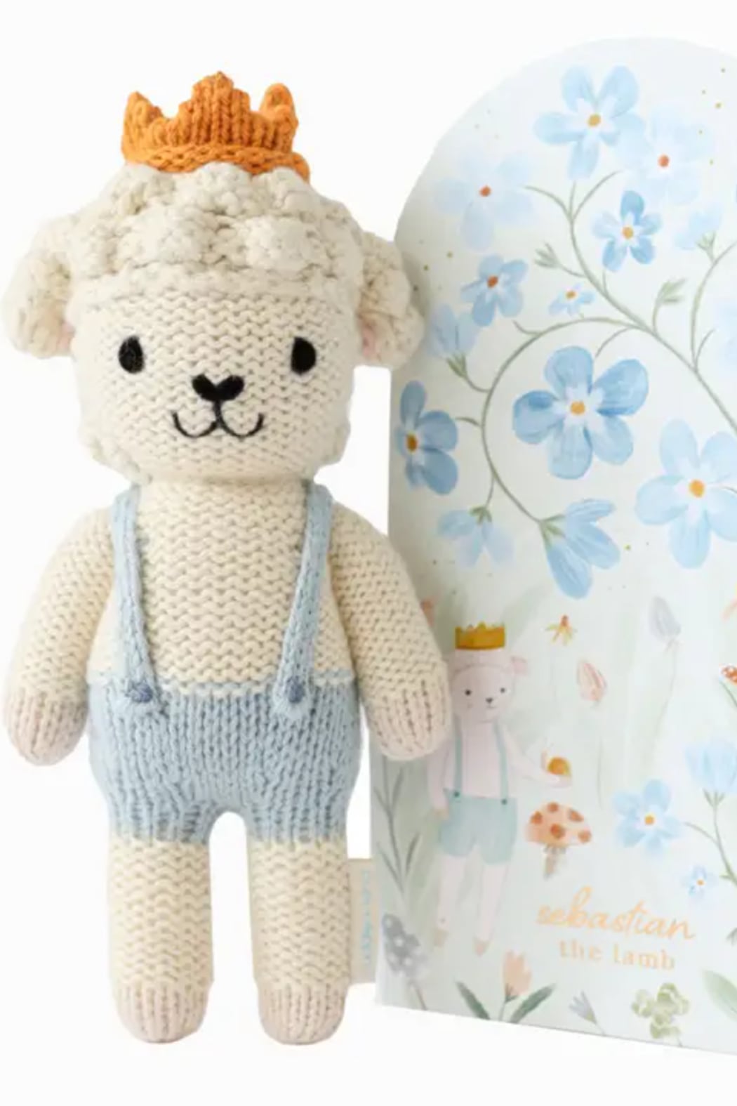 Tiny Sebastian is a hand-knit lamb plush with a tiny crown and soft knit overalls, sized for little hands. This cuddly stuffed animal is crafted in a textured yarn with embroidered facial details for safe, machine-washable play. CUDDLE + KIND designs this piece for everyday comfort and gifting, making it a charming newborn-friendly companion.