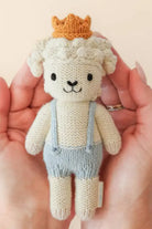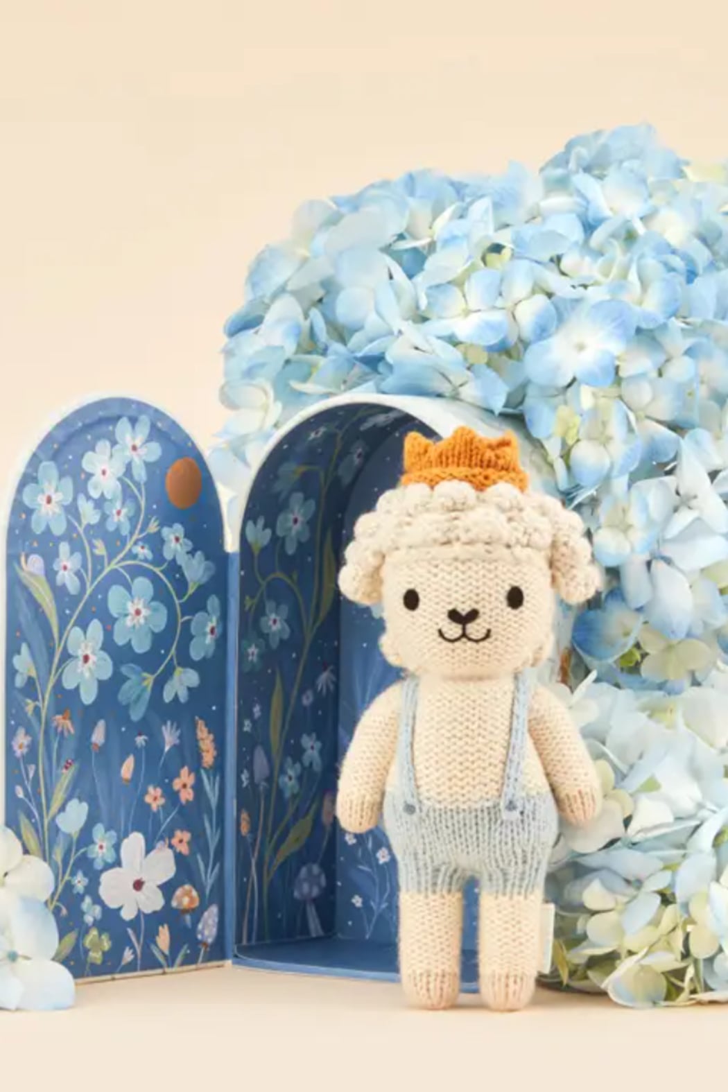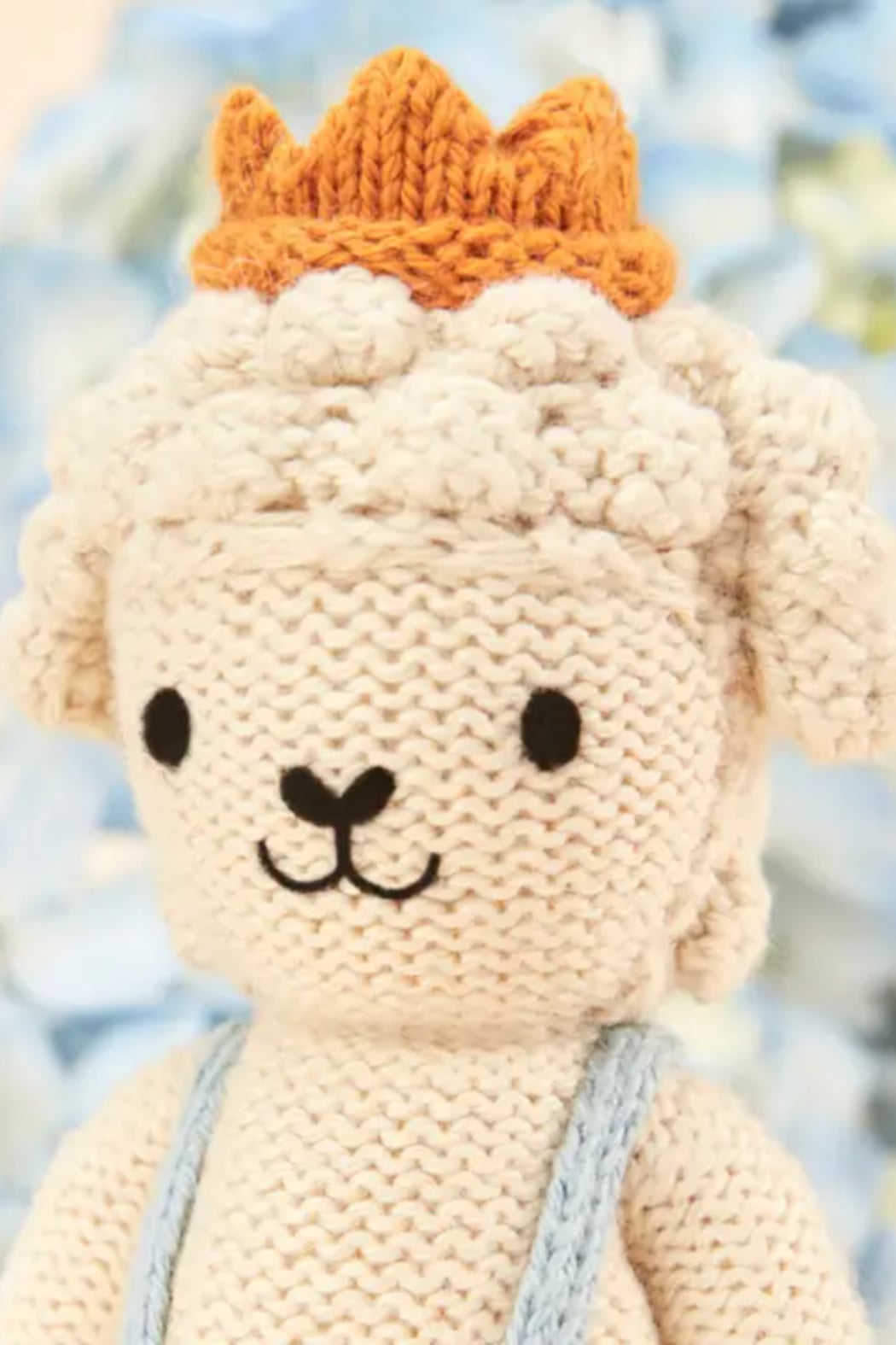 Tiny Sebastian is a hand-knit lamb plush with a tiny crown and soft knit overalls, sized for little hands. This cuddly stuffed animal is crafted in a textured yarn with embroidered facial details for safe, machine-washable play. CUDDLE + KIND designs this piece for everyday comfort and gifting, making it a charming newborn-friendly companion.