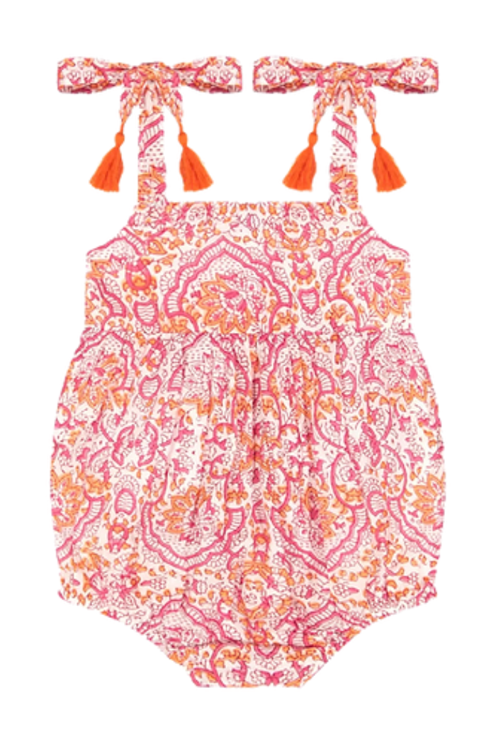 A sweet shoulder tie romper perfect for long days at the pool or beach. Snap bottom closure. 100% cotton voile.