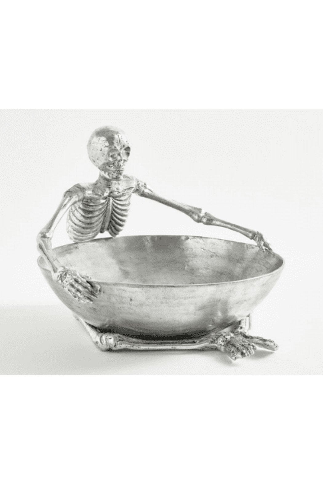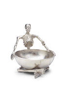 Give your Halloween party-goers, or your trick-or-treaters something extra fun this year with this Skeleton Candy Bowl in silver. Measures 7.5" H x 3.25" opening. Made from Aluminum. Hand wash only and FDA Approved.