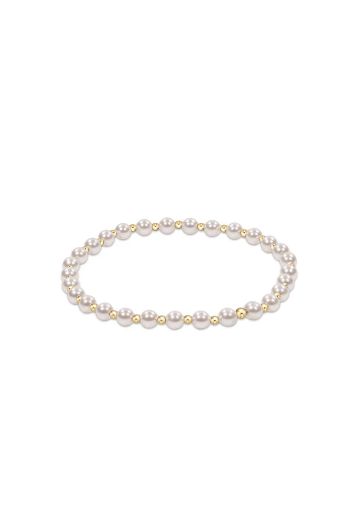 Introducing our new pattern, grateful. This bracelet is a classic gold beaded bracelet with alternating bead sizes. The larger bead size is a 4mm crystal pearl and the smaller bead size is a 2mm.