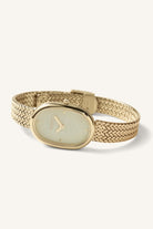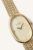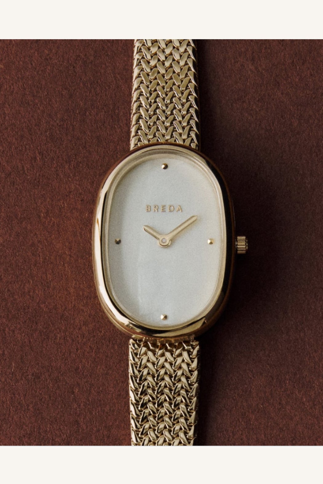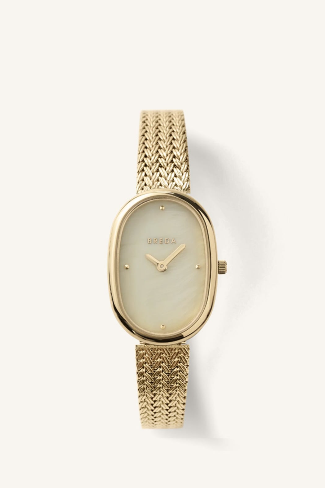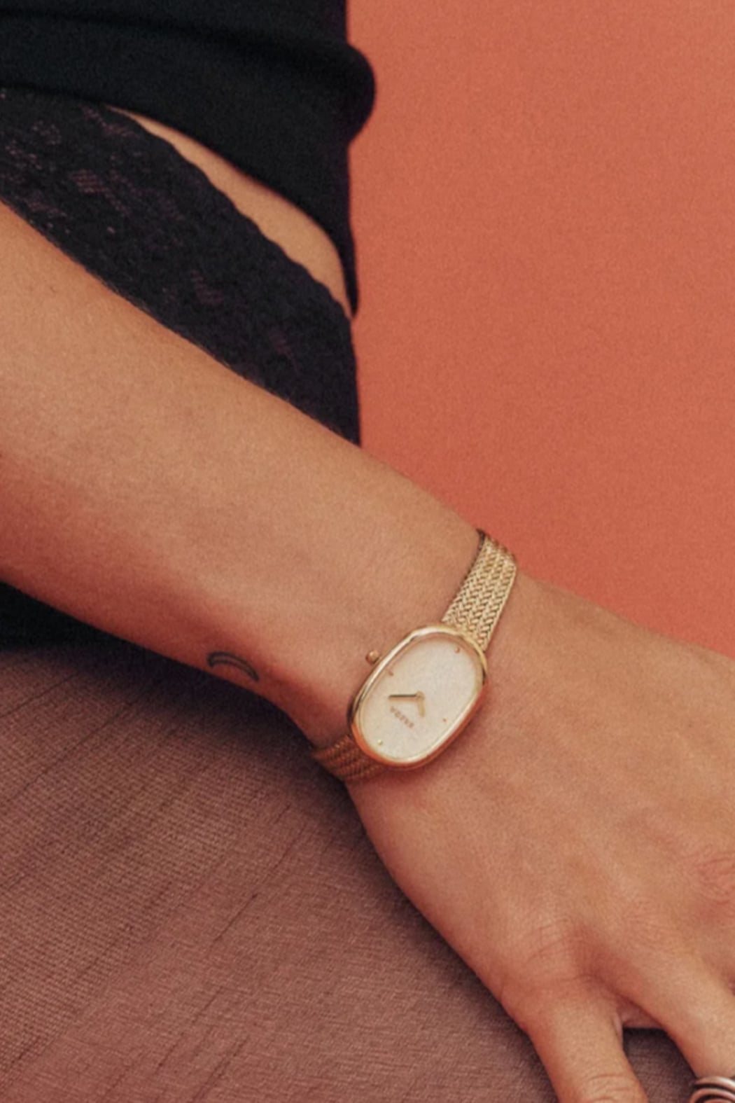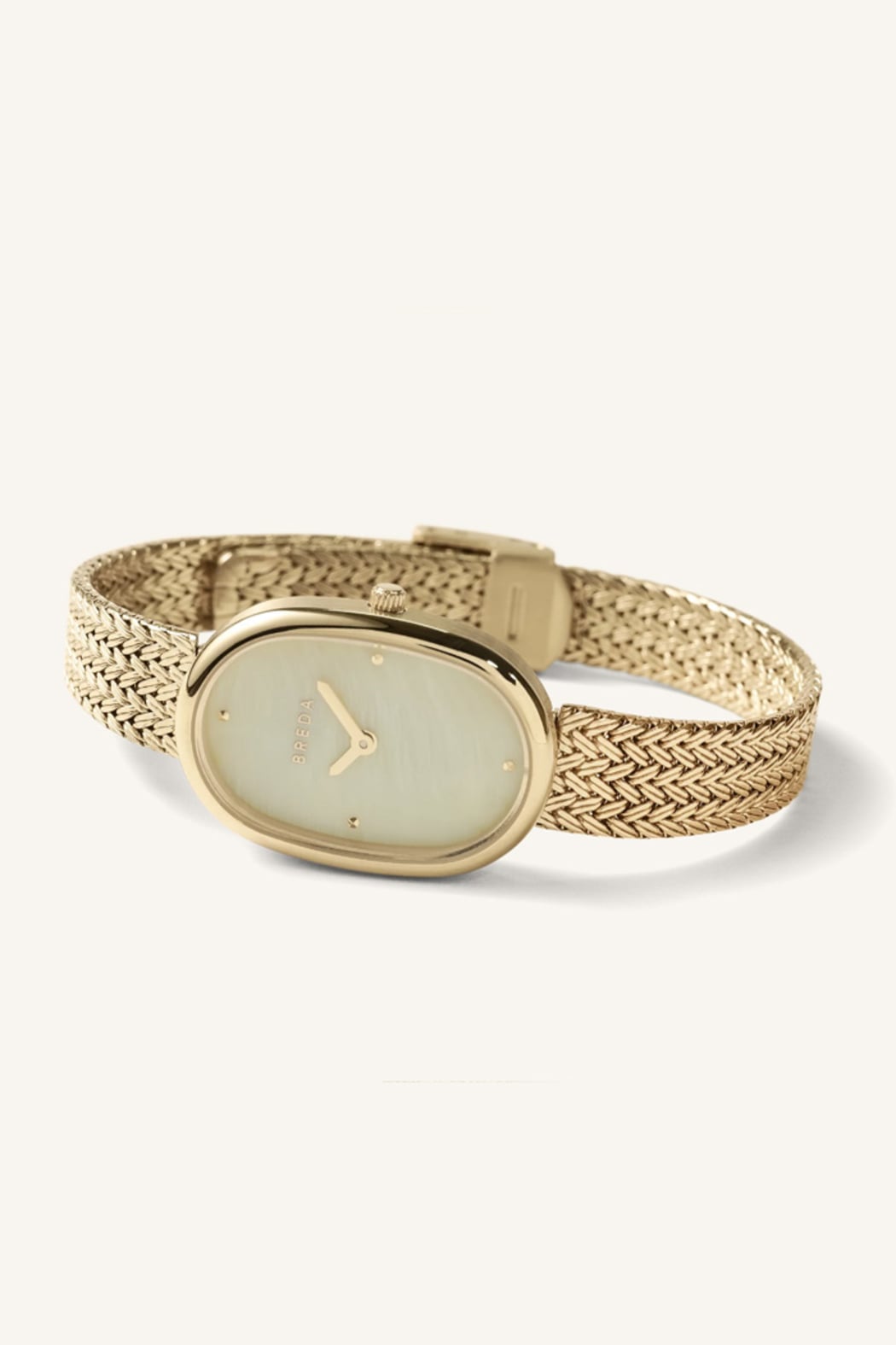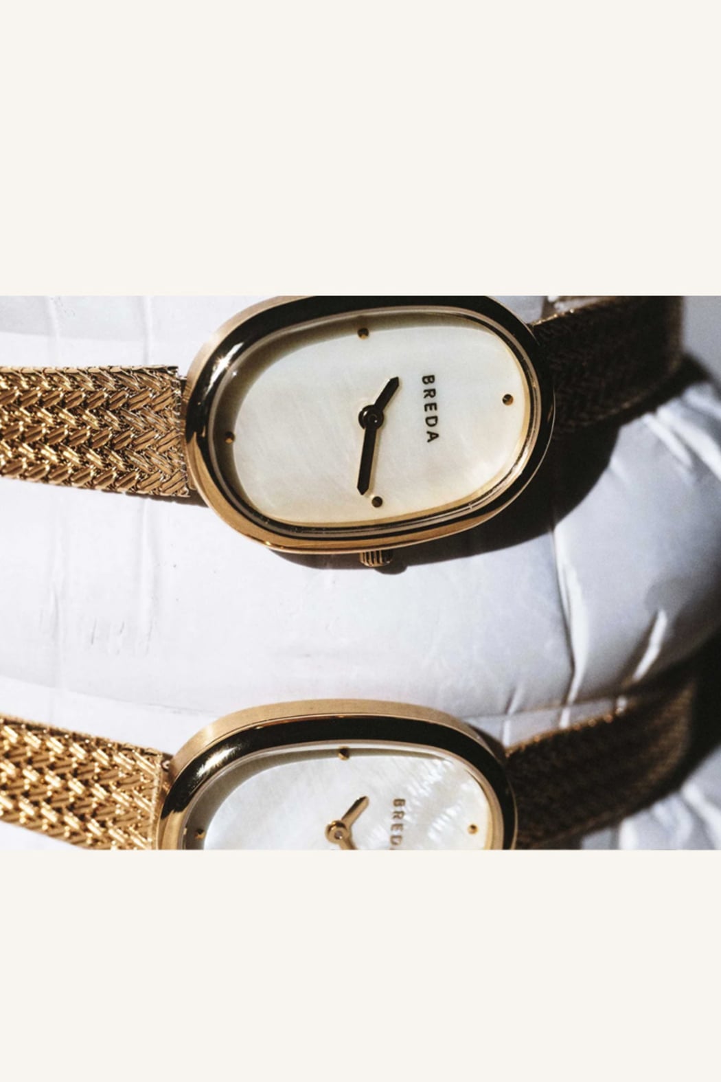 The Tethered collection exists as a daily reminder of our human connection and our shared memories intertwined, endlessly collapsing together. The Jane (Tethered) carries a delicate 23mm oval case, champagne mother of pearl dial and a tapered woven mesh bracelet that fastens with a quick release clasp. - 18K Gold-Plated Case - 23mm Case - Mother of Pearl is a product of nature, there will be variances in texture on each dial. - Gold-Plated Woven Metal Bracelet - 12mm Band - 3ATM Splash-Resistant - Japanese-Made Miyota Quartz Movement -BREDA Warranty: We cover any manufacturer defects of the watch movement. If your watch stops working or has any issues within the warranty period, we will service it at no charge.