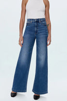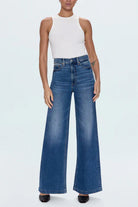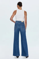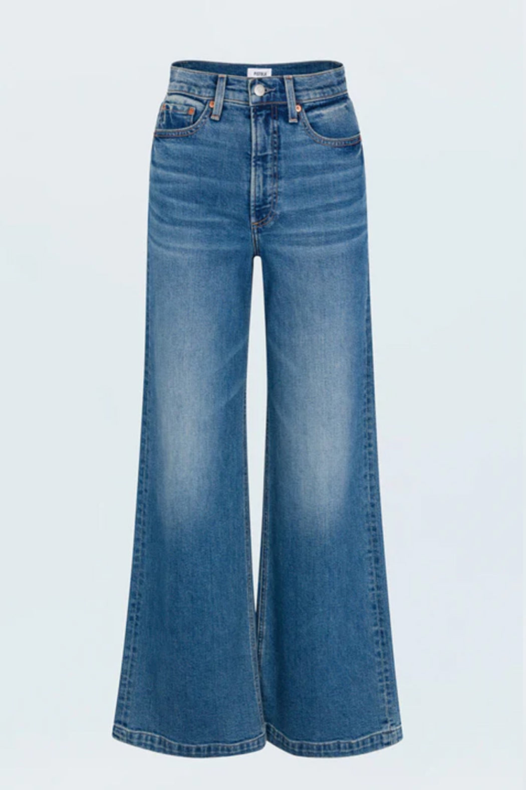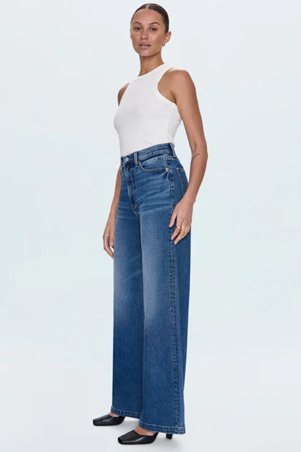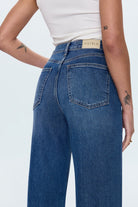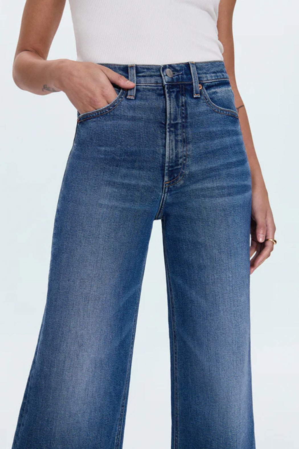 A relaxed, ultra wide leg silhouette with a high rise waist, full length leg, and a clean finished hem. Crafted from our signature comfort stretch denim to provide a structured shape with just the right give. Finished in an easy medium dark comfort stretch fabric, these jeans promise to be a versatile staple you'll reach for day after day, effortlessly transitioning from casual outings to dressier occasions.