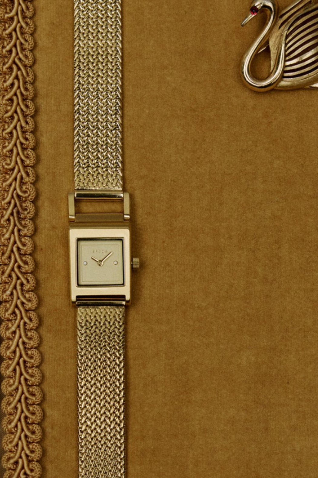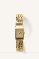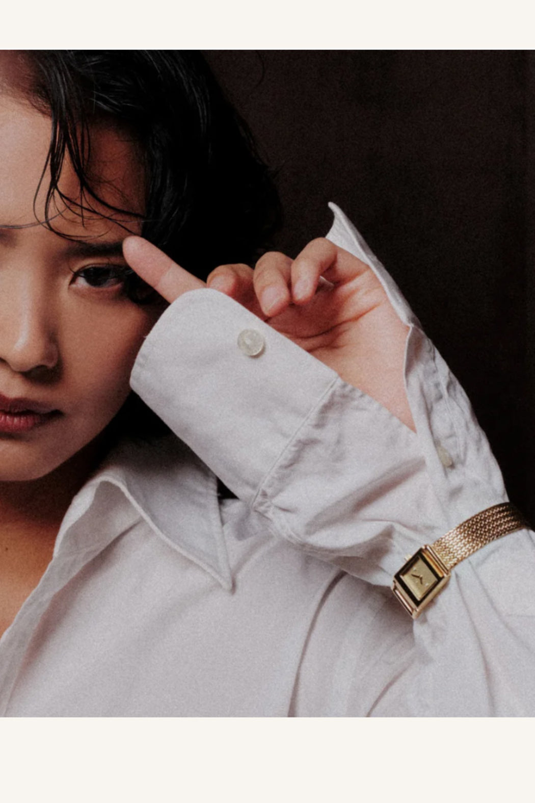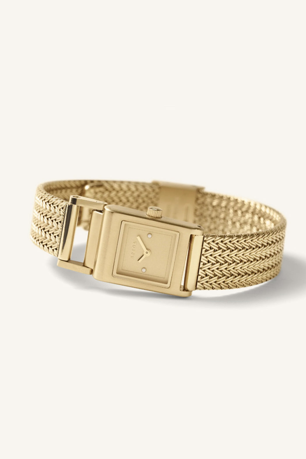 The Tethered collection exists as a daily reminder of our human connection and our shared memories intertwined, endlessly collapsing together. The Revel (Tethered) carries a petite 18mm squared case with a delicate buckle feature and a woven mesh bracelet that fastens with a quick release clasp.