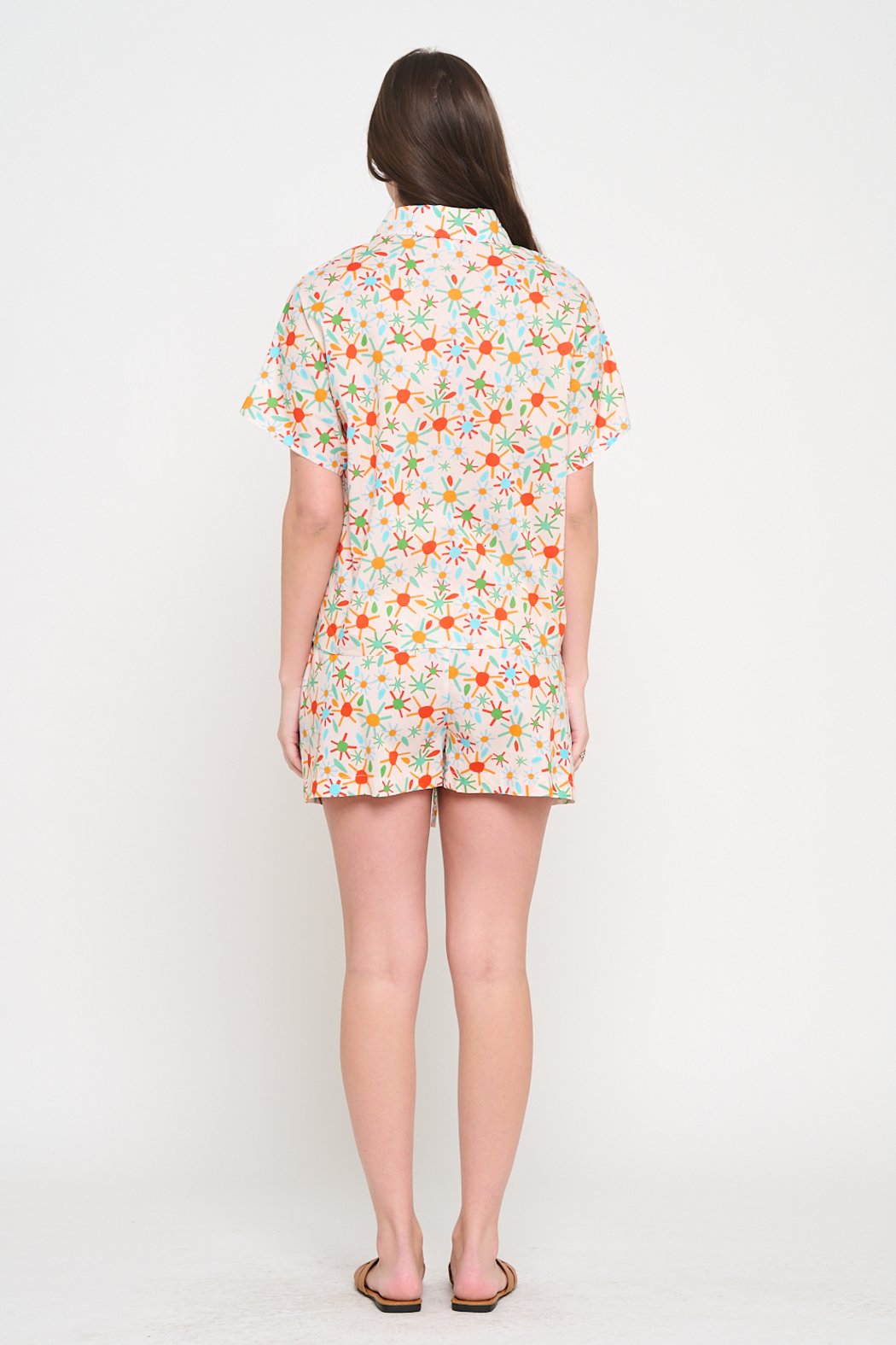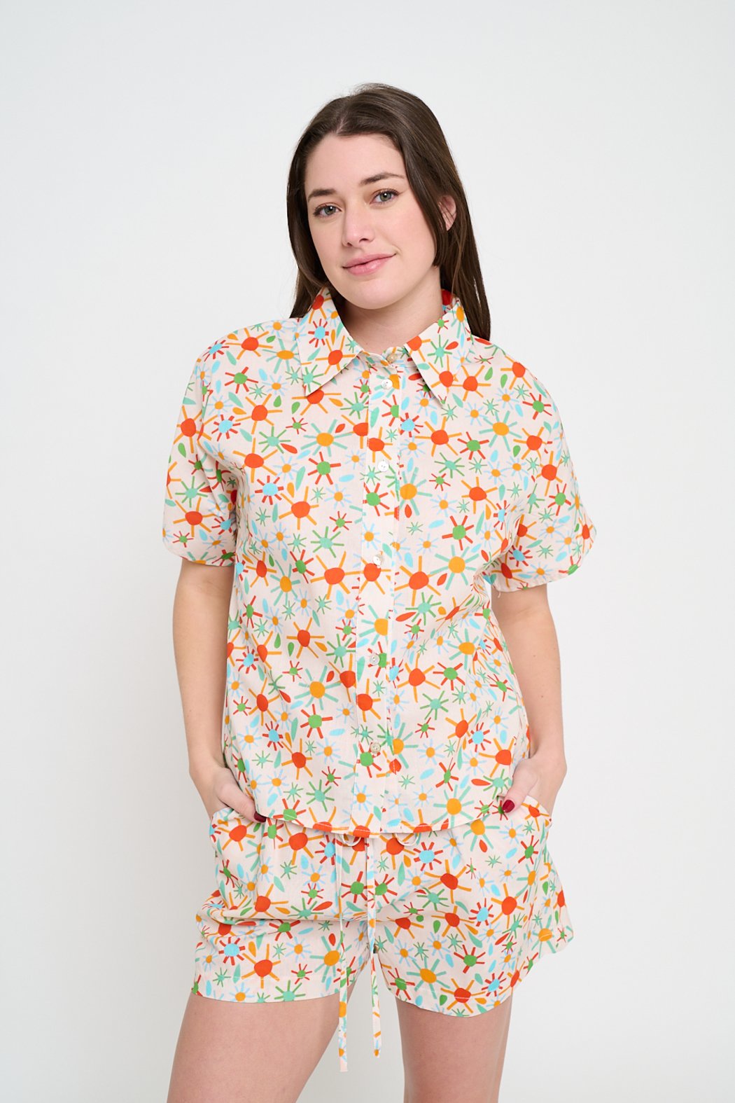Elevate your casual style with this playful button-up & shorts set, designed for a relaxed yet polished look. Featuring a structured collared shirt with a button-up front and matching drawstring shorts, this set blends effortless charm with modern versatility.