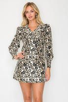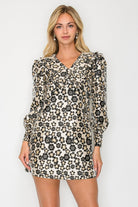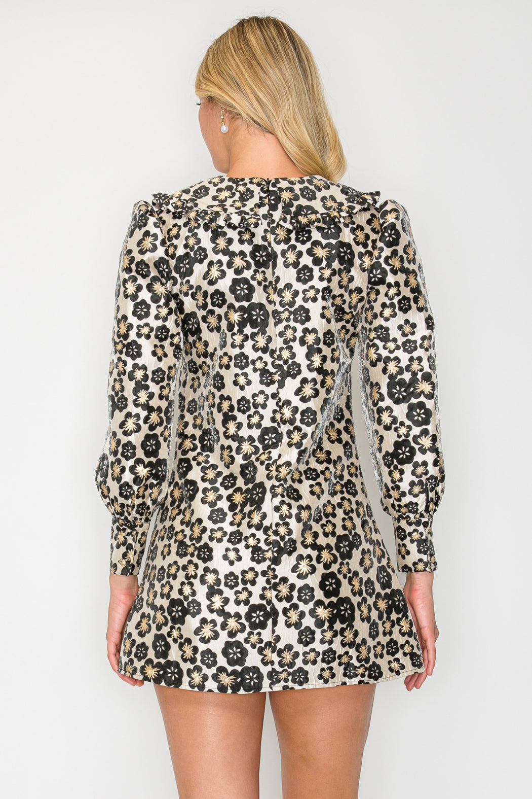 Crafted from a stunning metallic floral jacquard, this dress captures the light with a subtle, celebratory shimmer. The elegant V-neckline is framed by a beautifully detailed statement collar, adding a touch of classic romance to the design. With its chic, long puff sleeves and an easy-to-wear shift silhouette, this dress is perfect for a sophisticated cocktail party, a festive family dinner, or any event where timeless elegance is key.