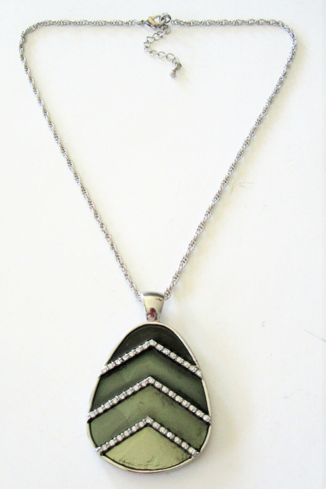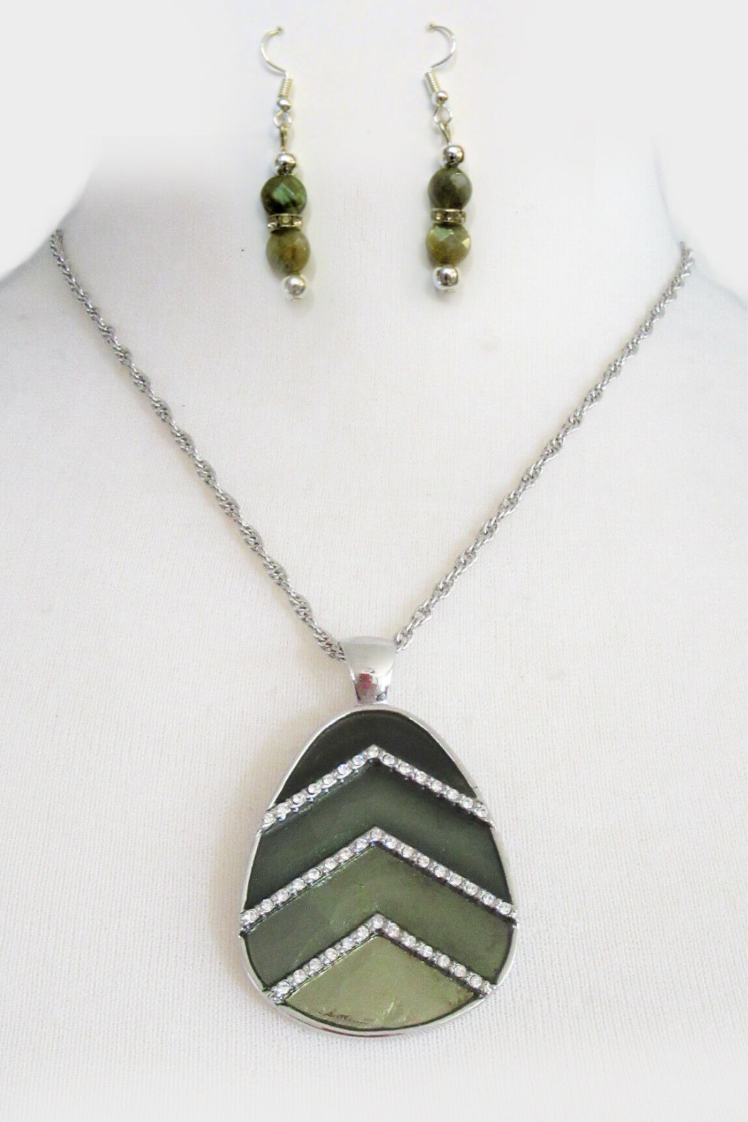 This beautiful silver tone necklace and earrings set is just what you need to add to your wardrobe! The necklace we're calling "4 Shades of Green, so if you need a green necklace, it will probably work just fine! The pendant is on a nice heavy twist silver tone chain. The pendant has, as we said, 4 shades of glossy shimmery green enamel in divided sections, bordered by about 50 crystals. It is adjustable from 18" - 20" in length which makes it even more versatile. It has a lobster claw fastener. The necklace came to us without earrings, and we just couldn't stand for you not to have some to match, so we used some labradorite gemstone beads and some crystals and made some which will be included! We used silver plated hooks, and the earrings measure almost 2" long. Lead and nickel compliant. Comes in boutique gift box. Find lots of affordable jewelry on the Mimi's Gift Gallery boutique page.