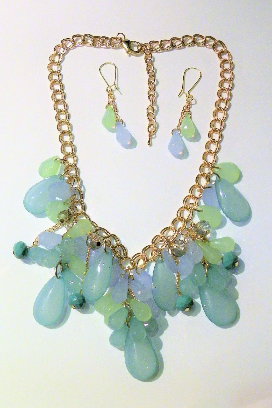 Gold tone necklace featuring clusters of mint green, powder blue and aqua teardrop shaped resin stones. Approximately 17" in length plus a 3" extender (total 20"). Bonus handmade earrings included, earrings total length 2.5". Find other affordable jewelry on the Mimi's Gift Gallery boutique page.