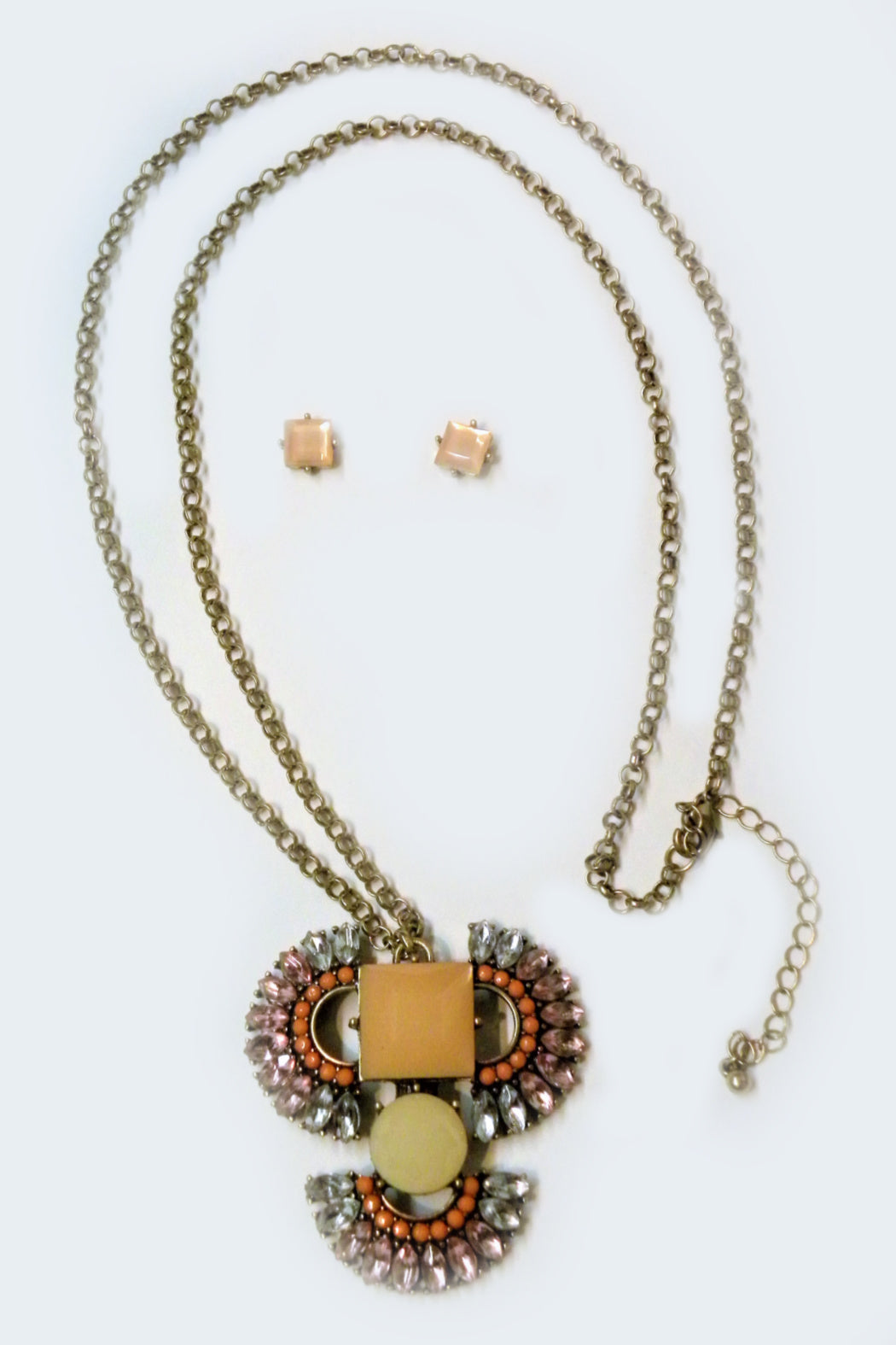 Antiqued Gold tone chain necklace with coral, peach and ivory resin stones and pink and clear rhinestones. It also includes some matching square studs to complete the set. This is the perfect way to dress up your favorite t-shirt and jeans, or toss it on with a maxi and make all your friends jealous! For more affordable jewelry options, check out the Mimi's Gift Gallery boutique page.