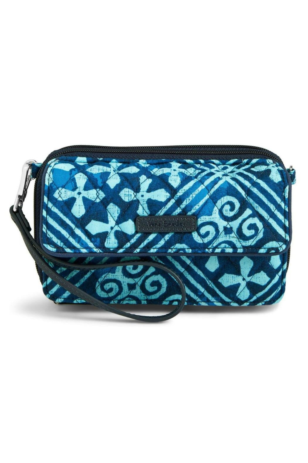 This is the Vera Bradley RFID All in one in the Cuban Tiles pattern. This amazing little bag serves as a wallet, a wristlet or a crossbody. It has a front magnetic pocket which fits a phone up to 6.25". It also provides RFID protection for credit and debit cards. One zippered compartment houses two bill slip pockets two gusseted pockets, and a zippered coin pocket. A second zippered compartment includes a large bill pocket, eight credit card slots, 4 slip pockets and an ID window. Find other accessories in the Cuban Tiles pattern on the "Mimi's Gift Gallery" boutique page. Dimensions are 6 ½" wide x 3 ¾" high x 2" deep with 6" vegan leather removable wrist strap, and a 52" removable, adjustable vegan leather shoulder/crossbody strap.