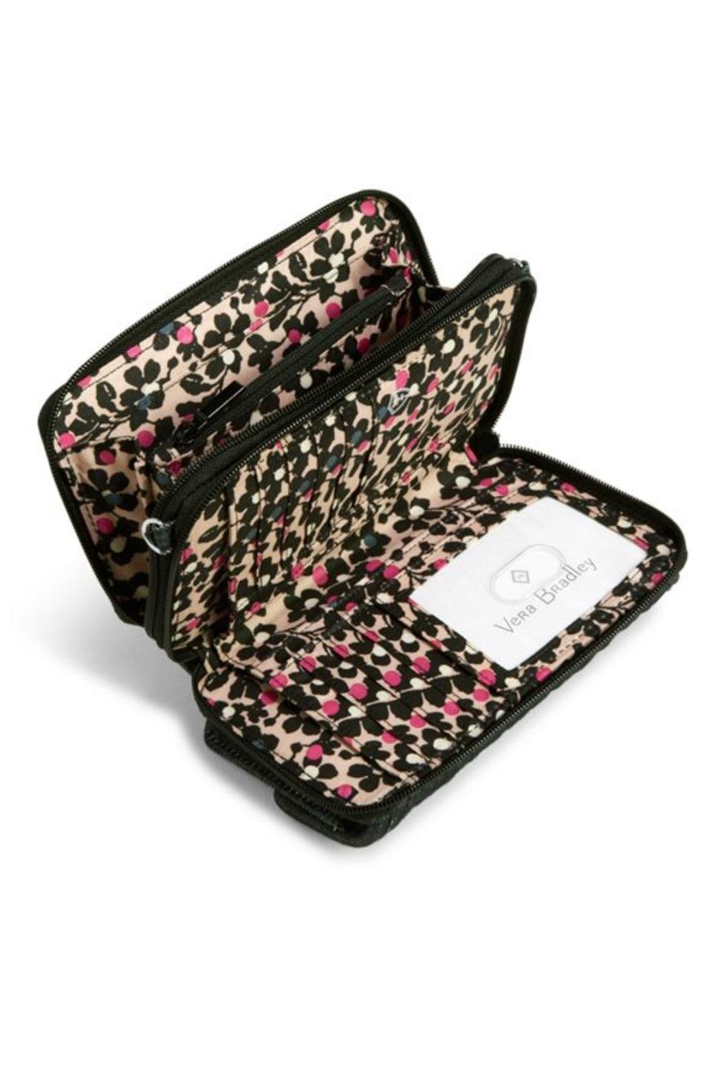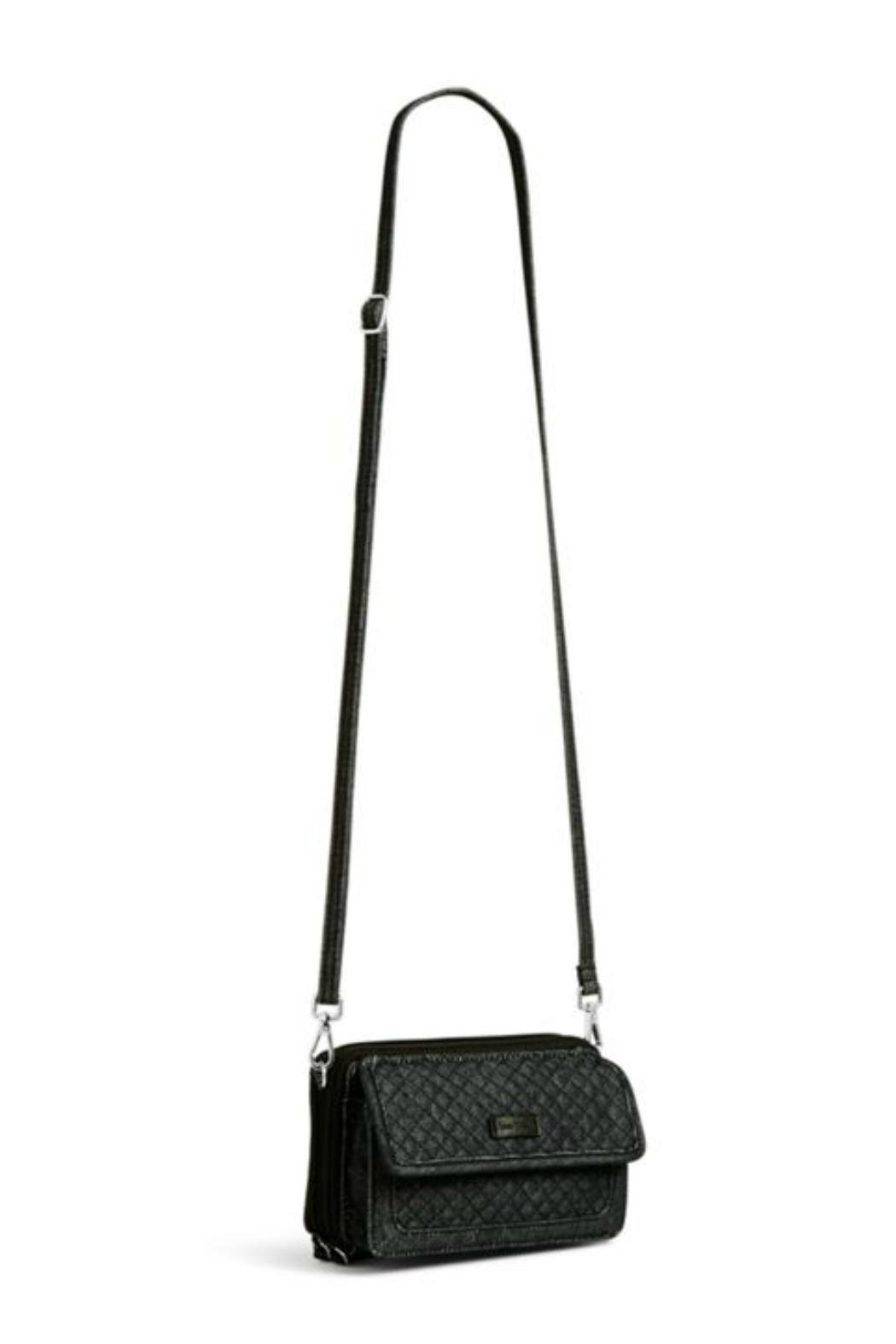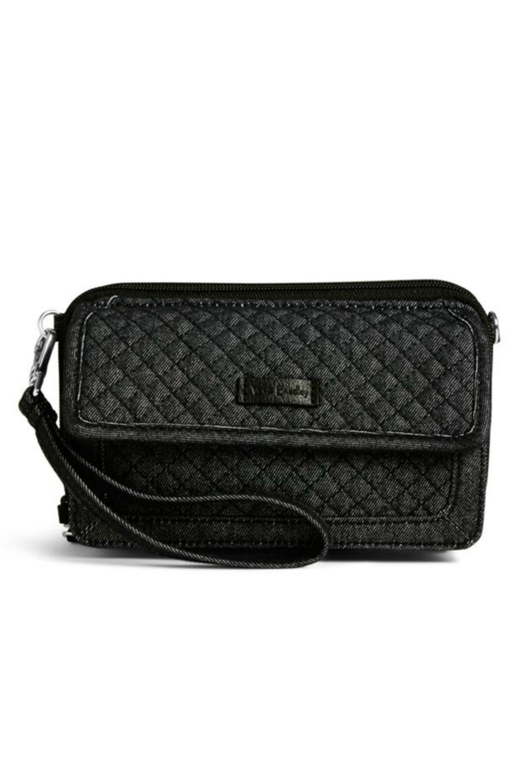 Meet the Vera Bradley Iconic RFID All In One in Denim Navy, which serves as a wallet, a wristlet or a crossbody! This amazing little bag has a front magnetic snap pocket which is a perfect fit for cell phones up to 6.25". It also provides RFID protection for credit and debit cards; One zippered compartment houses two slip pockets, two gusseted pockets, and a zippered coin pocket; A second zippered compartment includes a large bill pocket, eight credit card slots, 4 slip pockets and an ID window and the interior compartments are coordinating signature polyester twill fabric. Silvertone hardware. Find other Denim Navy accessories on the "Mimi's Gift Gallery" boutique page. Dimensions are 6 ½" wide x 4" high x 2" deep with 6" removable denim wrist strap, and a 52" removable, adjustable denim shoulder/crossbody strap.