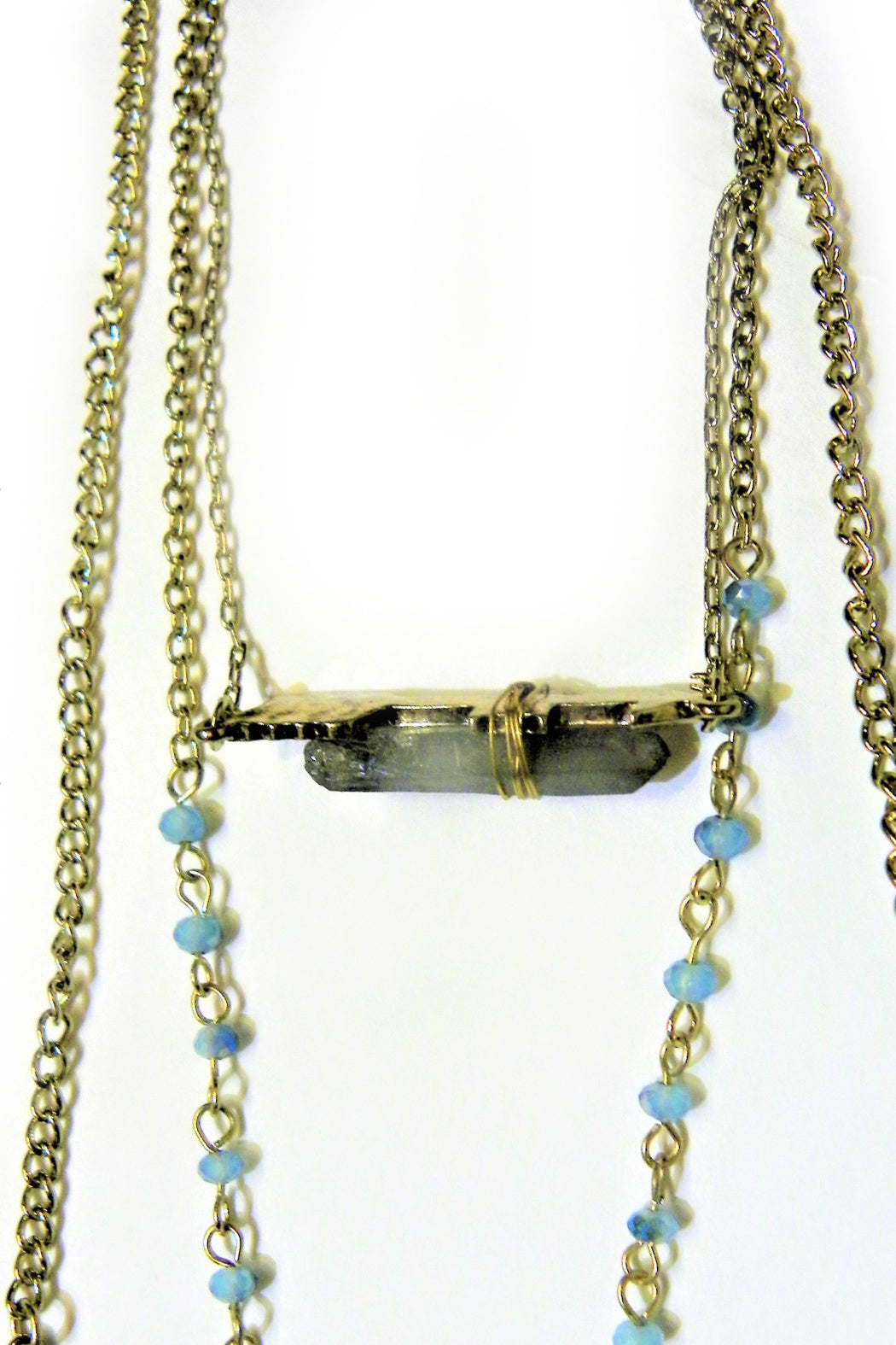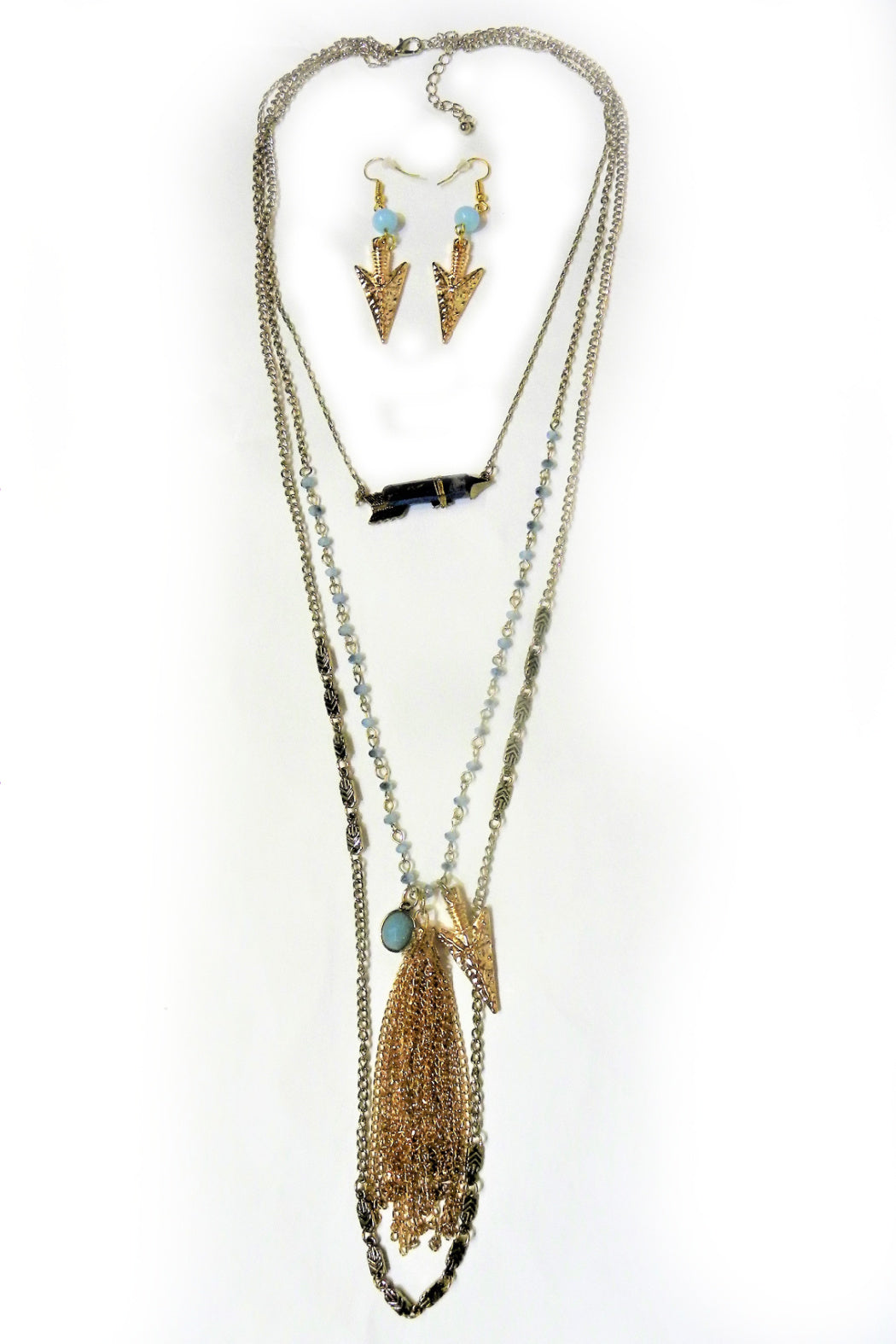 This handmade necklace set includes antiqued gold tone chains with gold accent tassel, blue gemstone, and arrows. It also has a chain of matching blue crystals and a natural crystal stone attached to the upper arrow.