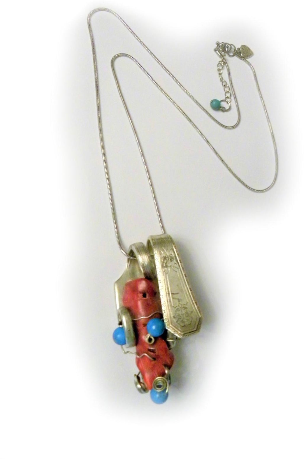 Handmade from an antique fork, with elements of genuine turquoise and coral, this one of a kind necklace will be quite the conversation starter, and it's sure to be one of your favorites for years to come! The chain and lobster clasp is made of stainless steel, so even after years of wear, it will not discolor. Measurements: Chain is 28" long plus a 2.5" extender. Pendant is 3" long x 1.25" wide x .75" deep.