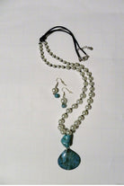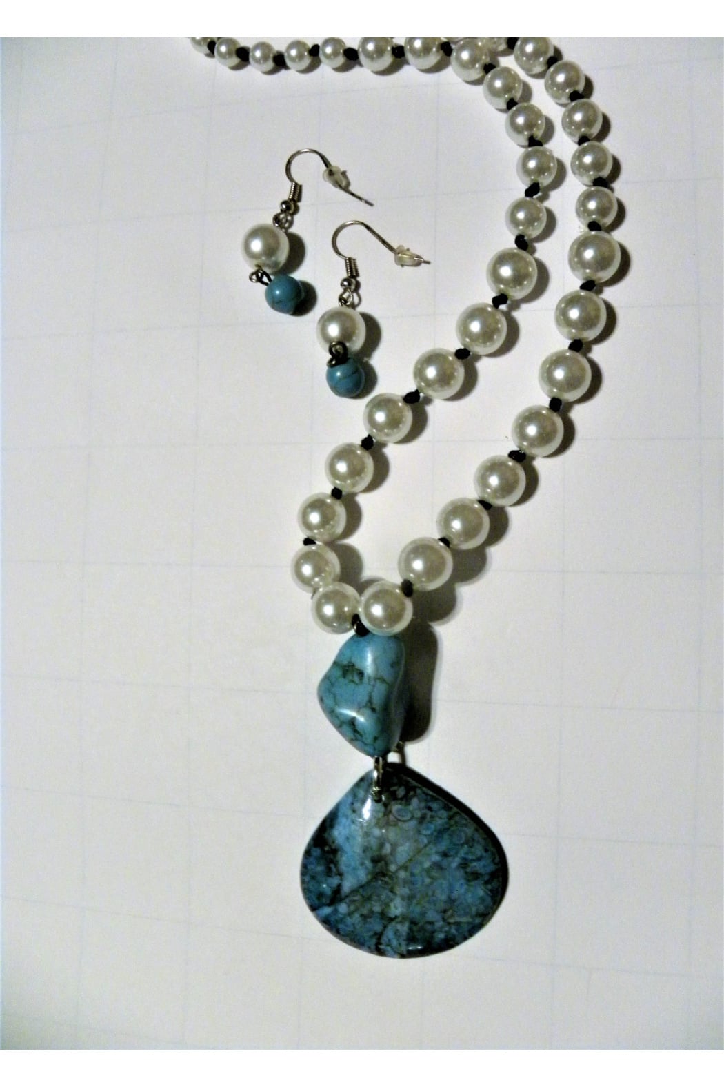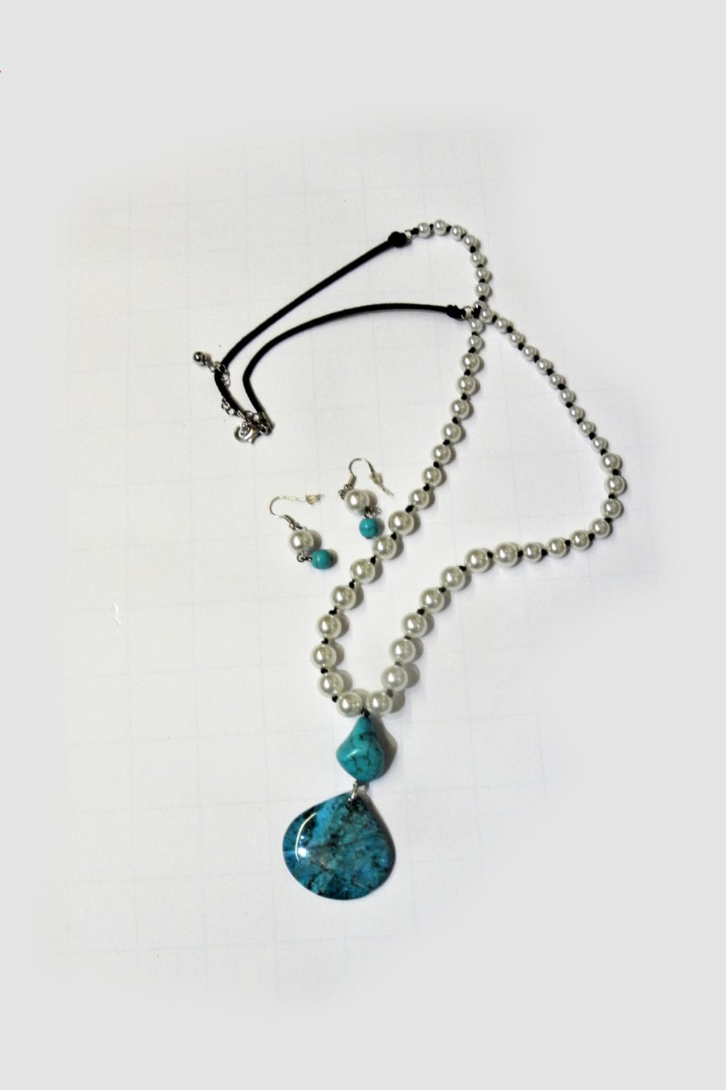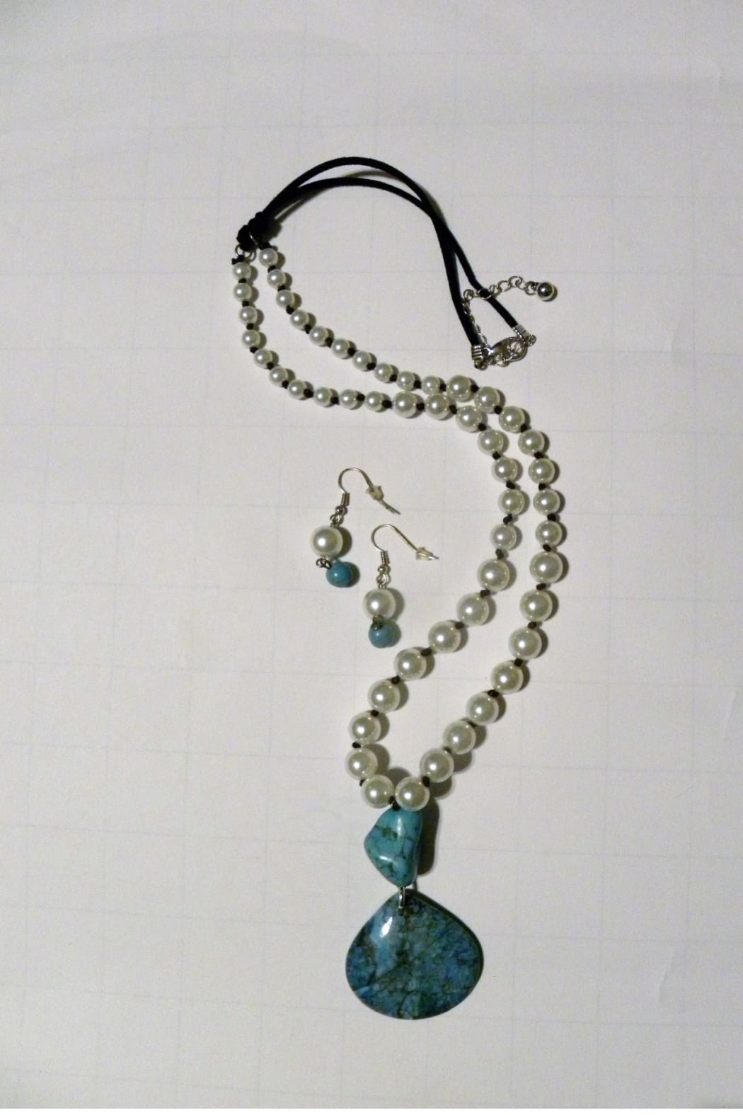 Designed and handmade in our studio, this one-of-a-kind necklace set will turn heads wherever you go! With elements of genuine turquoise, glass pearls, and leather, this set will be quite the conversation starter, and it's sure to be one of your favorites for years to come! The extender chain and lobster hook clasp are made of silver tone metal alloy. Matching handmade earrings are made with genuine turquoise and glass pearls with silver tone metal alloy elements and stainless steel hooks. The pearls are notted between each one. Look for other handmade originals on the "Mimi's Gift Gallery" boutique page. Measurements: Chain and pearls are 28" long plus a 3" extender. Pendant is 2.5" long x 2.6" wide. Earrings are 1.75" long.