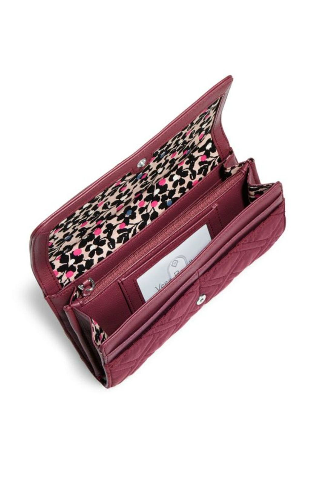 Meet the Vera Bradley RFID Audrey Wallet in the color Hawthorn Rose! This wallet puts everything into one beautiful organized bundle. Made from lightweight, solid-colored microfiber and vegan leather. Provides RFID protection for credit and debit cards. Exterior zip pocket on back. Inside there are two gusseted compartments with 8 credit card slip pockets, two large bill pockets an ID window, and a zip change pocket. Hidden pin snap closure. Find other accessories in the Hawthorn Rose color on the "Mimi's Gift Gallery" boutique page. Dimensions 7 ¾" w x 4" h x 1 ½" d