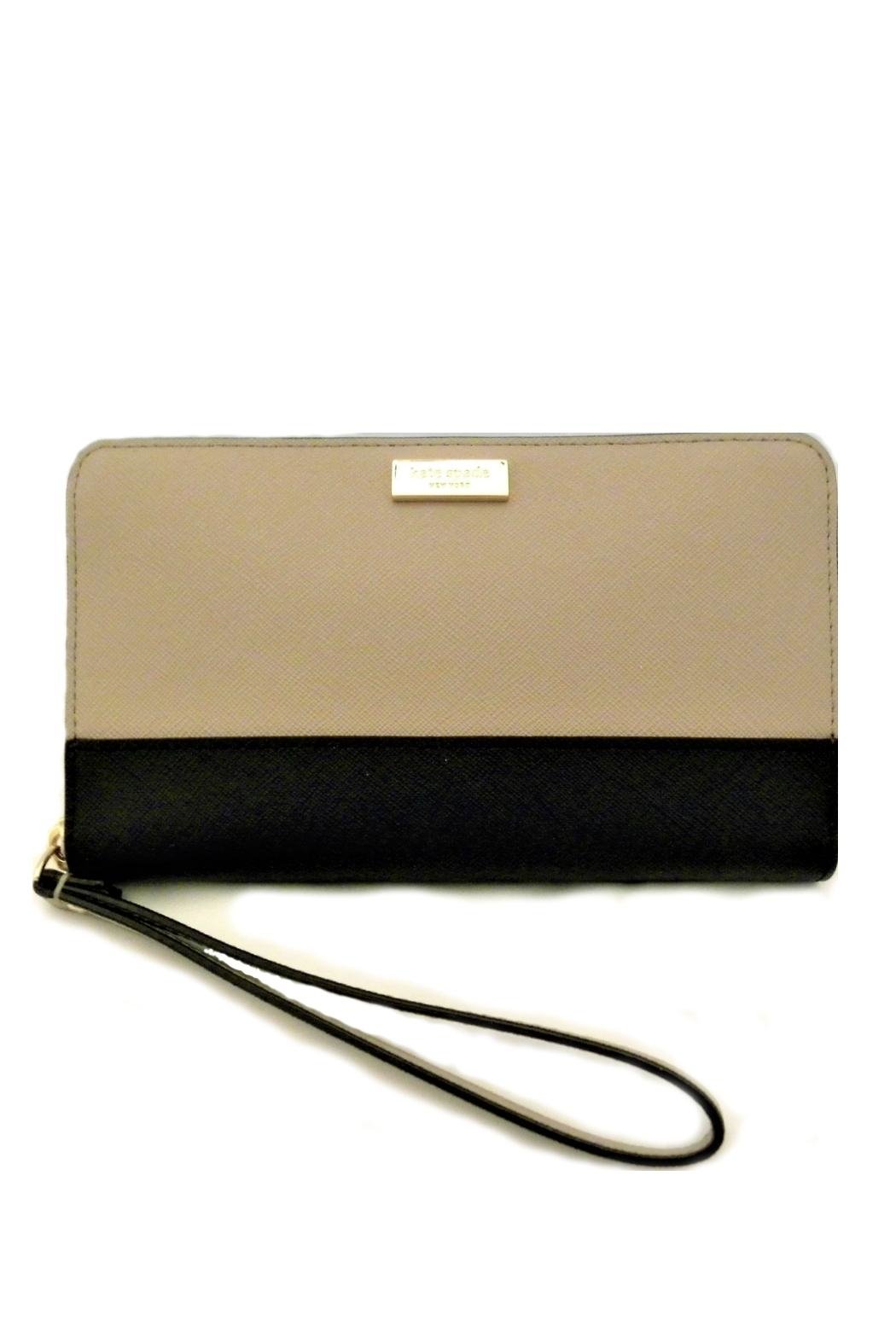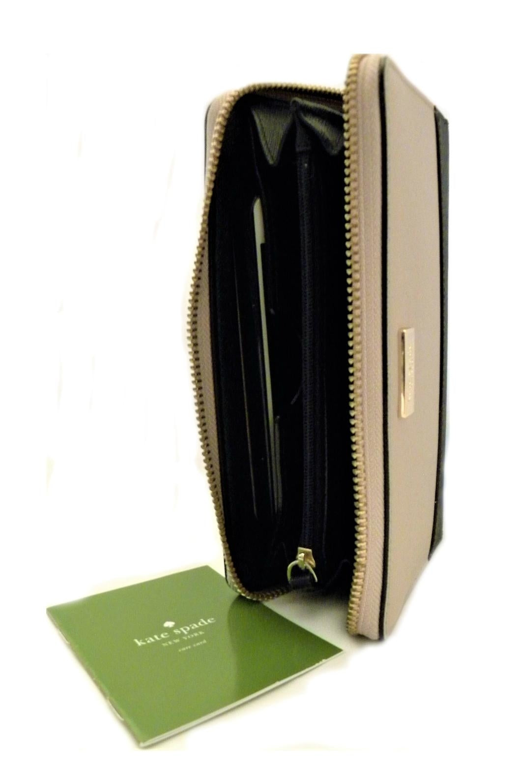 Meet the Kate Spade Alvy Laurel Way Phone Wristlet in Almondine/Black. Beautiful color block saffiano leather, 14K light gold plated hardware, zip around closure, leather wrist strap. Kate Spade New York jacquard lining; 5 card slots, 1 zipped coin compartment, 2 bill compartment (or use one as a phone compartment) and two gusseted compartments, 1 exterior slip pocket. Find other Kate Spade accessories on the "Mimi's Gift Gallery" boutique page. ----------- Approximate measurement; 7"(L) X 4"(H) X 1"(D)