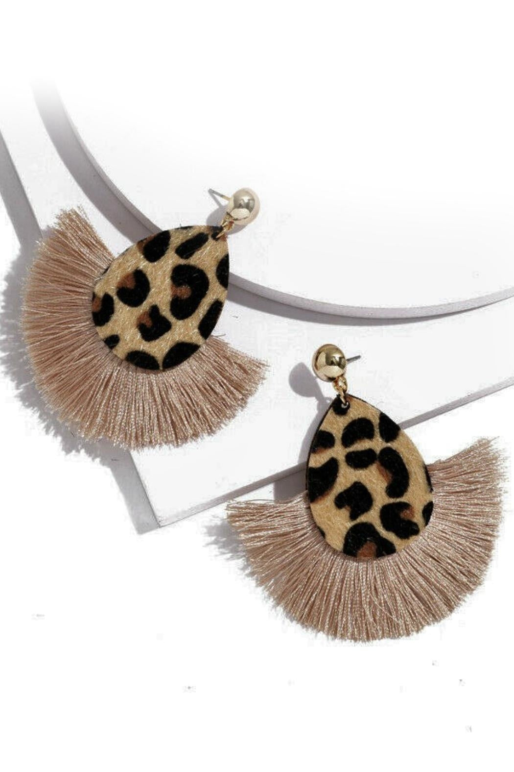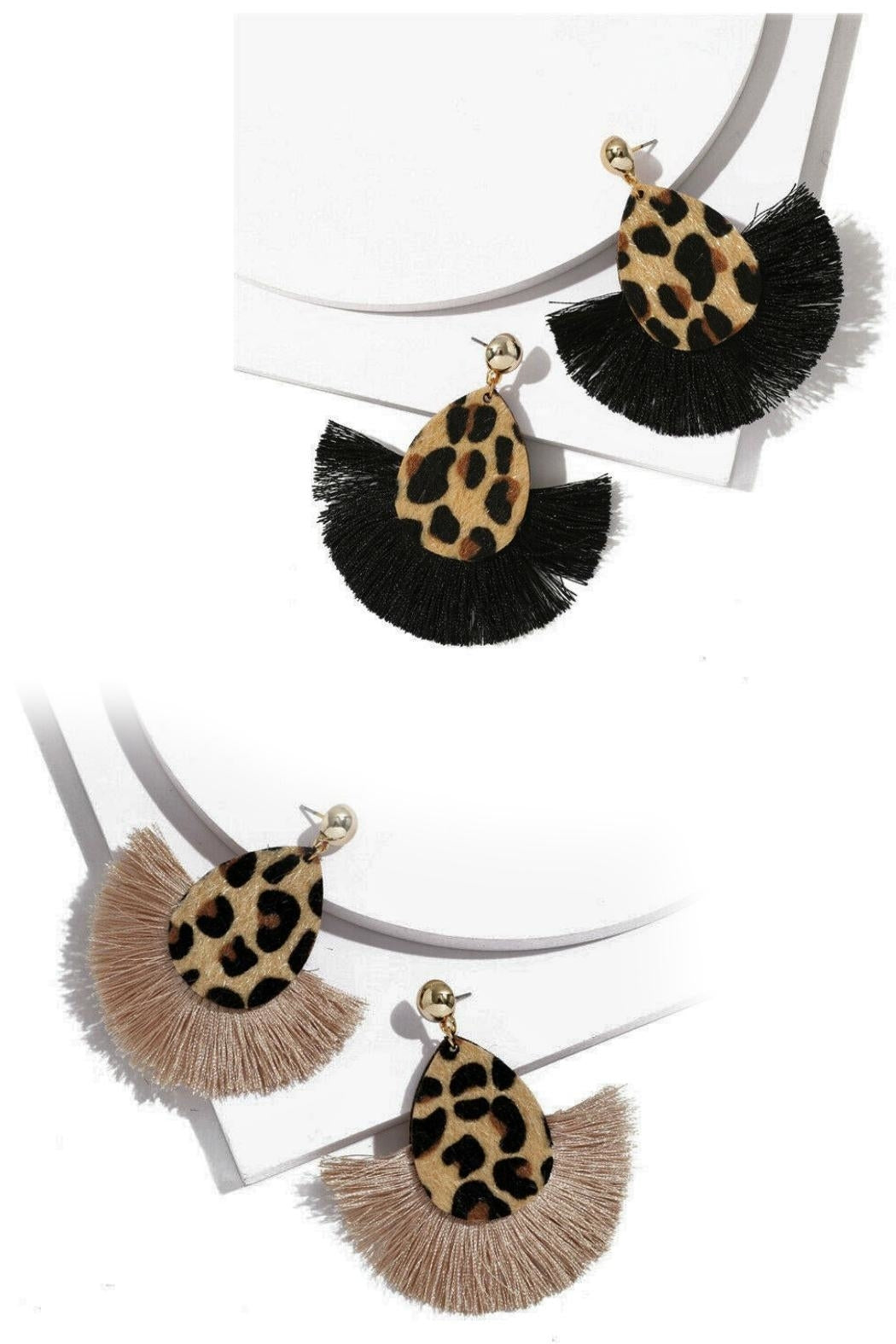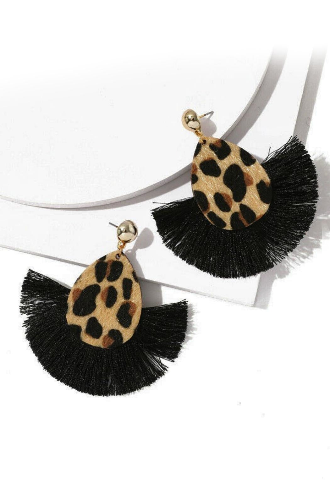 This is a trend that has turned into a classic - Leopard! And these statement earrings say it loud and clear. Faux fur textured leopard print teardrop with fringe half way around. Gold tone studs with bullet and plastic disc backs. Available in black or tan fringe. Comes in boutique gift box. For many affordable jewelry options, look on the "Mimi's Gift Gallery" boutique page.