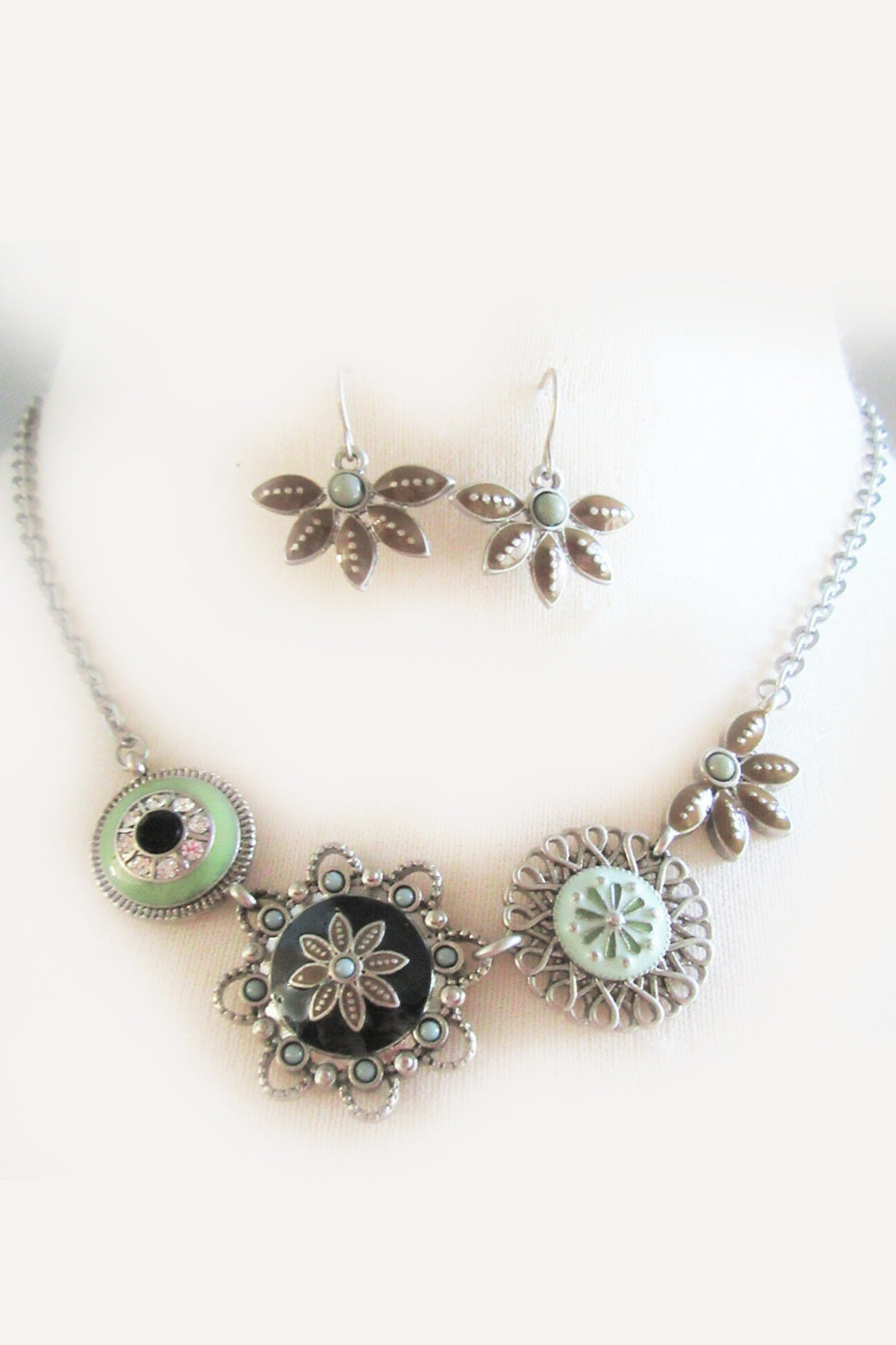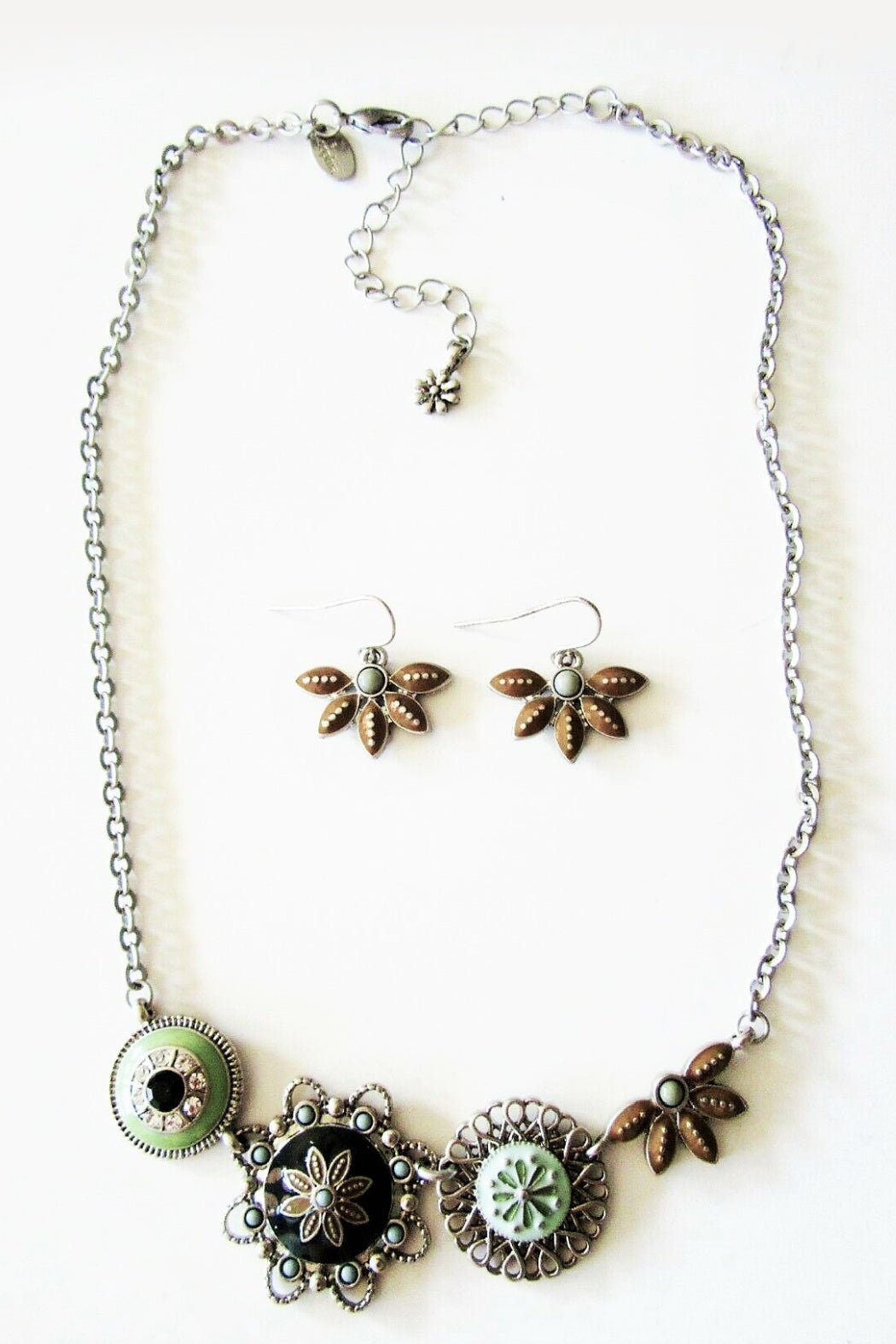 This beautiful silver tone necklace and earrings set is just what you need! With shades of mint, brown and black, it hits the spot. This necklace set is the Lia Sophia "Botanica". It is a small piece that packs a big punch for your look. The necklace is approximately 15" in length with lobster claw fastener and 3." extender for a total of up to 18", depending on what you need for your neckline. It has four different medallion type focals that make it as unique as it is stunning. It has a silver tone chain and "Lia Sophia" charm on fastener. The earrings are fish hook style and they are just a bit less than 1" long and about the same width. Lead and nickel compliant. Comes in Lia Sophia gift box. Find lots of great prices on jewelry on the "Mimi's Gift Gallery" boutique page.