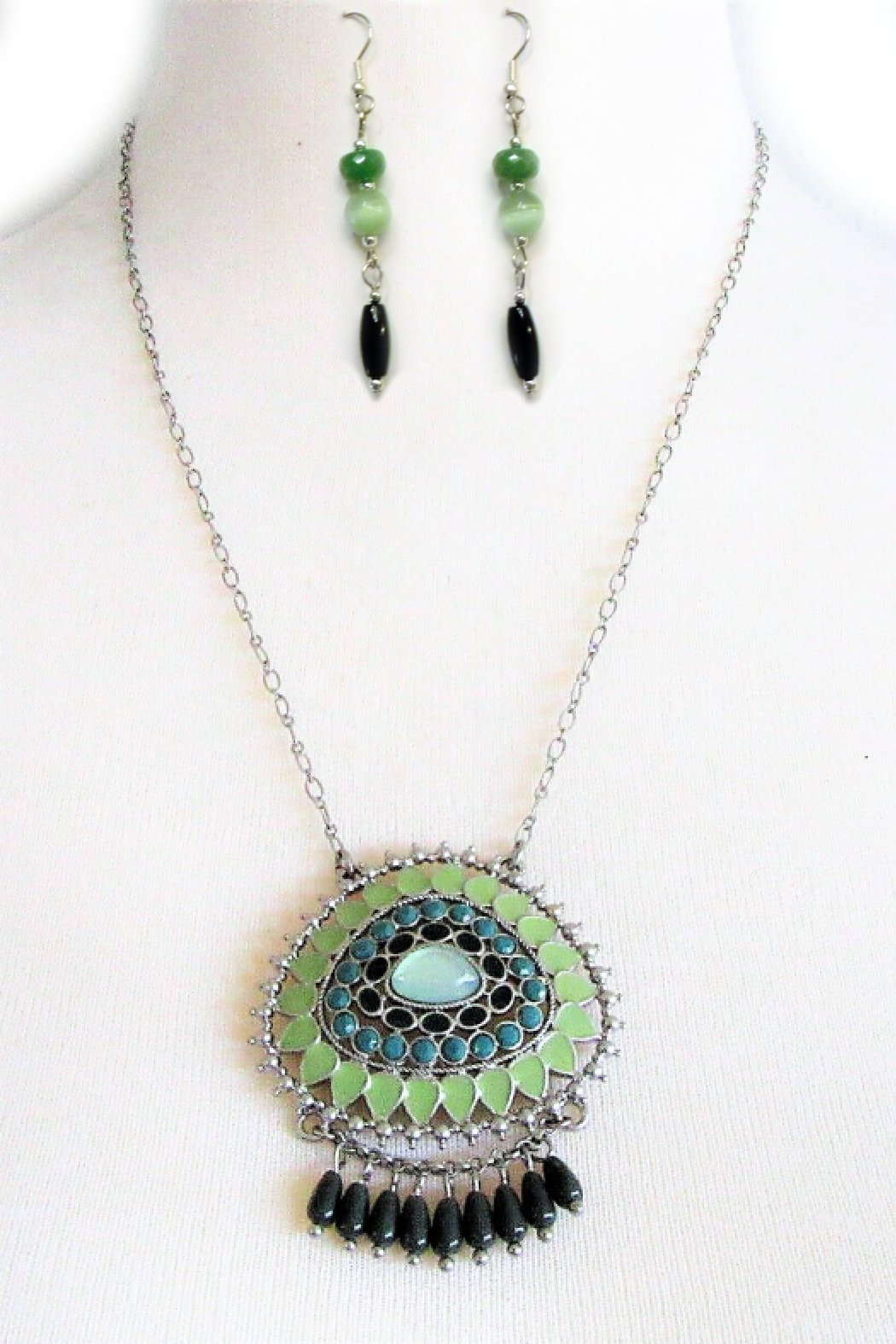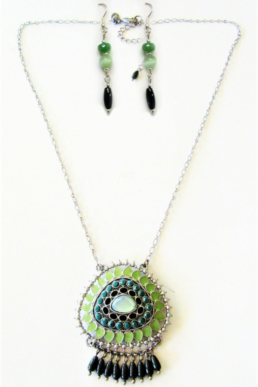 This is the Lia Sophia "Eucalyptus" Necklace. It is designed with a combination of enamel, stones and beads with rhodium plated hardware and chain. We hand made gemstone earrings to perfectly match it, with stainless steel ear wires. Try as we may we just couldn't get a picture to do it justice. This is the kind of set you'll be using with just about any shade of green! So you would be getting this set for less than you would pay for a handmade pair of gemstone earrings! These items comply with safety regulations of lead, nickel and other components. Comes in a Lia Sophia gift box.