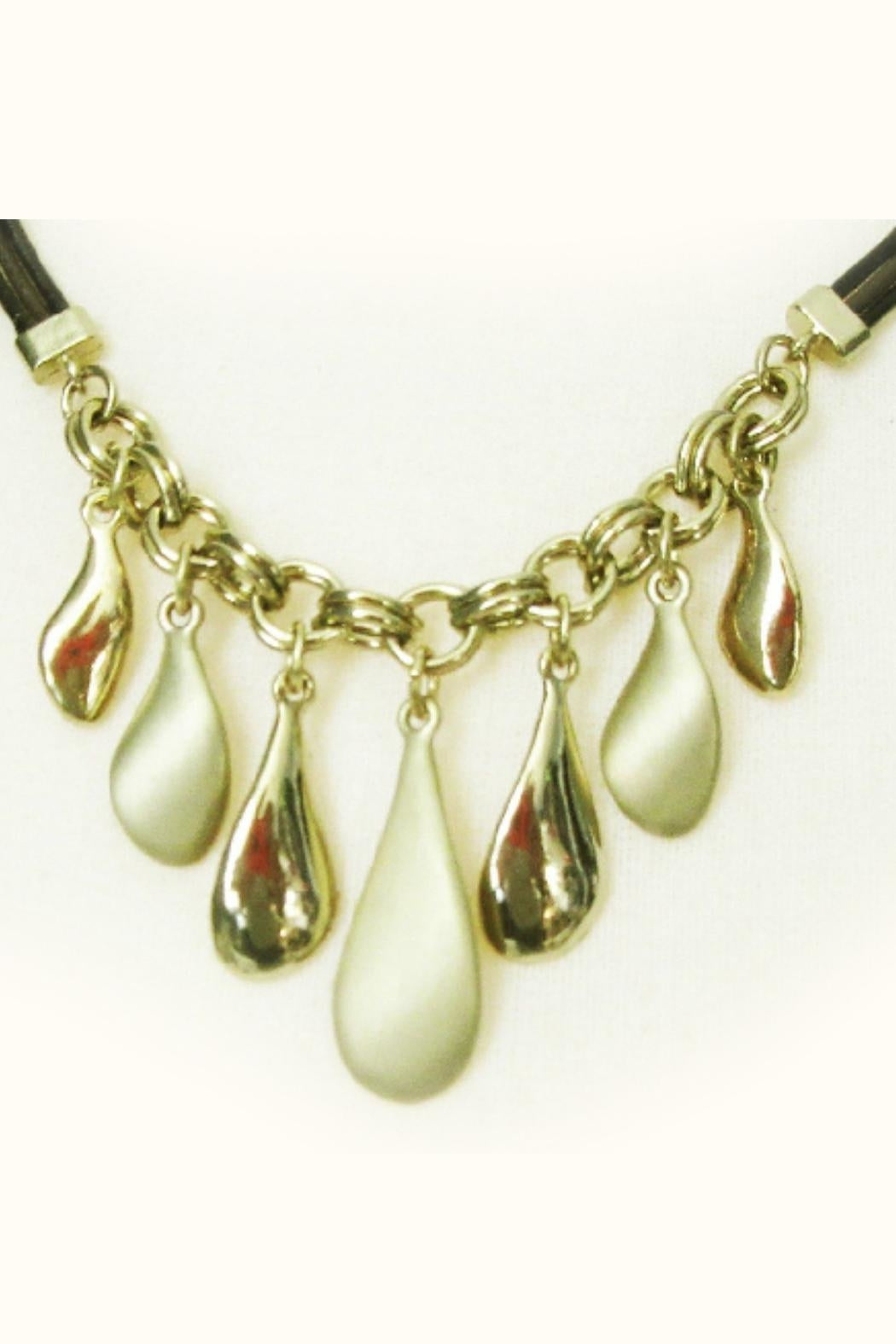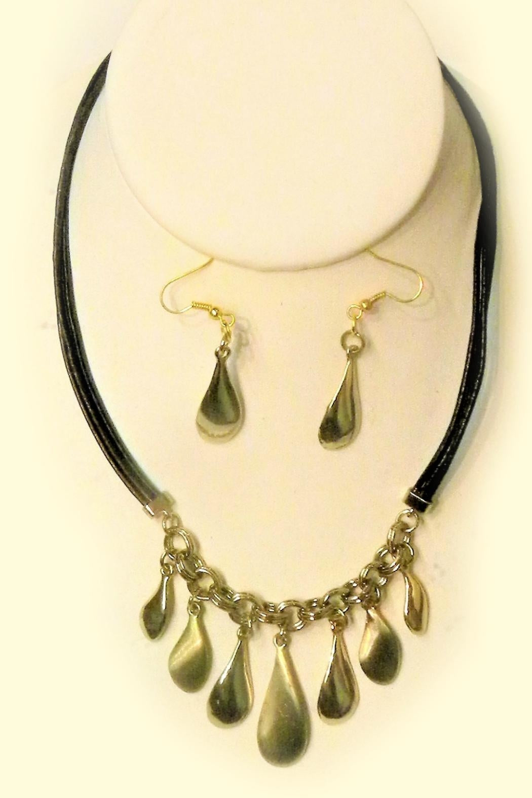 This beautiful gold plated necklace and earrings set is just what you need! With droplets of both smooth polished and matte gold and 3 strands of leather, it hits the spot. This set is the Lia Sophia "Jamboree". The necklace is approximately 16" in length with lobster claw fastener and 3" extender, and the pendant hangs another 1.5". It has two black leather cords and one brown one, making it more versatile. "Lia Sophia" charm on fastener. The earrings are fish hook style and they are approx. 2" long. Lead and nickel compliant. Comes in boutique gift box. Find lots of moderately priced jewelry on the "Mimi's Gift Gallery" boutique page.