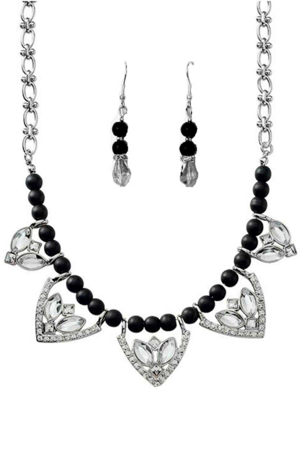 This beautiful rhodium plated necklace is just what you need with that LBD! Perfect for any special occasion, or when you just want to feel pretty! With heart shaped focals of rhinestone, resin stones and genuine agate black beads, this is a winner you'll depend on for years to come. This is the Lia Sophia "Maison". The necklace is approximately 17" in length with lobster claw fastener and 3" extender which has a gorgeous focal attached, so if you have short hair or an up-do, you can even bling from the back!. "Lia Sophia" charm on fastener. We handmade the earrings to perfectly match with crystals, rhinestones and agate beads. Stainless Steel Fish hook style. Earrings are approx. 2" long. Lead and nickel compliant. Comes in Lia Sophia gift box. Find lots of moderately priced jewelry on the "Mimi's Gift Gallery" boutique page.