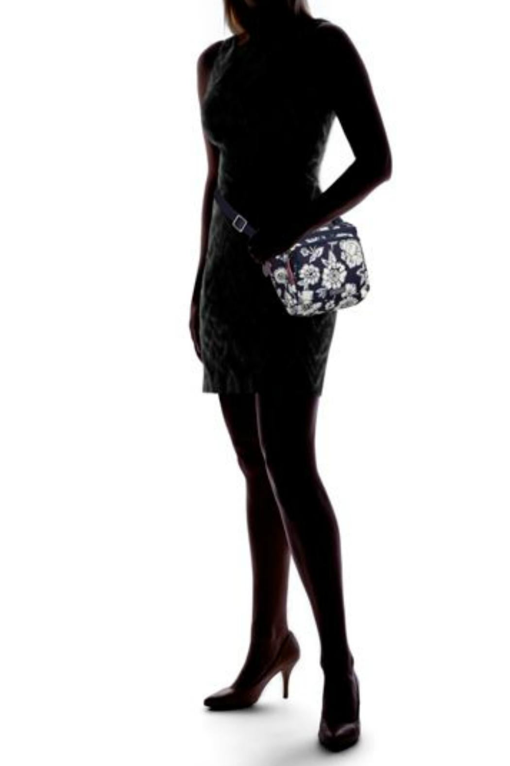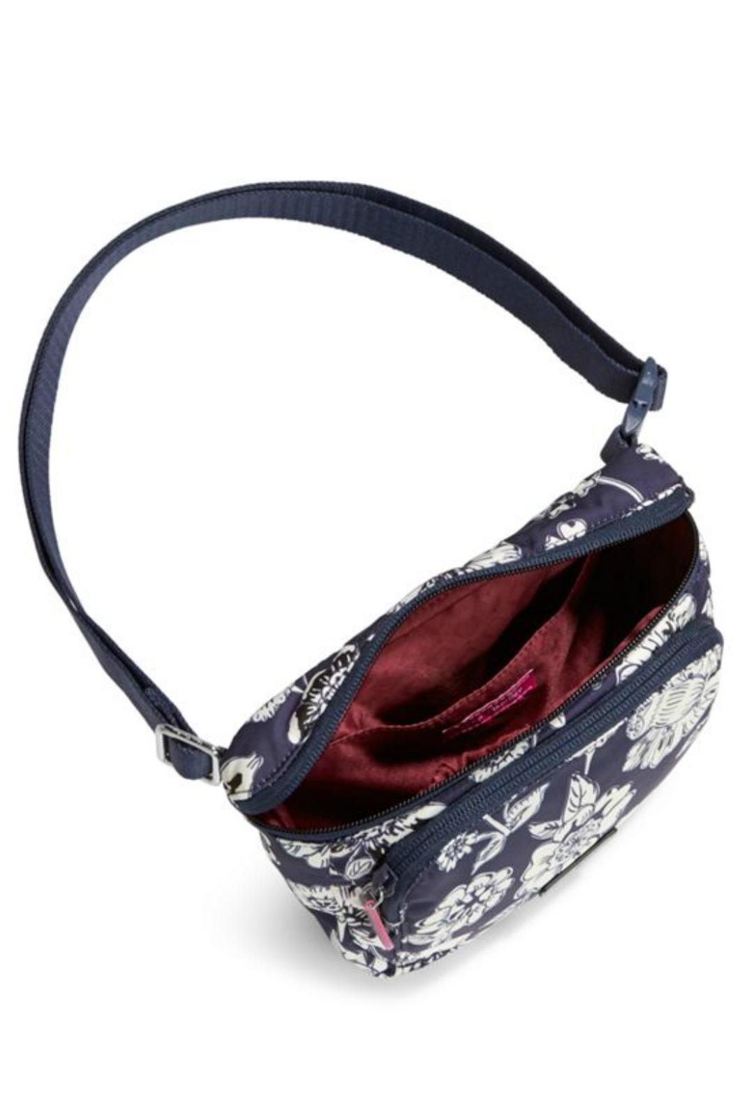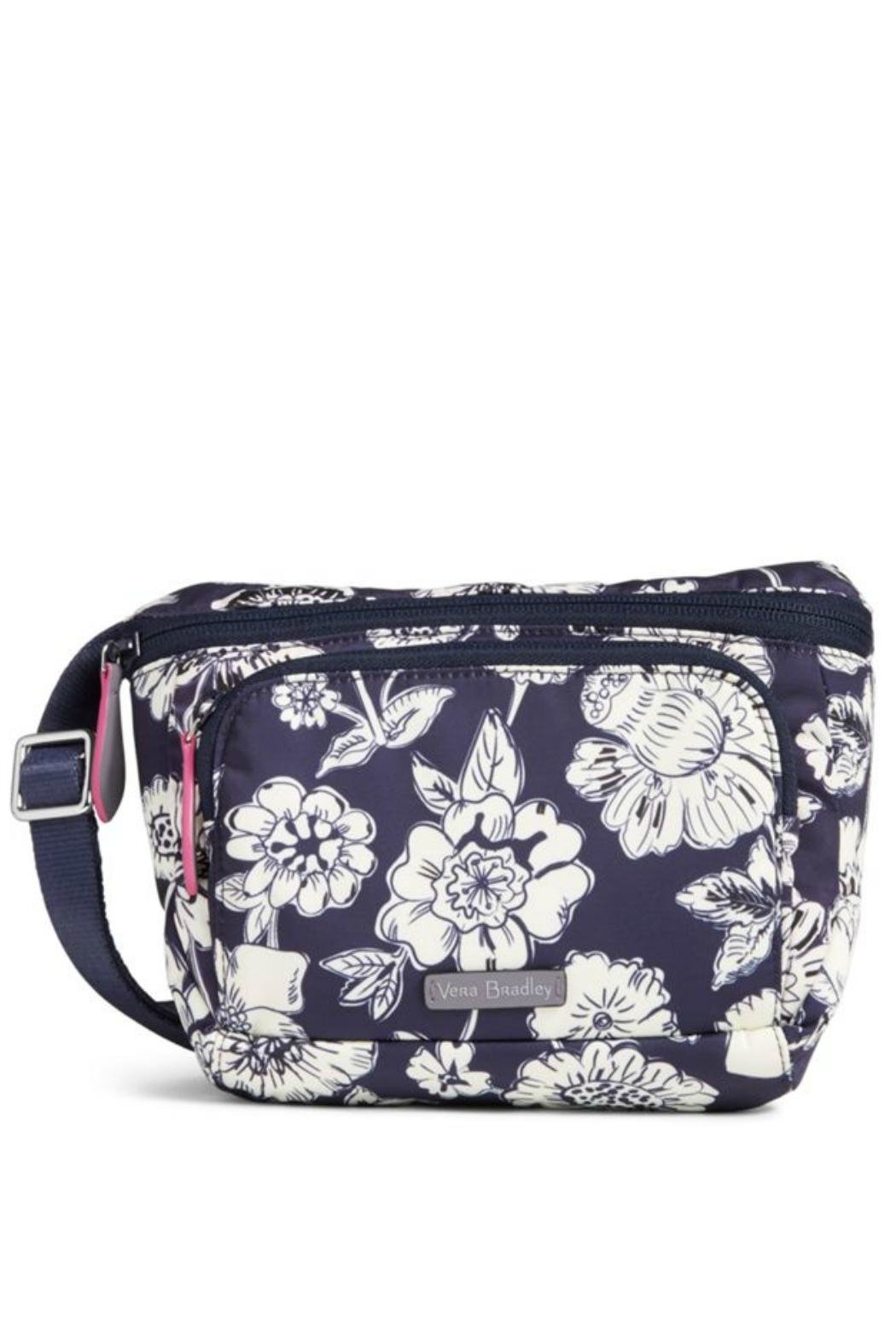 Here is the Vera Bradley Midtown Belt Bag in the Midnight Floral pattern. This is the perfect hands-free companion for runs, walks and festivals. And you can use it as a crossbody! Additional pockets on the exterior and the interior assure that this bag is anything but basic. Works with Portable Battery Pack. Midtown fabrication is sleek, extremely soft, water repellent polyester. Provides RFID protection for credit and debit cards. Exterior features one zip pocket. Interior features three card slips, a charger pocket and a slip pocket. Includes strap extender for crossbody wear. Print is dark navy background with ivory floral print. Zip closure and silver tone hardware. --------. Dimensions 8 ¼" w x 6 ½" h x 2" d; one size fits most; adjustable to 42"; includes 11" expander