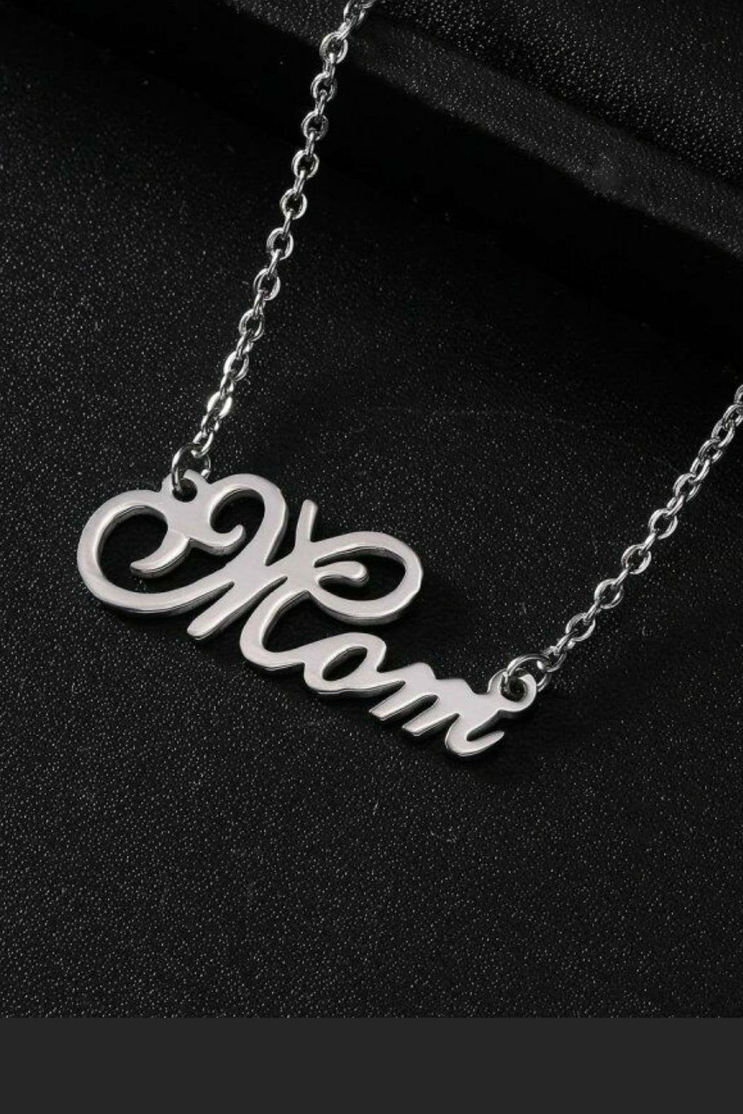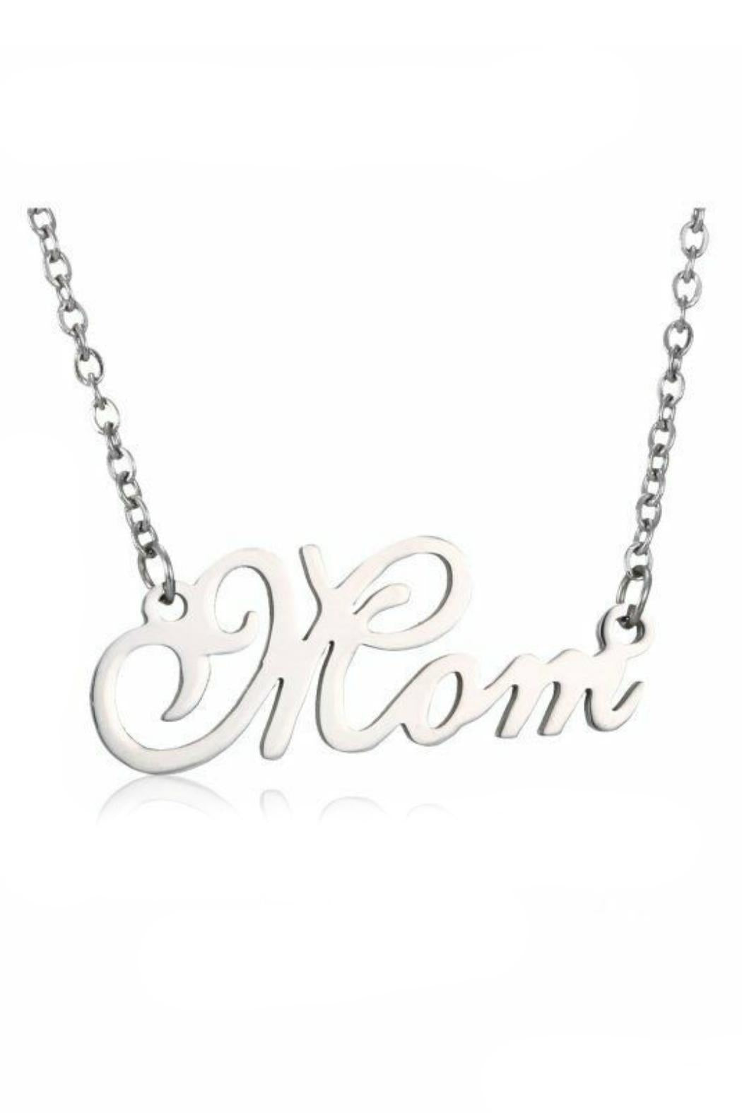 A perfect gift for a mother! This pendant simply states "Mom". Chain, pendant and fastener are all stainless steel so if you are looking for a cheaper alternative to sterling or gold, you just found it! It will not turn or tarnish regardless of how often you wear it. Comes gift boxed. Find more moderately priced jewelry on the Mimi's Gift Gallery boutique page Dimensions: This pendant is 1 3/8" in length and 1/2" high at tallest point. The chain is 20" long.