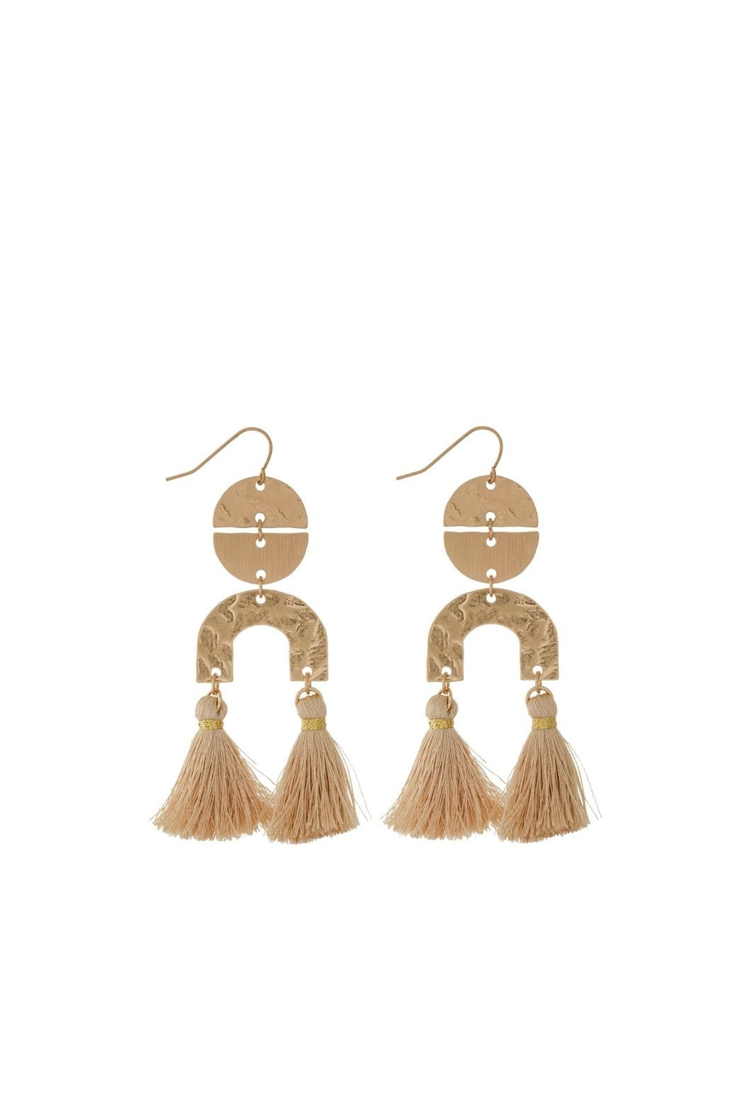 Geometric circles and arcs define these statement earrings with two tassels in tan on each one. Approximately 3" in length x 1" wide. Standard hook. Gold tone metal alloy. Click "Mimi's Gift Gallery" on this page and type "Neutrals Tassels Necklace" in search to find the matching necklace!