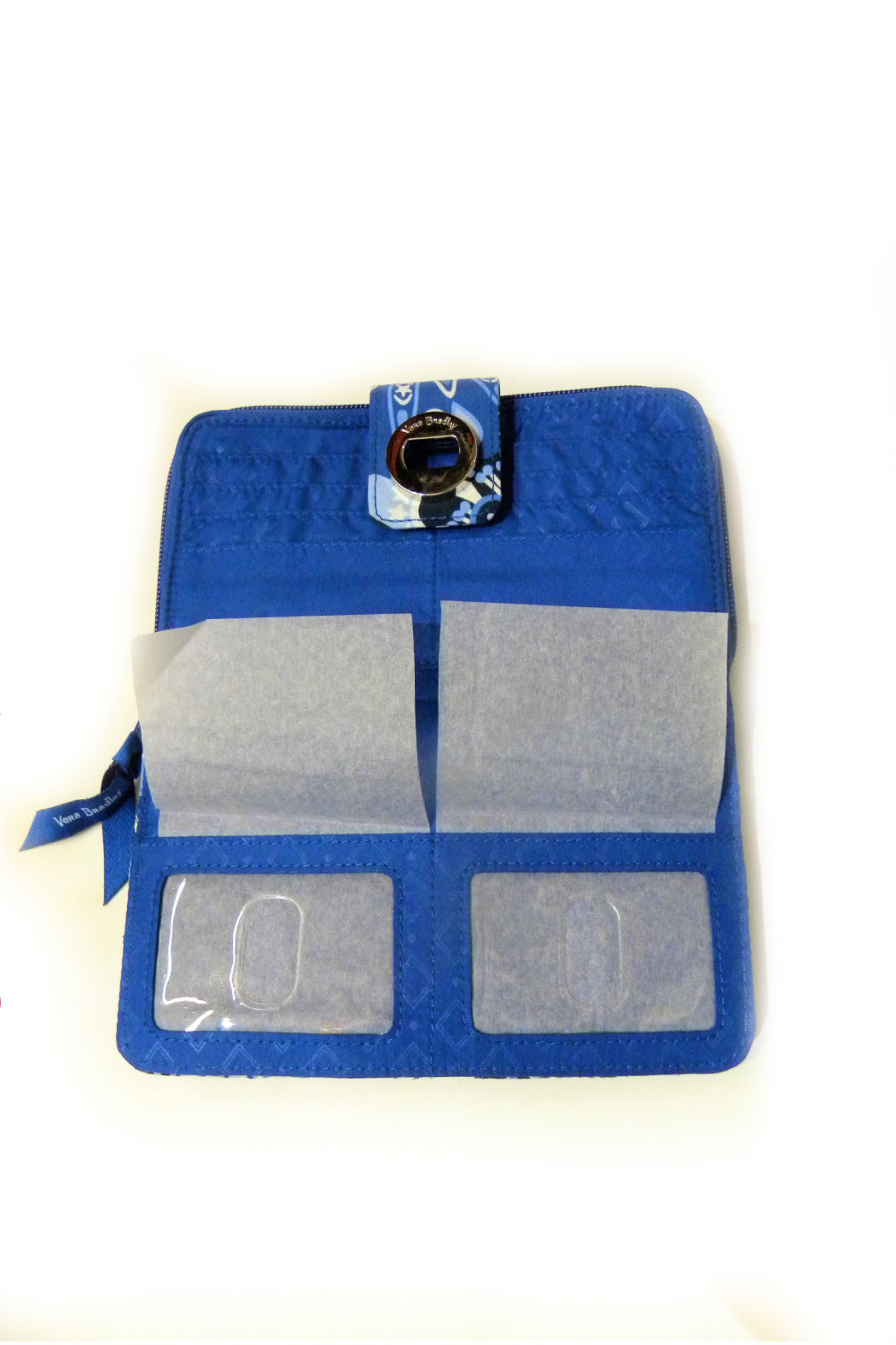 Here is the Vera Bradley RFID Turnlock Wallet in the "Blue Star Medallion" pattern. Add a little charm to your look with this fun wallet. It has 12 card slips, 3 areas for bills, and 2 ID windows. On the back of the wallet, there is a zippered coin pocket. In the large zip compartment, there is 1 bill slip, 2 pleated pockets, and 6 card slips. In the turnlock section, there are 2 ID windows, 6 card slips and 2 bill pockets, or you can slip your checkbook in here! It will even hold a cell phone up to 7". It even has RFID technology sewn right in to protect you from unwanted scans of your credit and debit cards. Silver tone hardware. Pattern placement will vary making each wallet unique. Click on "Mimi's Gift Gallery" to find other Blue Star Medallion bags and accessories.