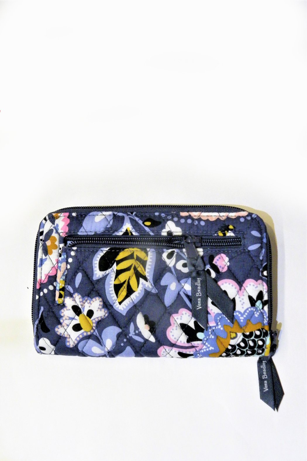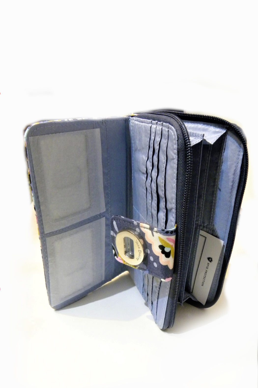 Here is the Vera Bradley RFID Turnlock Wallet in the "Charmont Meadow" pattern, basic, beautiful, it will add a lot of charm to your look. It has 12 card slips, 3 areas for bills, and 2 ID windows. On the back of the wallet, there is a zippered coin pouch. In the large zip compartment, there is 1 bill slip, 2 pleated pockets, and 6 card slips. In the turnlock section, there are 2 ID windows, 6 card slips and 2 bill pockets, or you can slip your checkbook in here! It provides RFID protection for credit and debit cards, and the zip-around closure adds extra security. It will even hold a cell phone up to 7". Silver tone hardware. Pattern placement will vary making each wallet unique. Find other bags and accessories in the this pattern on the "Mimi's Gift Gallery" boutique page.