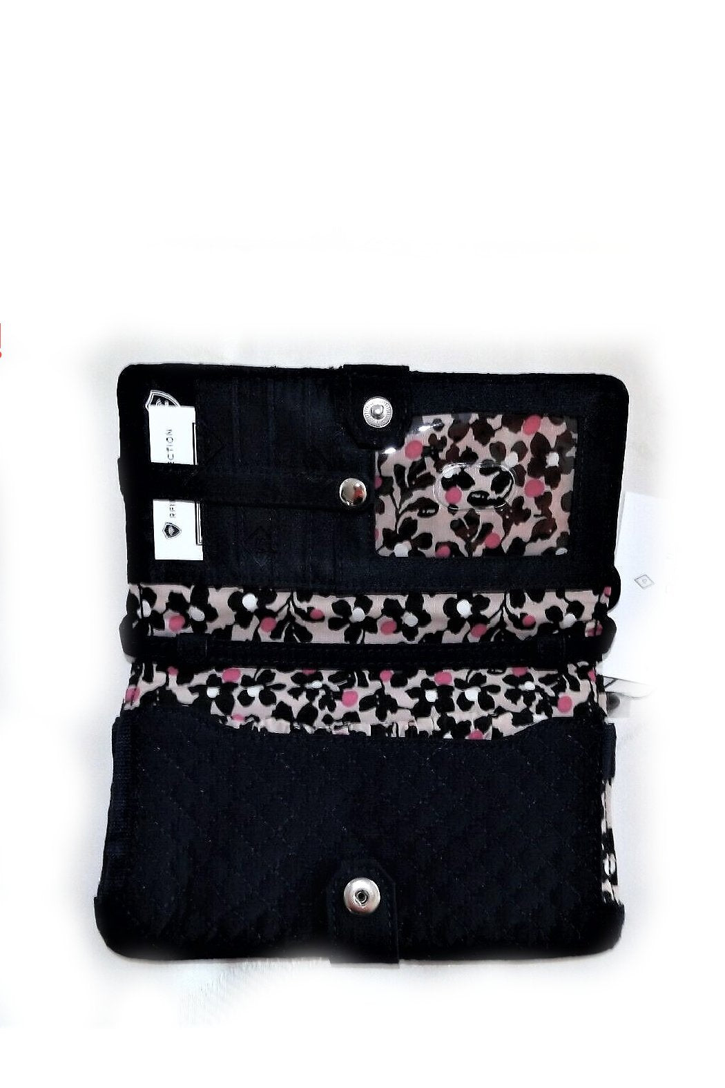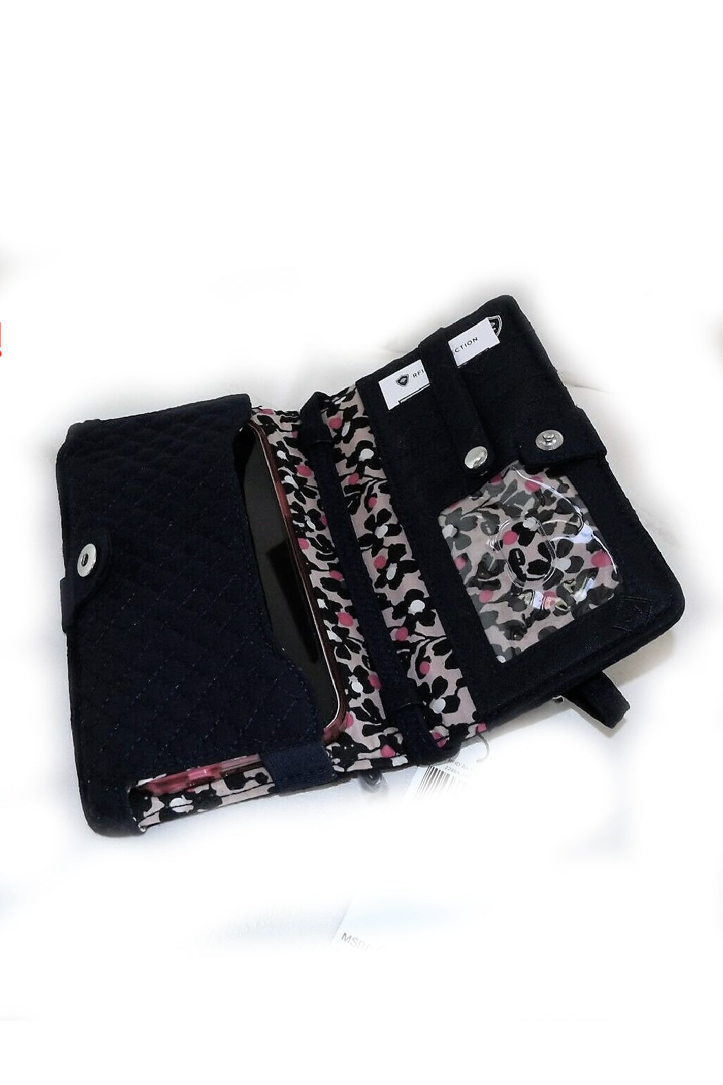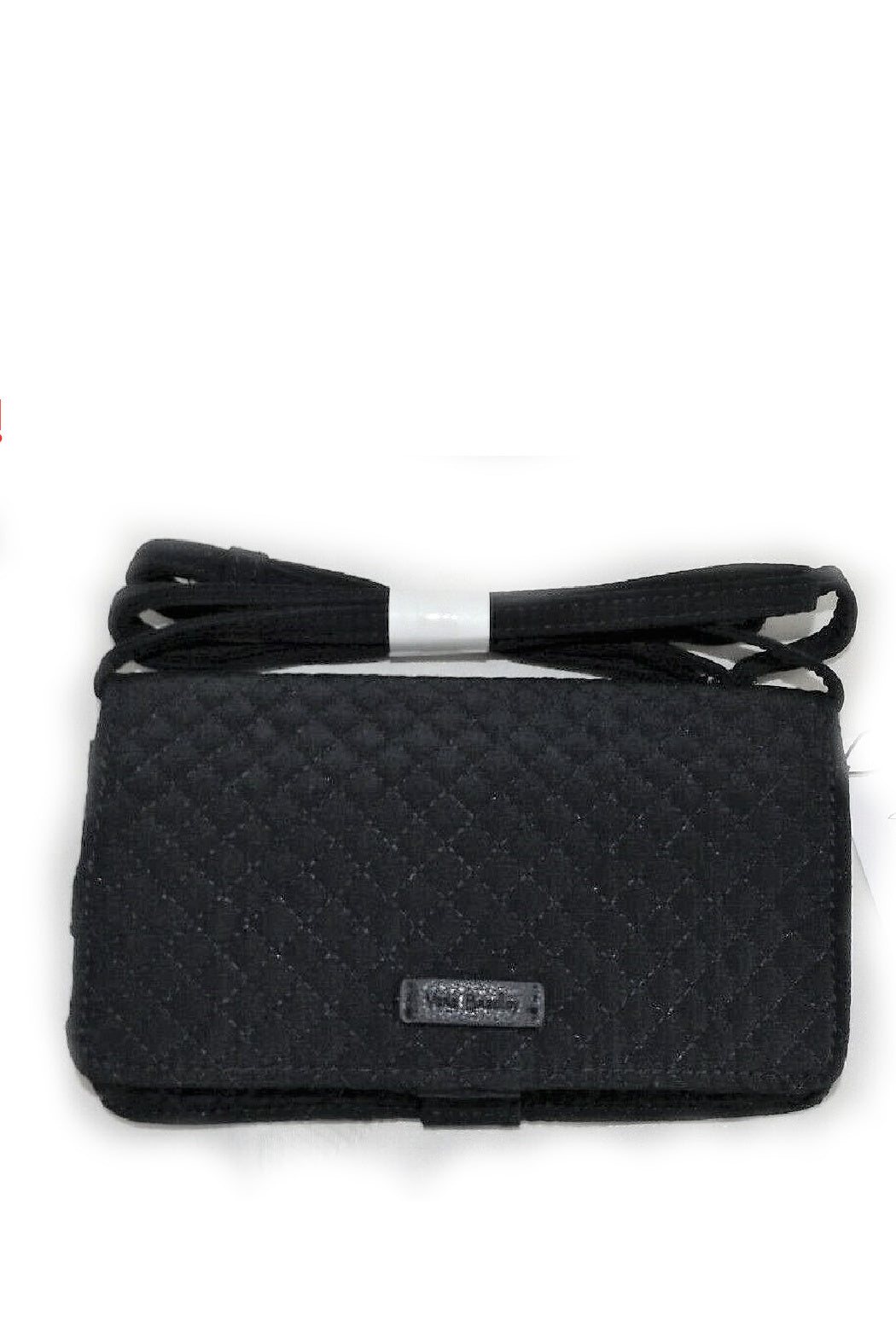 Here is the Vera Bradley Iconic RFID All Together Crossbody in the Classic Black color. Keep your look chic and carefree with all the essentials by your side with this little crossbody bag. Purse made of mini quilted cotton with coordinating printed poly satin lining and interior compartments. Pin snap on flap and zip back compartment closure. Removable, adjustable crossbody strap. Provides RFID protection for credit and debit cards. Interior includes one elastic slip pocket, an outer elastic compartment made for your phone (up to 6.5" long), an ID window and a bill pocket. Find other bags and accessories in the Classic Black color on the "Mimi's Gift Gallery" boutique page. Measurements: Width: 7 in., Depth:1-1/2 in., Height: 4-1/4 in. with a 67" removable adjustable crossbody/shoulder strap.