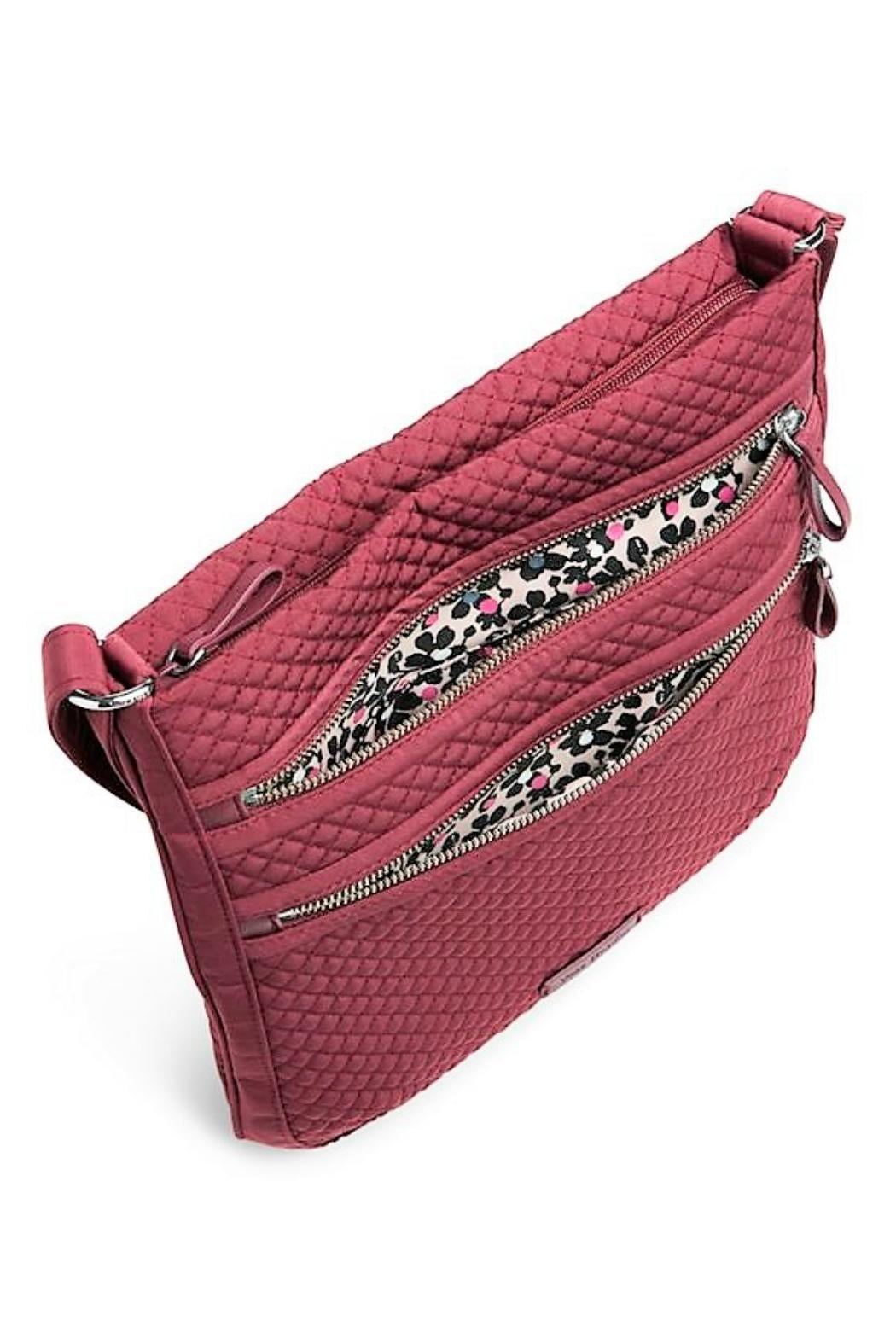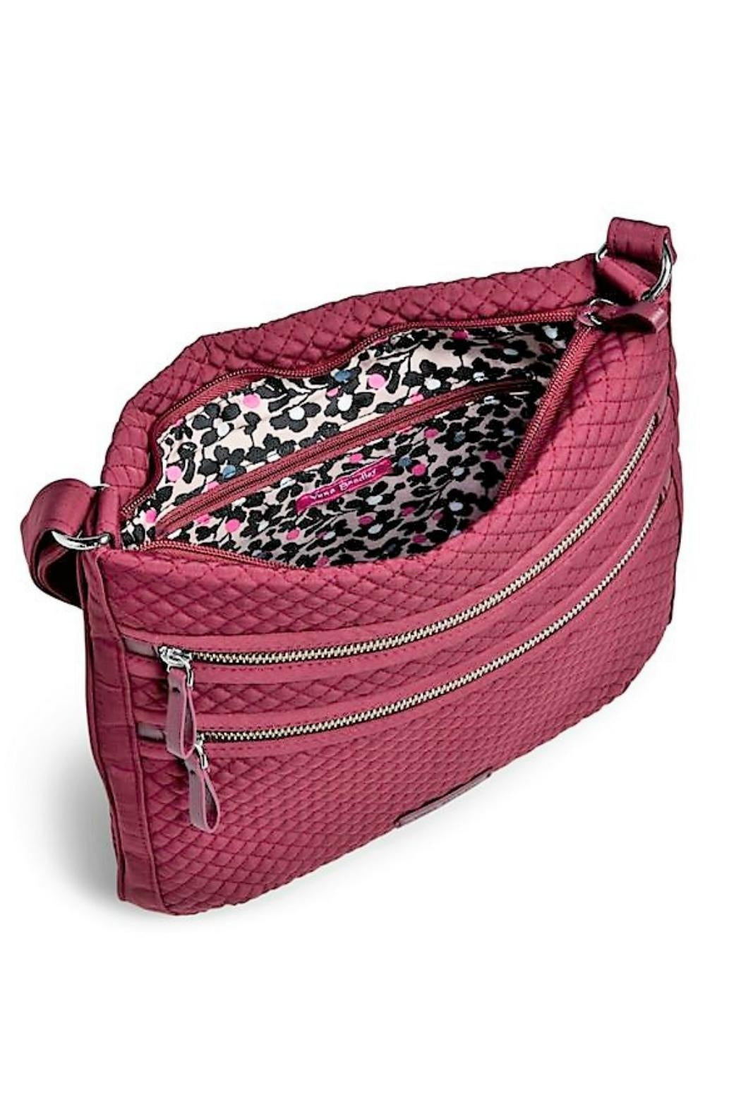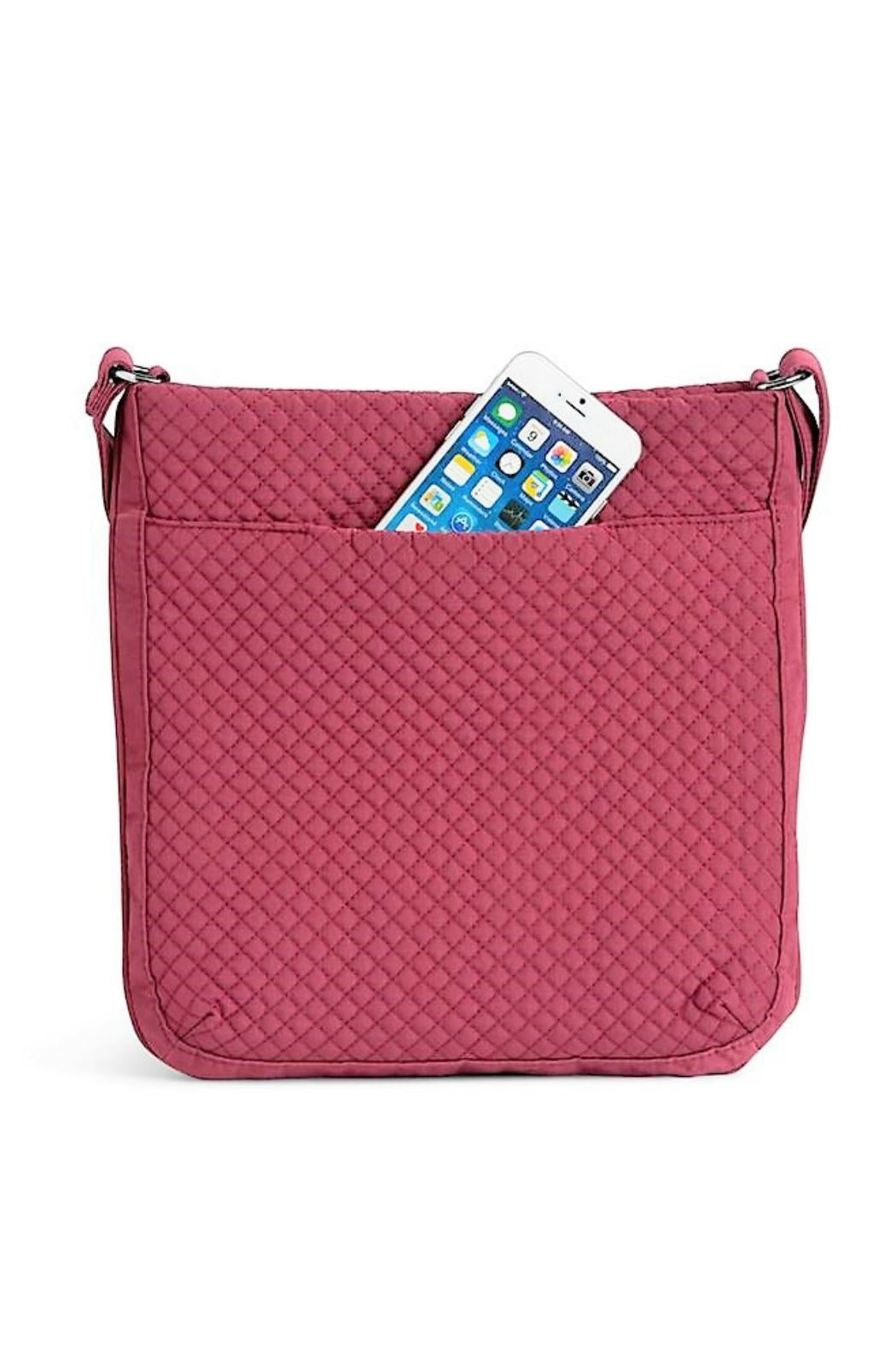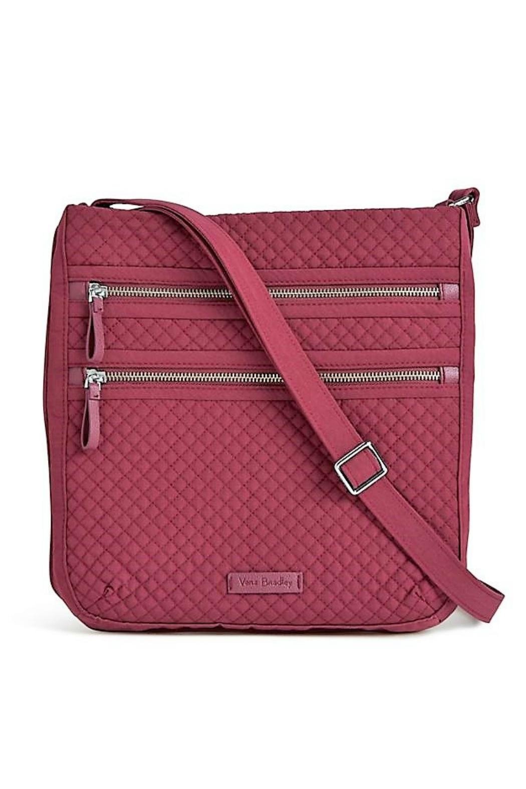 Meet the Vera Bradley Iconic Triple Zip Hipster in the color Vera Vera Hawthorn Rose. This "Iconic" crossbody has been refreshed with added functionality. The ultimate in hands-free organization, this clever crossbody features three separate zippered compartments. Mini Quilted Microfiber is lightweight, solid-colored polyester. Exterior features one slip (with a cell phone slip) and two zip pockets (upper zip compartment also contains two slip pockets). Interior features two slips and one zip pocket containing a charger pocket. Printed coordinating polyester lining. Zip closures with silver tone hardware. Find other accessories in the Hawthorn Rose color on the "Mimi's Gift Gallery" boutique page.