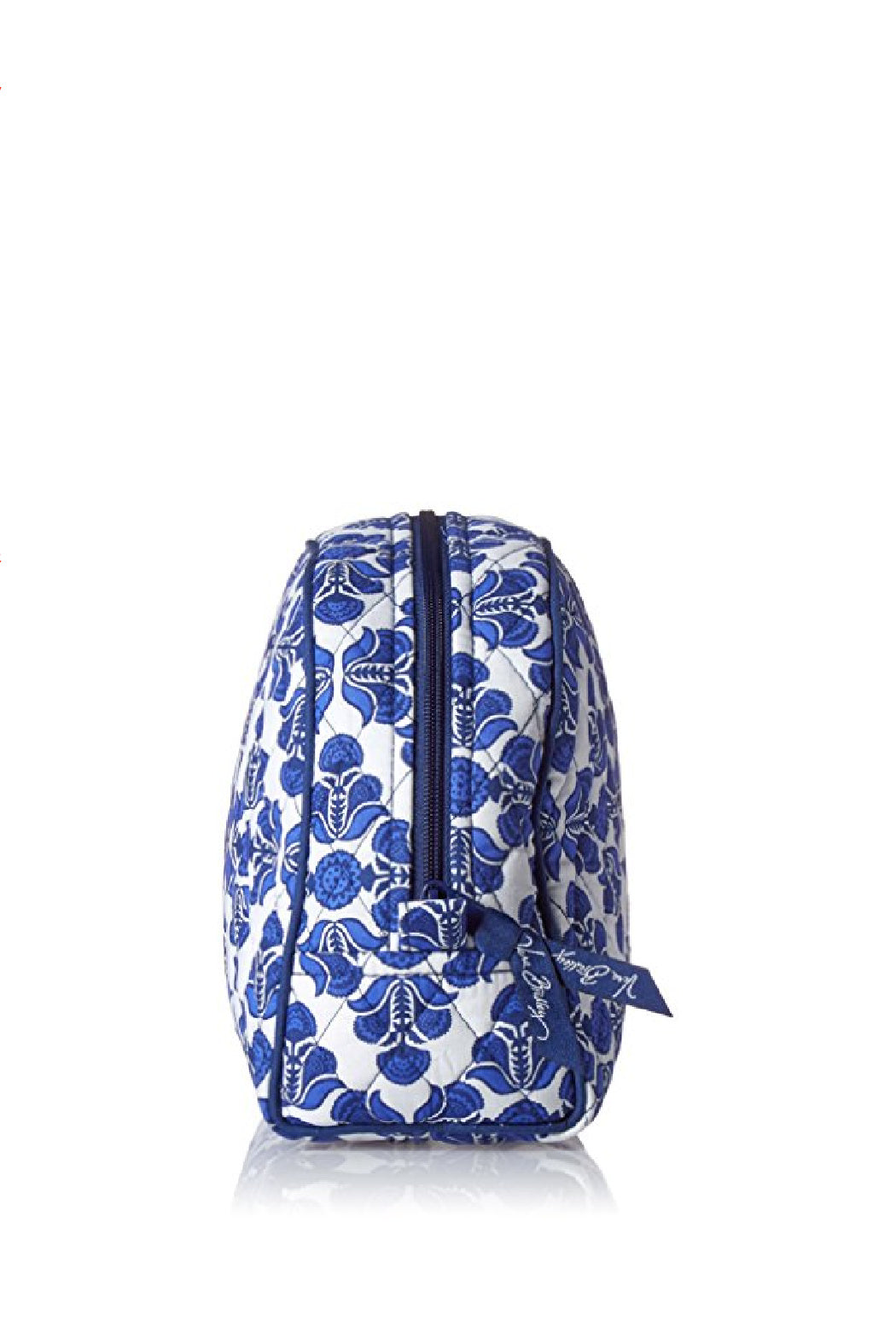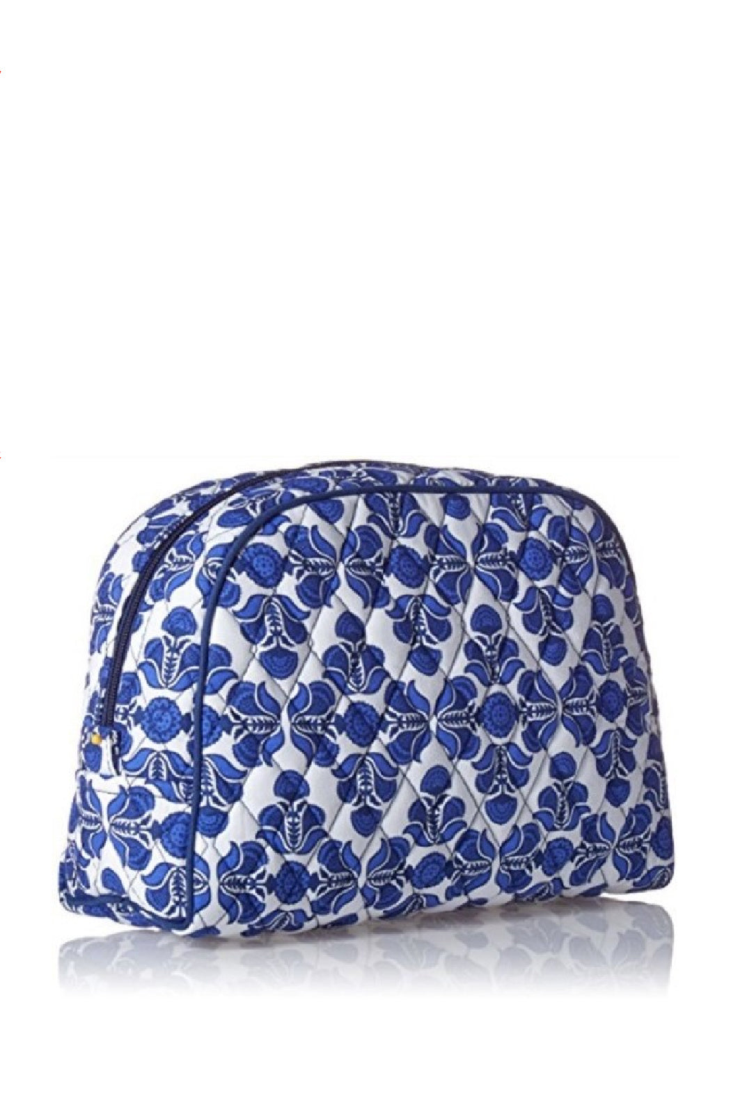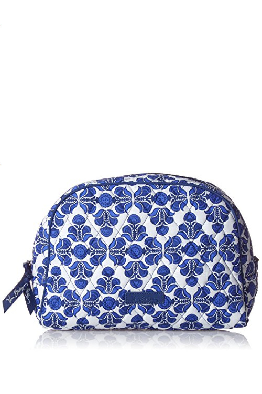 This is the Vera Bradley Large Zip Cosmetic Bag in the Cobalt Tile pattern. It is a specially made makeup bag that is lined with easy wipe vinyl to keep everything clean and stain free. The secure zip closure will keep all your cosmetics securely travel ready for quick and easy touch ups on the go. It is built to last, and this item is machine-washable and fade resistant to keep you fun and fashionable. Click on "Mimi's Gift Gallery" to find other bags and accessories in this pattern.