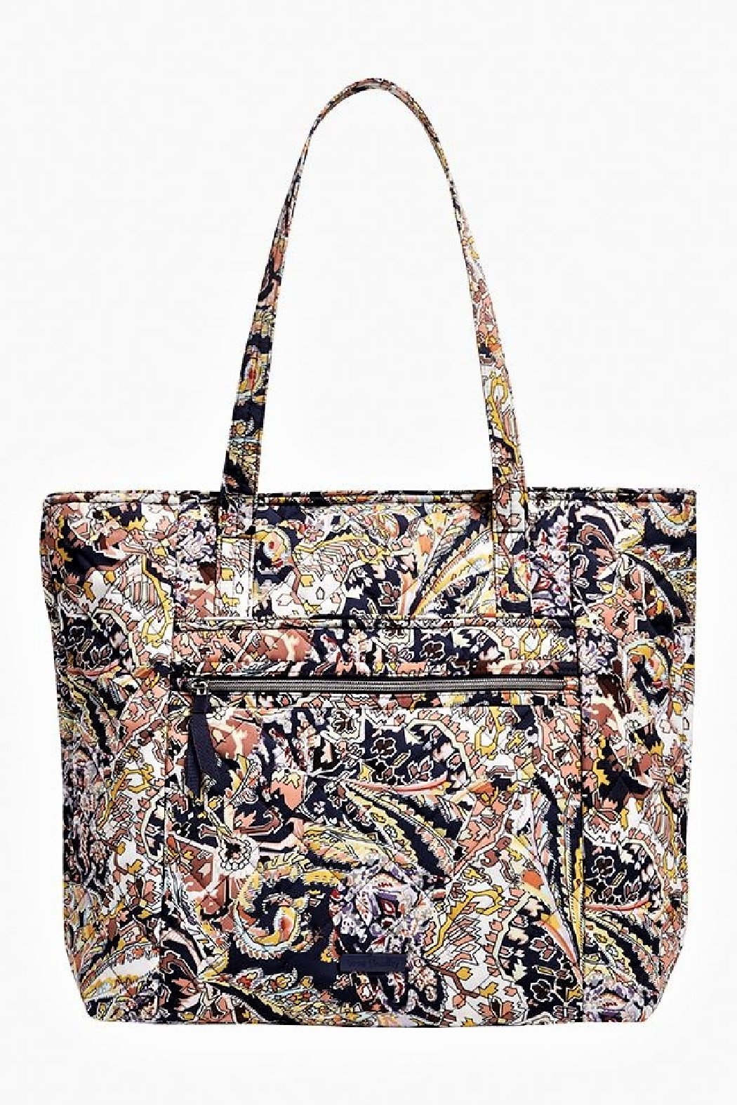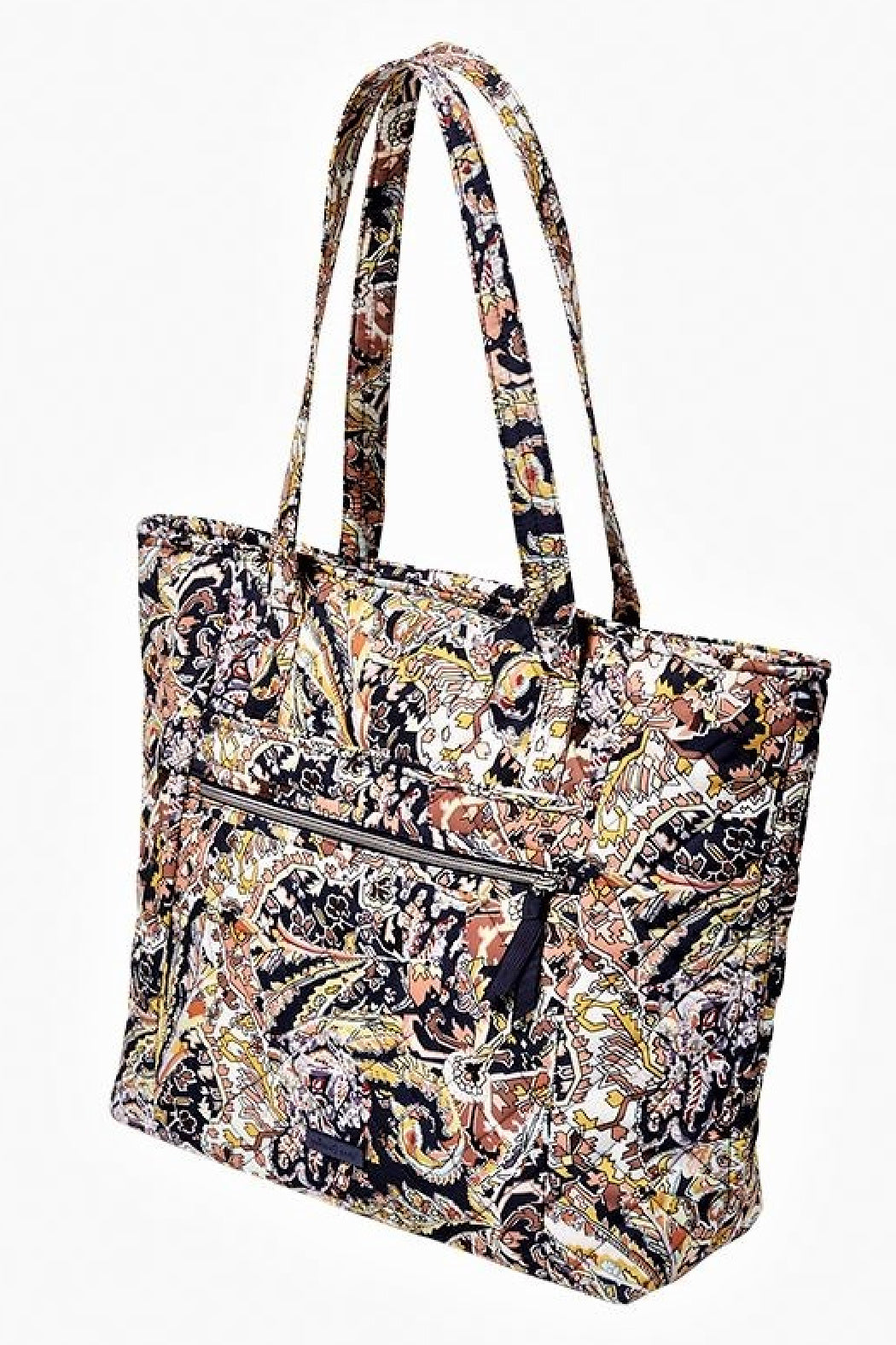 This is the Vera Bradley Vera Tote in the Performance Twill Tangier Paisley pattern. Vera has crafted the perfect size bag for your everyday needs that combines business and pleasure. With organization inside and out and style all over, this tote features a 12 inch strap drop so you can grab the dual straps on the go and throw over your shoulder to rest comfortably – then you're free to focus on conquering the day. This top zip quilted Vera Bradley® Iconic Performance Twill is made from quilted, sleek, lightweight, water-repellent polyester. Lined with charming coordinating printed polyester fabric, the interior of this spacious tote features six slip pockets that go all the way around the inside of the bag, and a hidden top pocket so you can keep your smaller essentials like keys or phone easy to access. Whether it's a weekend getaway or your daily commute, this bag is designed for every busy woman shuttling her essentials back and forth. When quality material meets precise craftsmanship, you get a bag made to last through all of life's journeys. They made the perfect air travel carry-on bag, designed for both functionality and fashion as you head toward the runway. Silver tone hardware. Care: Close all zippers before laundering, machine wash cold, gentle cycle, line dry. Find other Performance Twill bags and accessories in this pattern on the "Mimi's Gift Gallery" boutique page. Dimensions: 14.5 inches high, 15 inches wide, and 6 inches deep with 12 inch strap drop.
