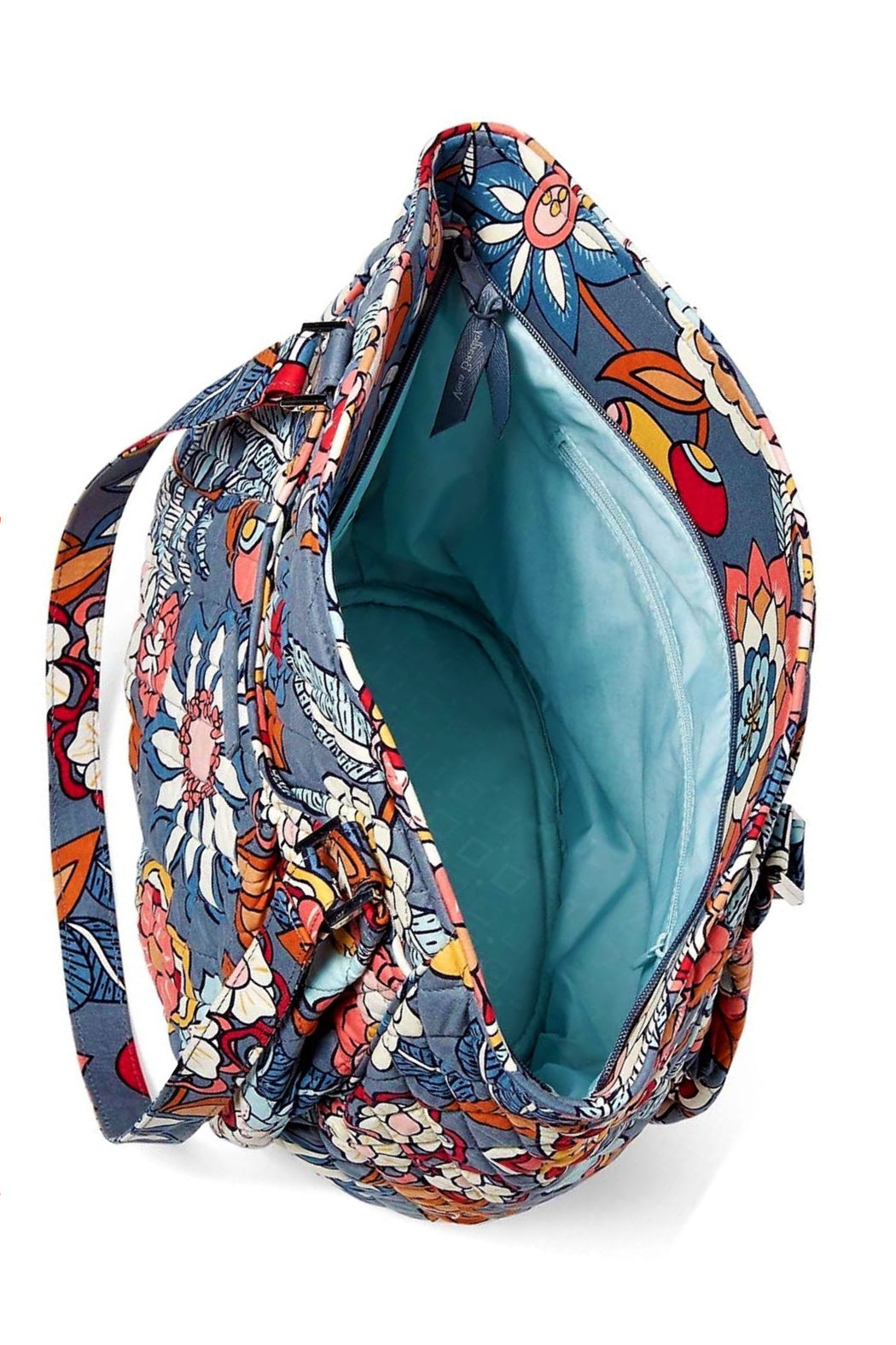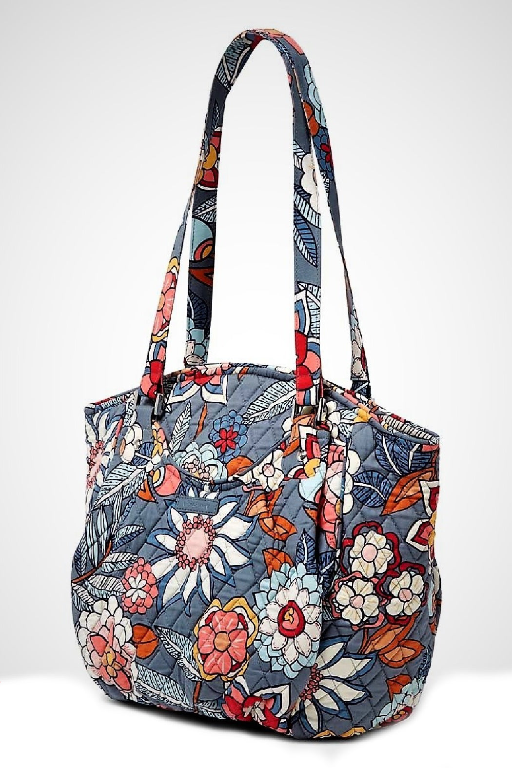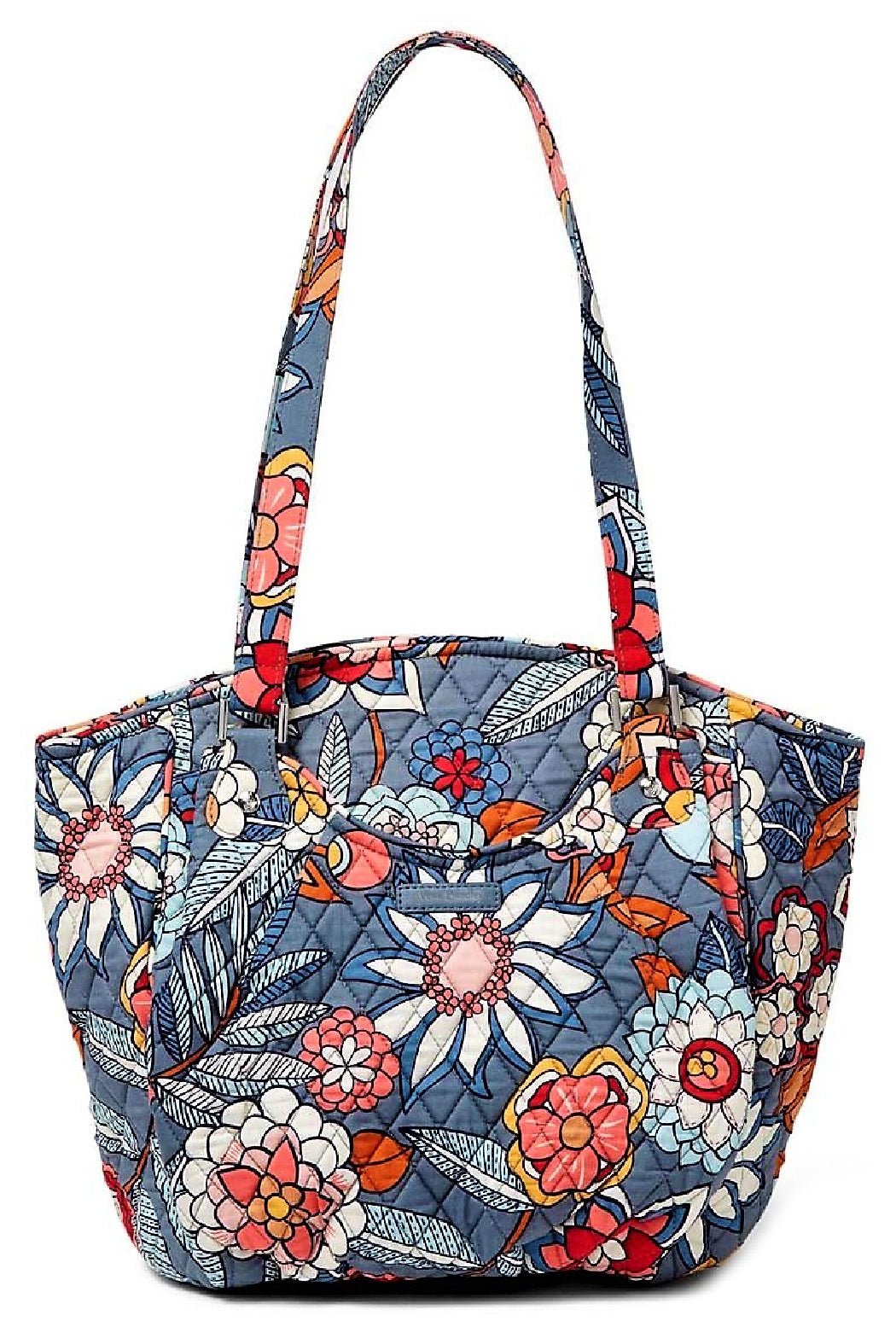 Here is the Vera Bradley Glenna in the Tropical Evening pattern. Carry the Glenna alongside your many adventures adding brightness, fun, and functionality wherever you go. Made of quilted, floral cotton fabric, with a beautiful signature coordinating poly satin lining on the inside. Dual shoulder straps and roomy exterior slip pockets on both sides. Flat bottom with recessed top-zip closure and silver tone hardware. Interior features back-wall zip pocket and three multifunctional slip pockets. Click "Mimi's Gift Gallery" on this page to find other bags and accessories in this pattern.